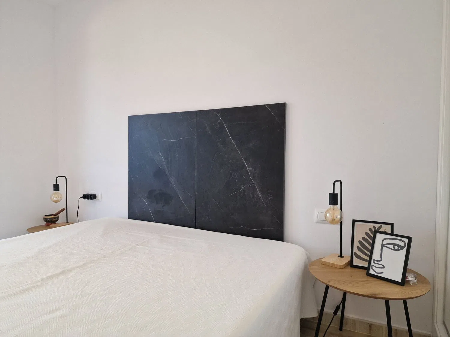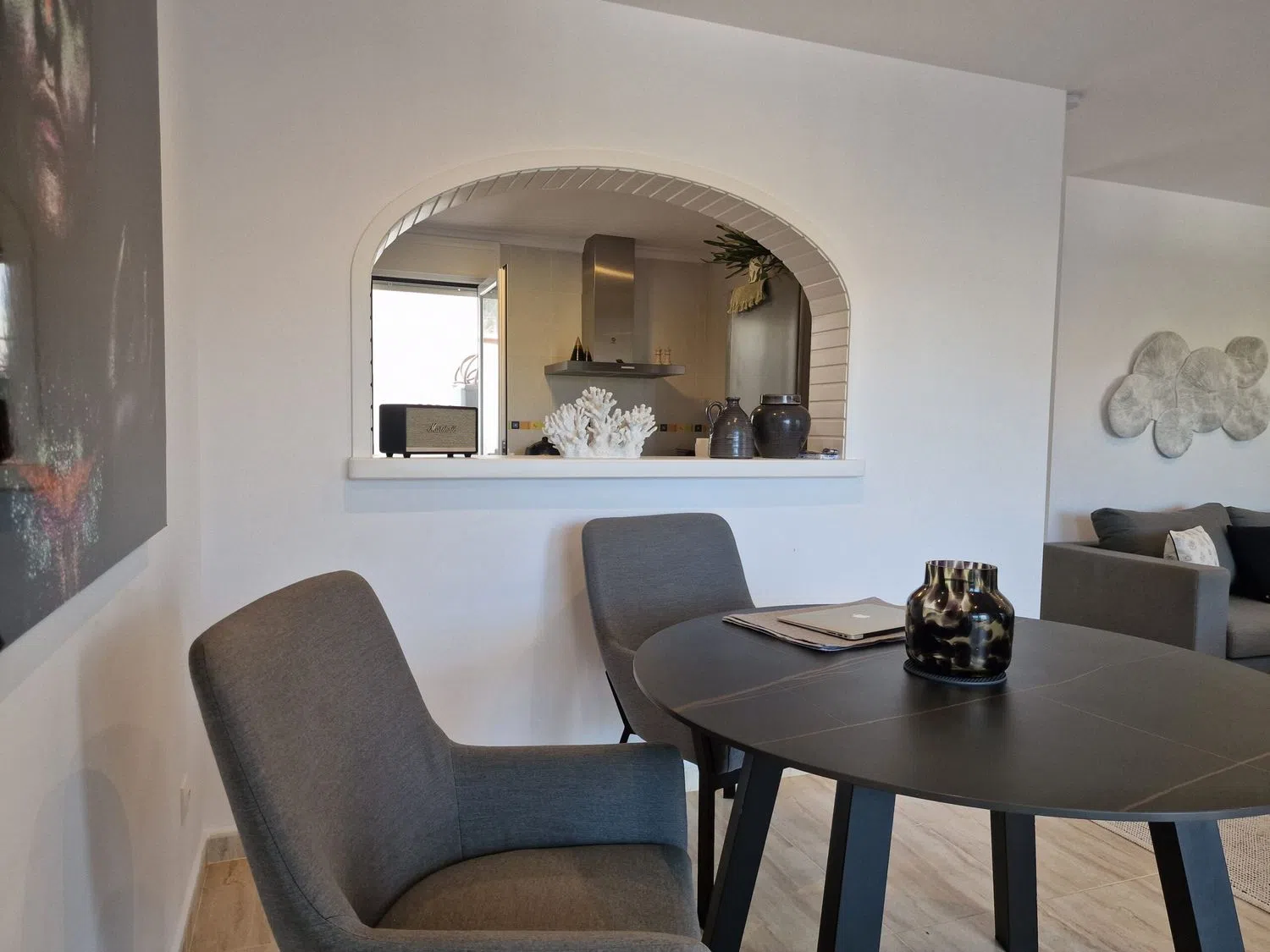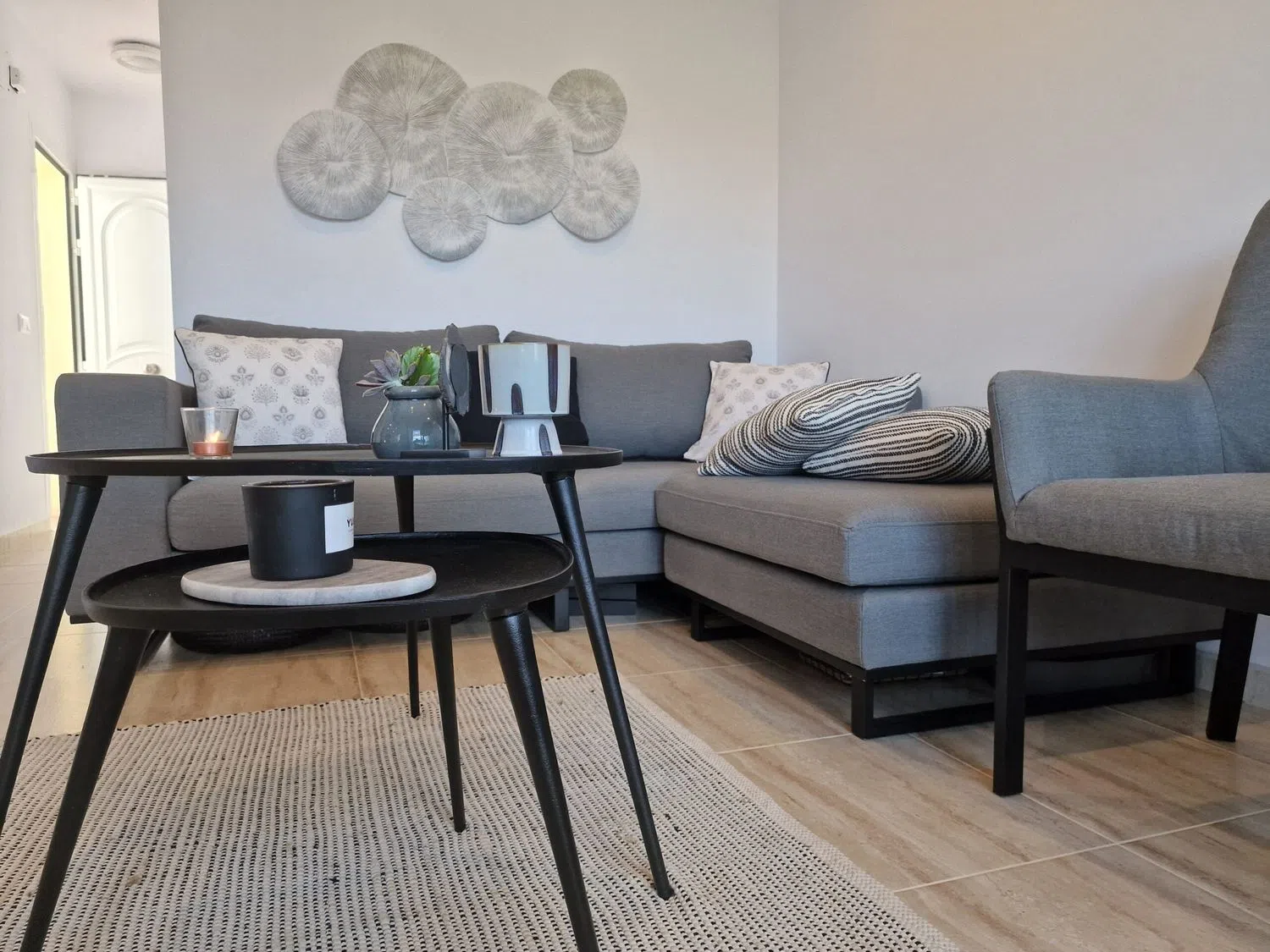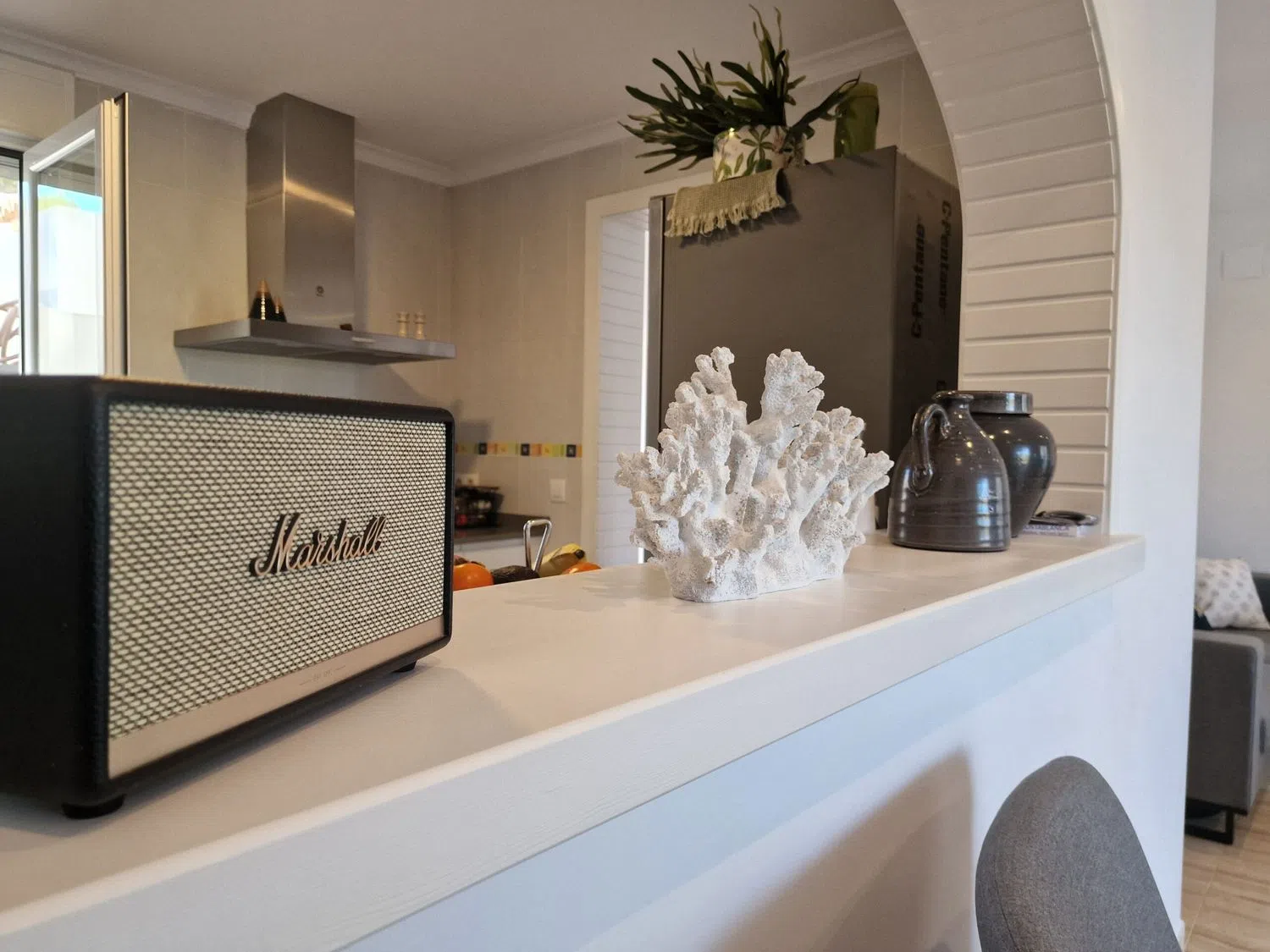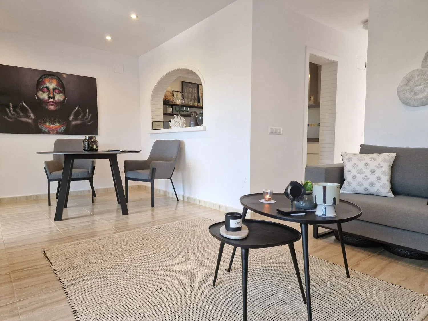 En la planta superior, hay dos acogedores dormitorios que comparten un baño y una terraza adicional que también ofrece vistas encantadoras. Los espacios están equipados con aire acondicionado para garantizar el confort durante todo el año. Además, los residentes tienen acceso a una piscina compartida entre las cuatro viviendas del bloque, perfecta para refrescarse en los días soleados.