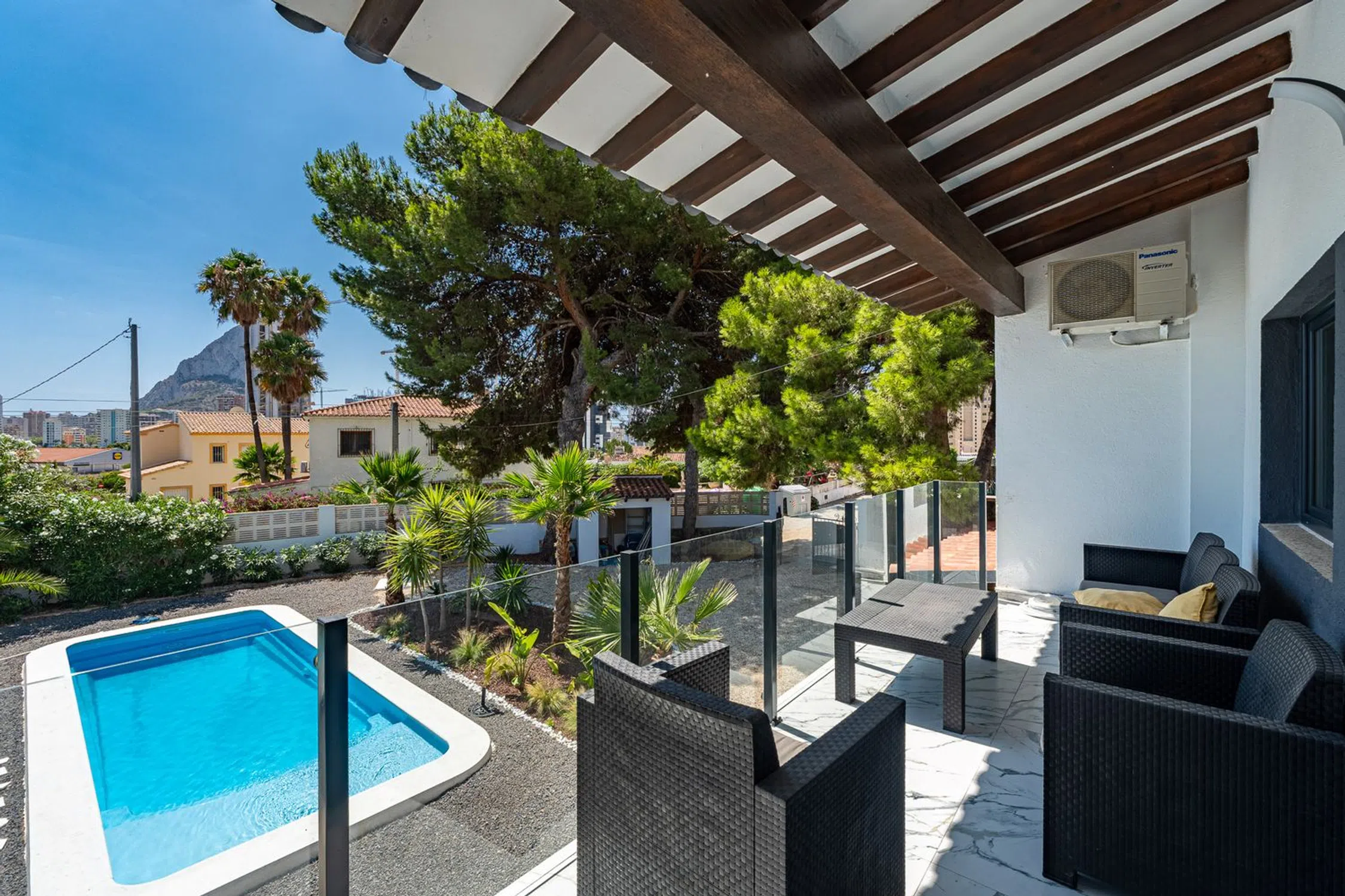 Villa Renovada de 5 Habitaciones en Calpe con Comodidad Moderna y Encanto Mediterráneo Esta hermosa villa renovada en Calpe combina un espacio generoso, comodidad moderna y un estilo mediterráneo atemporal. Situada en una parcela de 750 m² orientada al sur, la propiedad ofrece 282 m² de área construída y 232 m² de espacio habitable útil distribuidos en dos plantas. Originalmente construida en 1975, la villa ha sido cuidadosamente actualizada a los más altos estándares, combinando diseño contemporáneo con carácter mediterráneo. En su interior, cuenta con cinco dormitorios y tres baños, lo que la hace ideal para familias, vivienda vacacional o como inversión de alquiler en la Costa Blanca. Los interiores luminosos y espaciosos incluyen áreas de estar acogedoras, una cocina completamente equipada y grandes ventanales que conectan a la perfección con terrazas soleadas y espacios exteriores. Cada dormitorio está diseñado para el confort y la privacidad, mientras que los baños presentan acabados elegantes y accesorios modernos. En el exterior, la villa ofrece una piscina privada, jardín paisajístico y múltiples terrazas, perfectas para relajarse o entretener. Otras características incluyen aire acondicionado y estacionamiento. La propiedad se ofrece sin amueblar, lo que le da la libertad de personalizarla a su gusto. Ubicada a poca distancia de las playas, restaurantes y el centro de Calpe, esta villa presenta una oportunidad excepcional para disfrutar de la vida mediterránea en su máxima expresión. Distancias: Playa: 1.5 kmAeropuerto de Alicante: 70 kmAeropuerto de Valencia: 130 km.