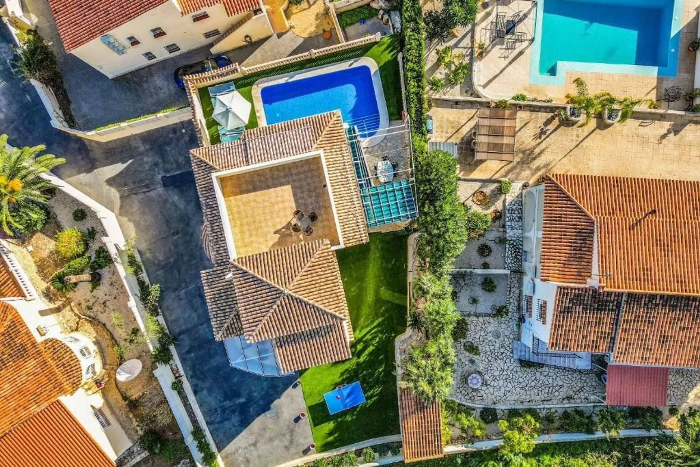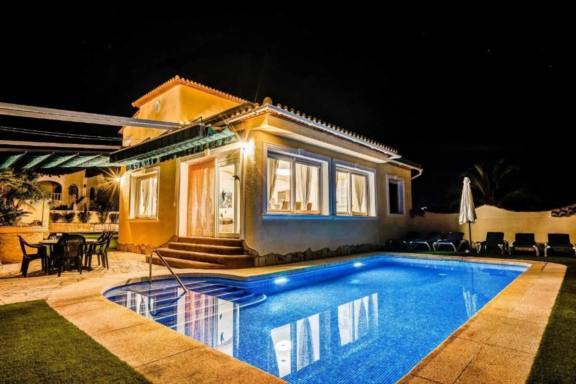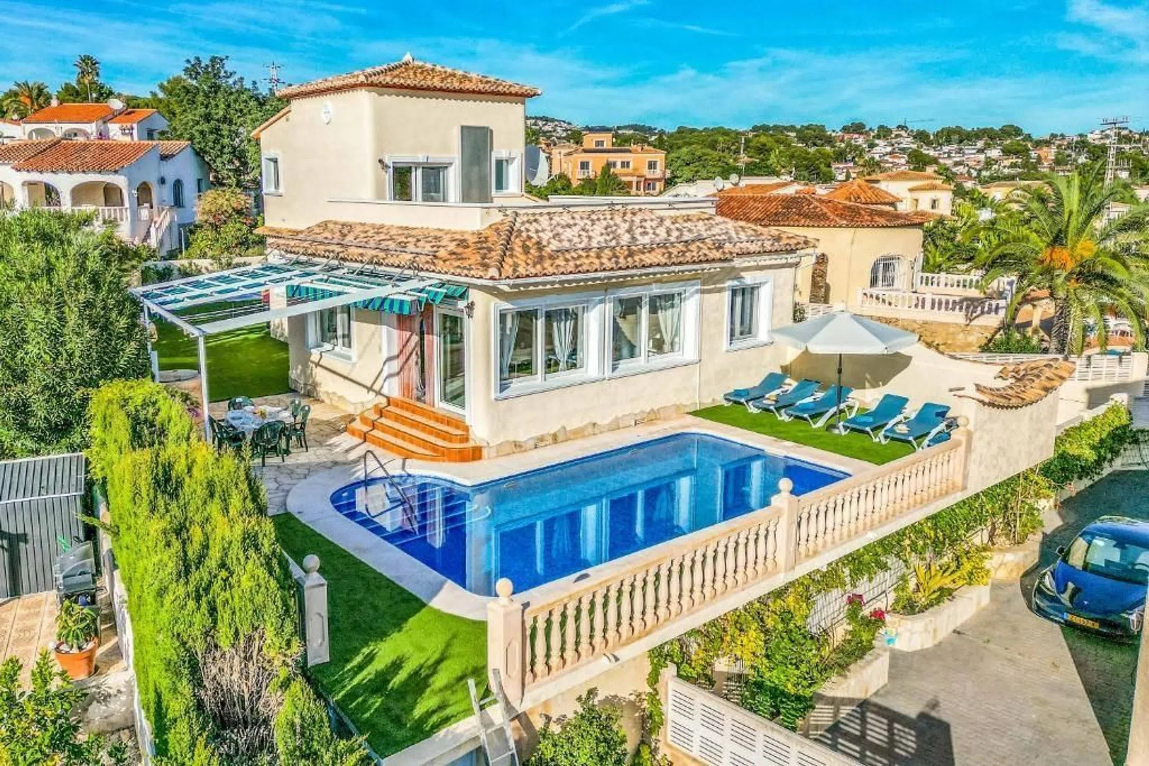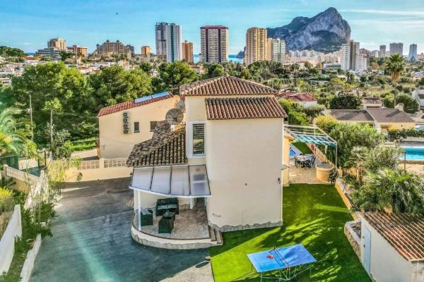 Villa de 3 dormitorios consta: En la planta baja encontramos un amplio salón comedor con cocina abierta contigua, 2 dormitorios y 1 baño con un pasillo. Una escalera interior conduce a la planta superior. Aquí encontramos el dormitorio principal con baño en suite y una gran terraza privada con vistas a la roca de Calpe. La villa es definitivamente cómoda con aire acondicionado frío/calor, una cocina bien equipada, doble acristalamiento e incluso su propio pozo, registrado oficialmente. Desde el salón, unos pocos escalones le llevan al césped con piscina. Si hace demasiado calor al sol, hay un toldo retráctil a modo de toldo que proporciona una zona de sombra de unos 30 m2. El jardín es fácil de mantener, ya que está compuesto en su mayor parte por césped artificial. El sótano tiene su propio acceso y en este nivel encontramos un garaje para 1 vehículo y 2 trasteros. Esta villa mediterránea se encuentra en una calle sin salida en el barrio de Costeres. Maravillosamente tranquilo pero cerca de la playa, tiendas, restaurantes, etc. La larga playa de arena La Fossa con su acogedor paseo marítimo está a 1,2 km, por lo que se puede ir andando o en bicicleta a la playa. La propiedad está orientada al sur, lo que garantiza una buena posición para tomar el sol. La vista está dominada por la roca de Calpe y algunas vistas al mar aquí y allá. [IW].