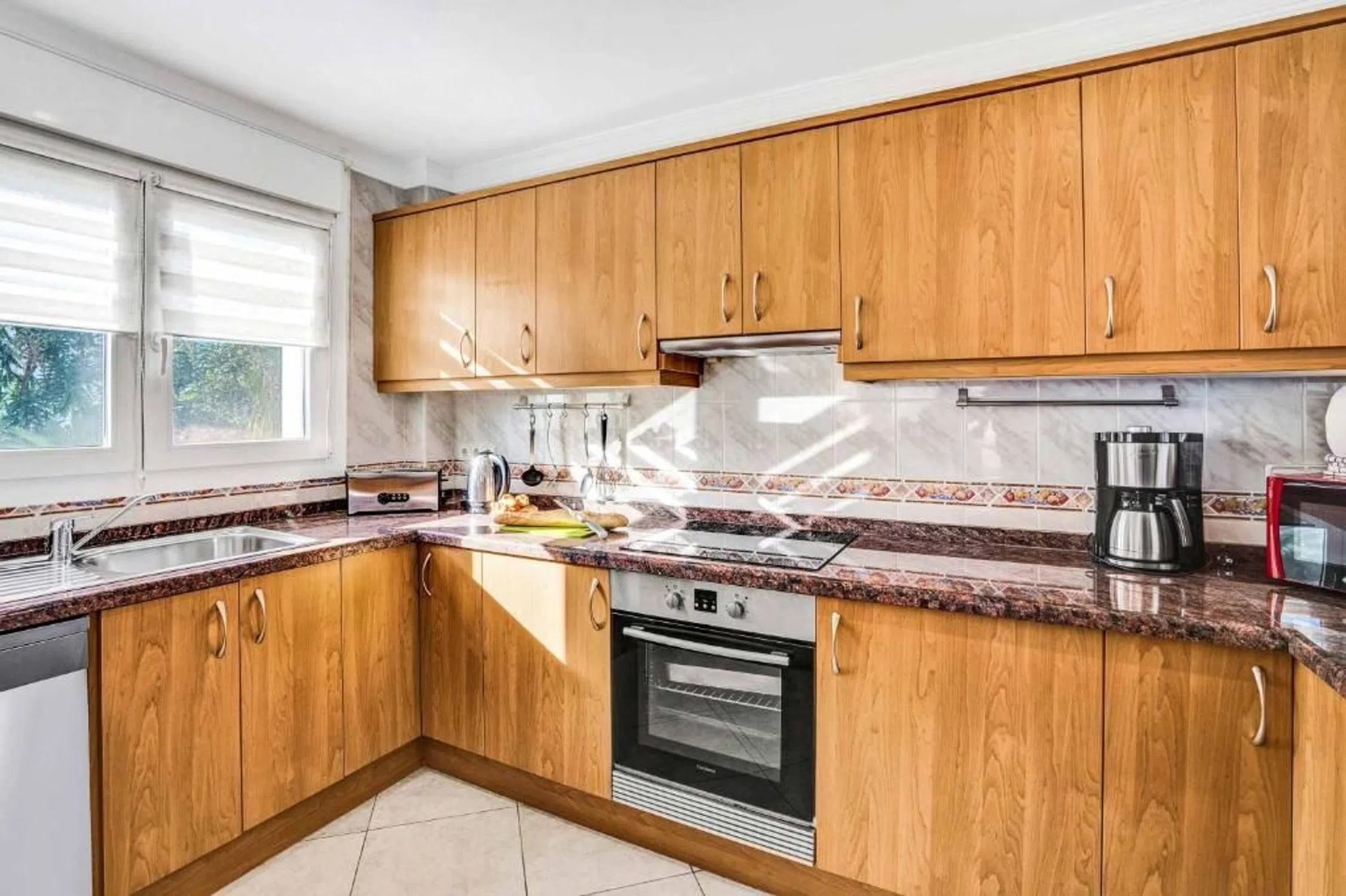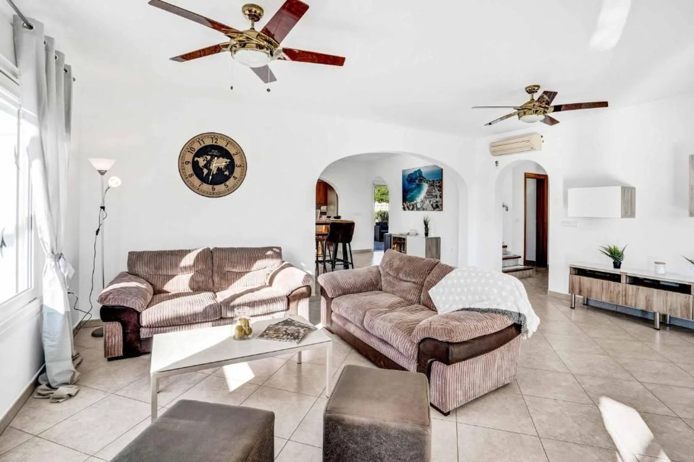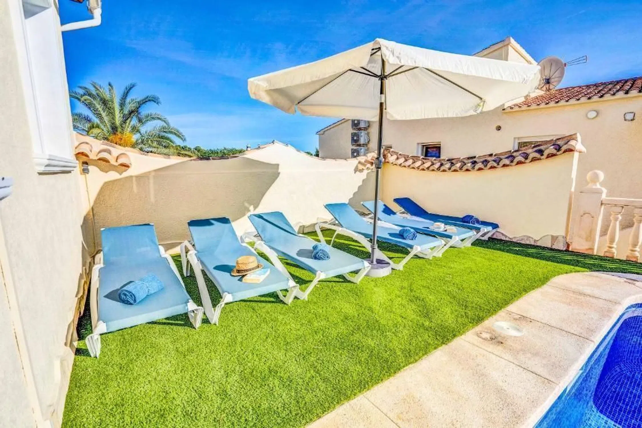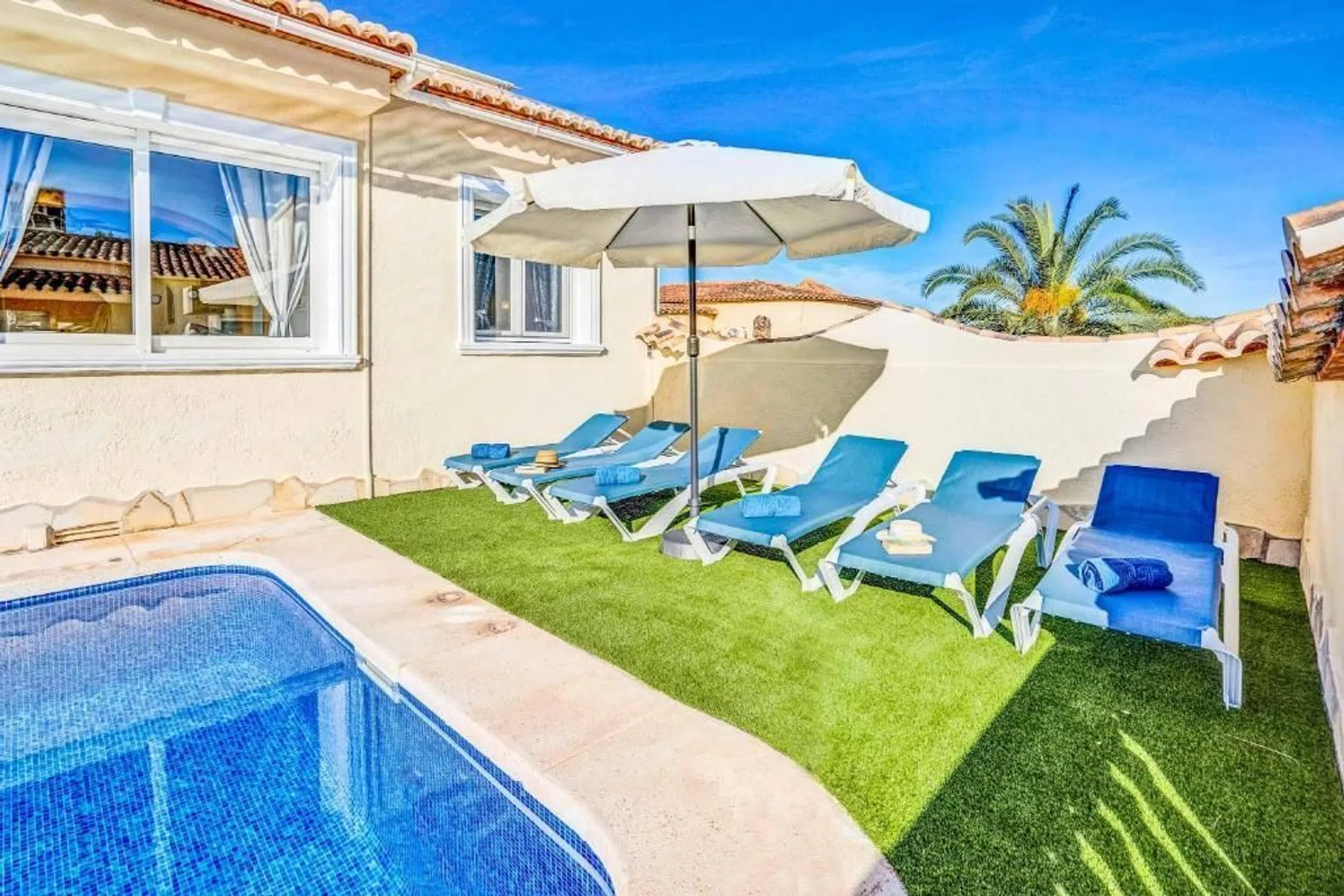 Villa de 3 dormitorios consta: En la planta baja encontramos un amplio salón comedor con cocina abierta contigua, 2 dormitorios y 1 baño con un pasillo. Una escalera interior conduce a la planta superior. Aquí encontramos el dormitorio principal con baño en suite y una gran terraza privada con vistas a la roca de Calpe. La villa es definitivamente cómoda con aire acondicionado frío/calor, una cocina bien equipada, doble acristalamiento e incluso su propio pozo, registrado oficialmente. Desde el salón, unos pocos escalones le llevan al césped con piscina. Si hace demasiado calor al sol, hay un toldo retráctil a modo de toldo que proporciona una zona de sombra de unos 30 m2. El jardín es fácil de mantener, ya que está compuesto en su mayor parte por césped artificial. El sótano tiene su propio acceso y en este nivel encontramos un garaje para 1 vehículo y 2 trasteros. Esta villa mediterránea se encuentra en una calle sin salida en el barrio de Costeres. Maravillosamente tranquilo pero cerca de la playa, tiendas, restaurantes, etc. La larga playa de arena La Fossa con su acogedor paseo marítimo está a 1,2 km, por lo que se puede ir andando o en bicicleta a la playa. La propiedad está orientada al sur, lo que garantiza una buena posición para tomar el sol. La vista está dominada por la roca de Calpe y algunas vistas al mar aquí y allá. [IW].