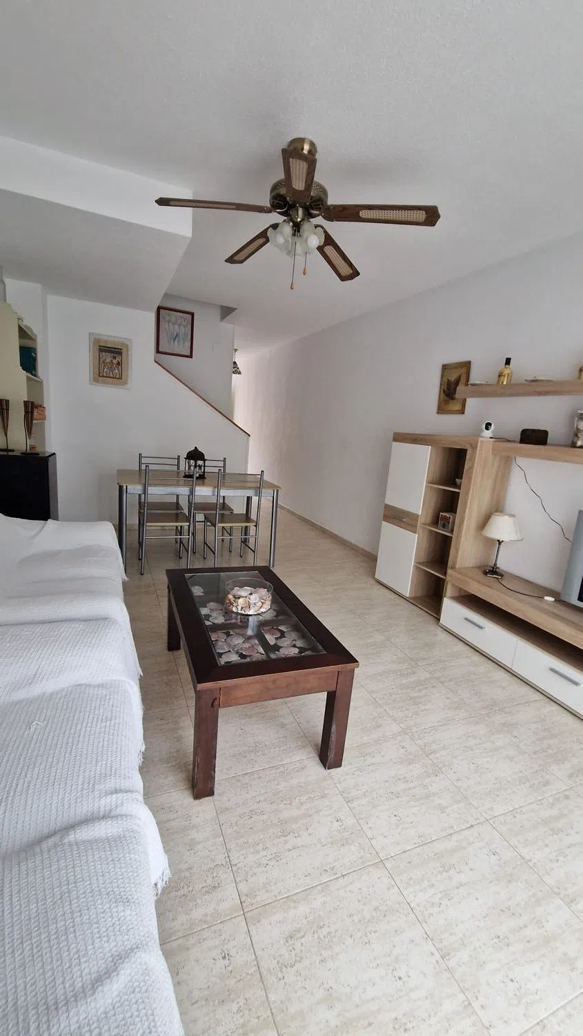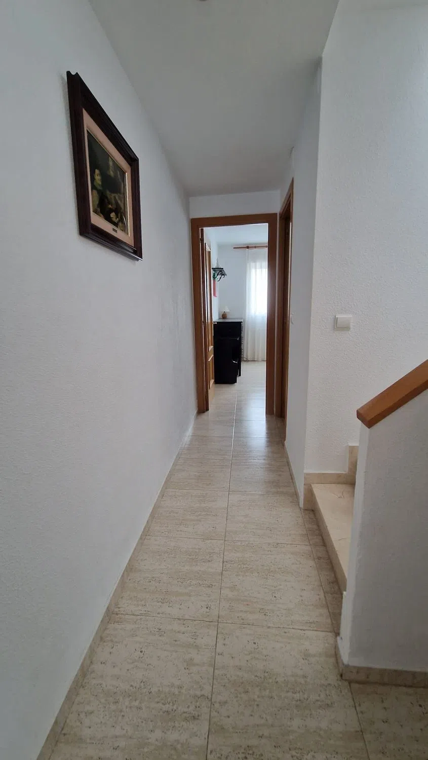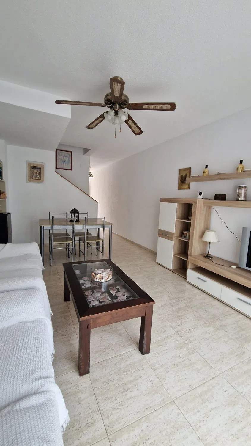 Adosado de tres plantas en Campello, ubicado en una urbanización privada, con jardines, zona infantil y dos piscinas comunitarias. Con servicios (comercios, restaurantes, etc. ). Y a 500 metros de la línea de Playa, Cala Almadraba y a un kilometro de la Playa de Campello. Buena conexión por carreteras con Alicante, a 16 km de distancia. La vivienda de 105 m2 distribuida por plantas: En la planta baja, un salón – comedor con salida a una terraza porche, una cocina independiente totalmente equipada y un aseo de cortesía. La primera planta dispone de dos dormitorios dobles con armarios empotrados y un baño completo con bañera. La última planta, ideal para invitados, ofrece un dormitorio con armario y una cama nido con mueble que da paso a una terraza grande que ofrece vistas despejadas a las montañas y un poco al mar. Con dos patios con dos orientaciones diferentes (uno de ellos puede ser usada como parking privado).