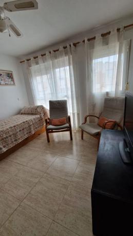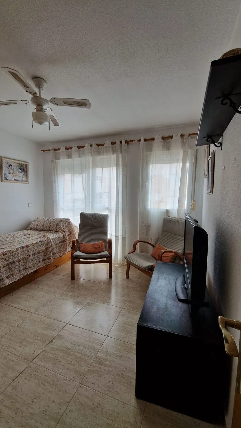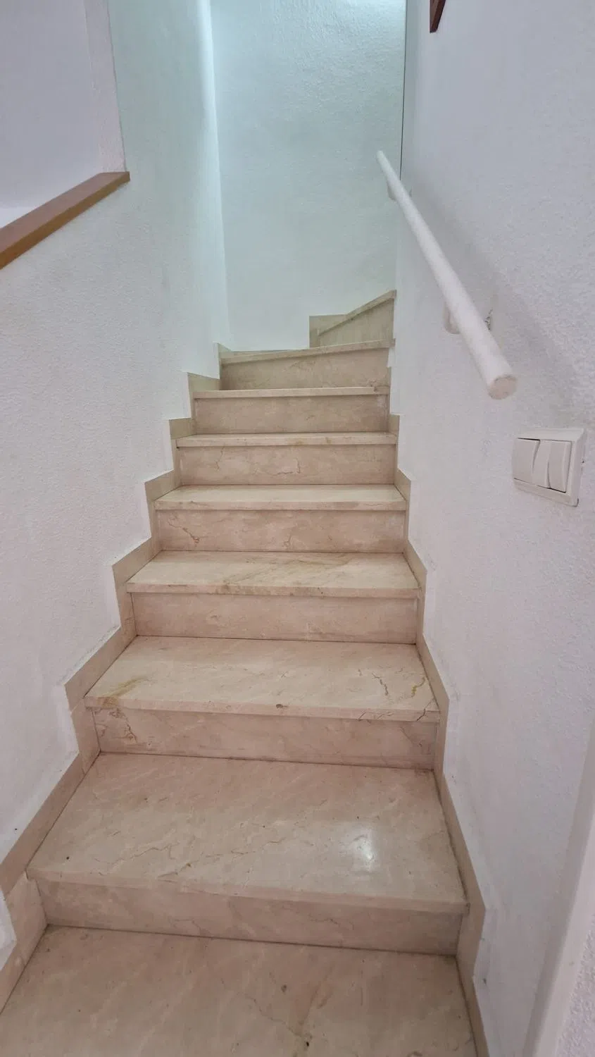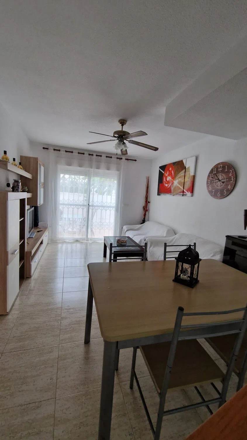 Adosado de tres plantas en Campello, ubicado en una urbanización privada, con jardines, zona infantil y dos piscinas comunitarias. Con servicios (comercios, restaurantes, etc. ). Y a 500 metros de la línea de Playa, Cala Almadraba y a un kilometro de la Playa de Campello. Buena conexión por carreteras con Alicante, a 16 km de distancia. La vivienda de 105 m2 distribuida por plantas: En la planta baja, un salón – comedor con salida a una terraza porche, una cocina independiente totalmente equipada y un aseo de cortesía. La primera planta dispone de dos dormitorios dobles con armarios empotrados y un baño completo con bañera. La última planta, ideal para invitados, ofrece un dormitorio con armario y una cama nido con mueble que da paso a una terraza grande que ofrece vistas despejadas a las montañas y un poco al mar. Con dos patios con dos orientaciones diferentes (uno de ellos puede ser usada como parking privado).