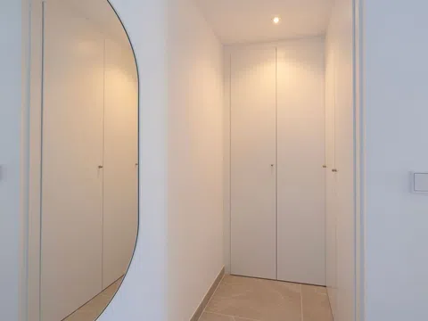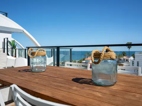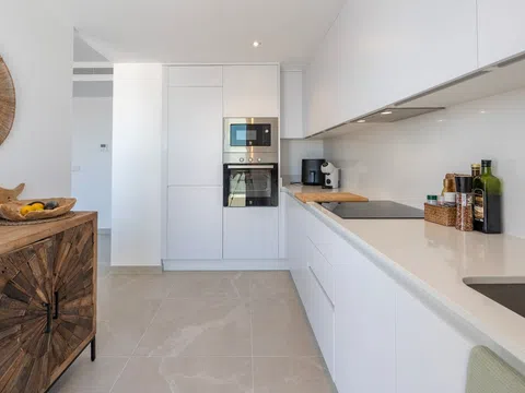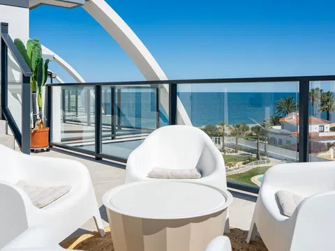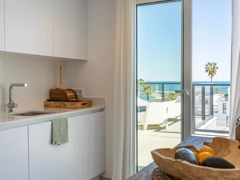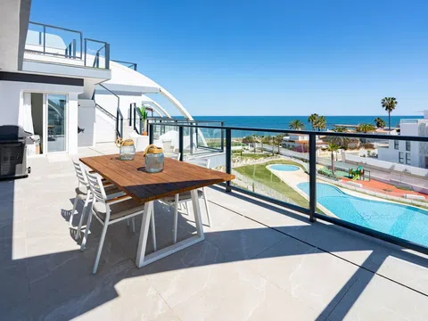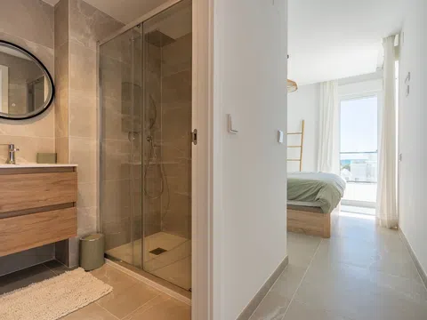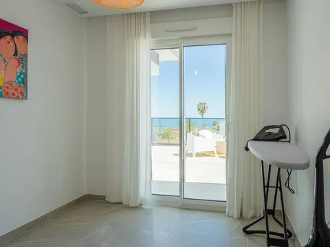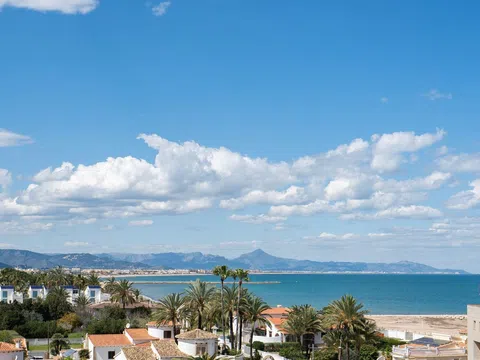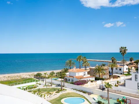 Fantástico ático de lujo con vistas panorámicas al mar, en primera línea de la playa de arena de Playa de la Almadraba, situado en el moderno complejo de Taylor Wimpey Bella Beach. Este exclusivo ático tiene impresionantes vistas al mar desde todas las habitaciones y también cuenta con una terraza en la azotea de nada menos que 94,85 m2 donde se puede disfrutar de espectaculares vistas de 360°. Al este, la costa se extiende hasta Gandía, al oeste las torres de la montaña del Montgó, al norte se ve directamente el mar y al sur tiene vistas a la impresionante Sierra de Segaria. Con una superficie útil de 84,90 m2 y una terraza de 51,46 m2 en la misma planta, este ático ofrece espacio y comodidad. Se accede a un elegante vestíbulo con un amplio dormitorio doble a la izquierda y un cuarto de baño a la derecha. El vestíbulo conduce a una sala de estar, donde la espectacular vista al mar llama inmediatamente la atención y donde las ventanas correderas dan acceso a la terraza. La moderna cocina, totalmente equipada, se encuentra junto al salón y también tiene acceso directo a la terraza. Más adelante en el pasillo hay un segundo dormitorio doble con conexión a la terraza y al final del pasillo está el dormitorio principal con baño en-suite, vestidor y también acceso directo a la terraza. El ático dispone de aire acondicionado para calefacción y refrigeración y todas las ventanas están equipadas con persianas eléctricas. Se vende completamente amueblado, lo que le permite mudarse inmediatamente. En la terraza también hay un práctico trastero y un armario empotrado con lavadora. Además, dispondrá de una plaza de aparcamiento privada y un trastero independiente de 7,15 m² en el garaje subterráneo. La ubicación es ideal: disfrutará de total tranquilidad y privacidad, mientras que la bulliciosa Denia con sus restaurantes de ambiente, tiendas y puerto deportivo está a sólo 15 minutos en coche. Este ático único es parte de un nuevo complejo terminado en 2024, dándole la oportunidad de tener en sus manos un piso de ensueño listo para entrar a vivir, tan bueno como nuevo. Póngase en contacto con nosotros hoy mismo para visitarlo.