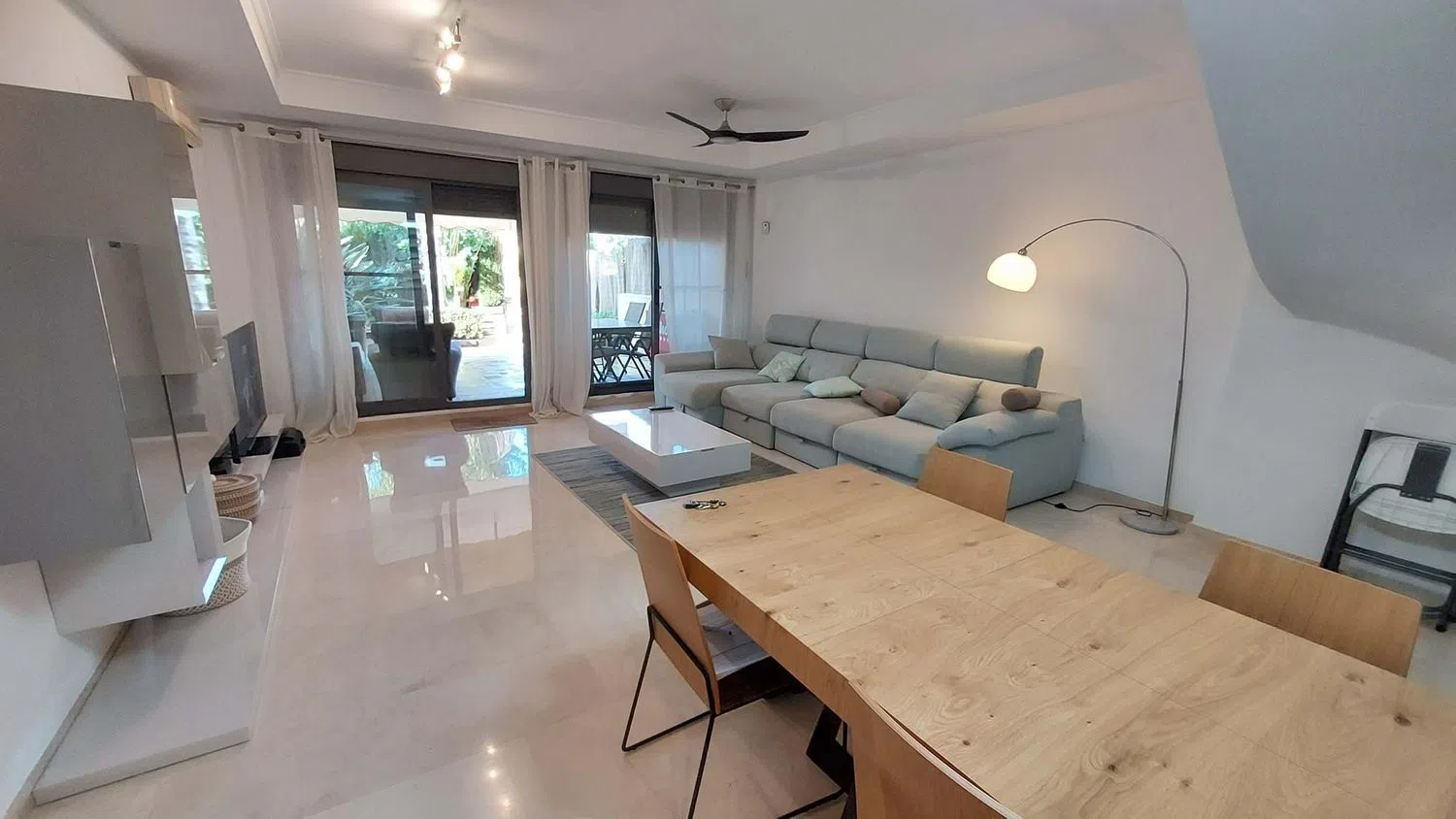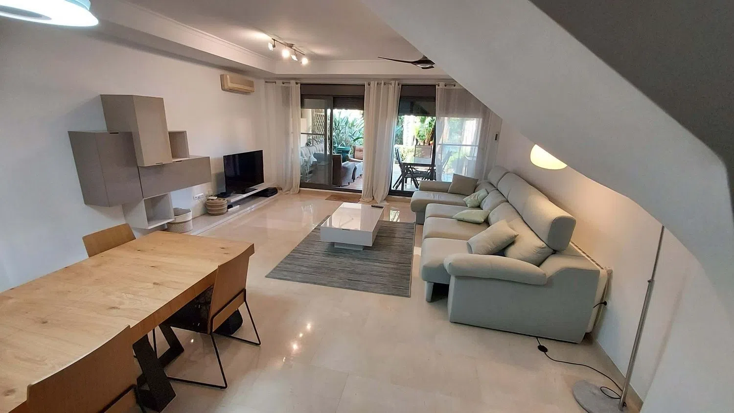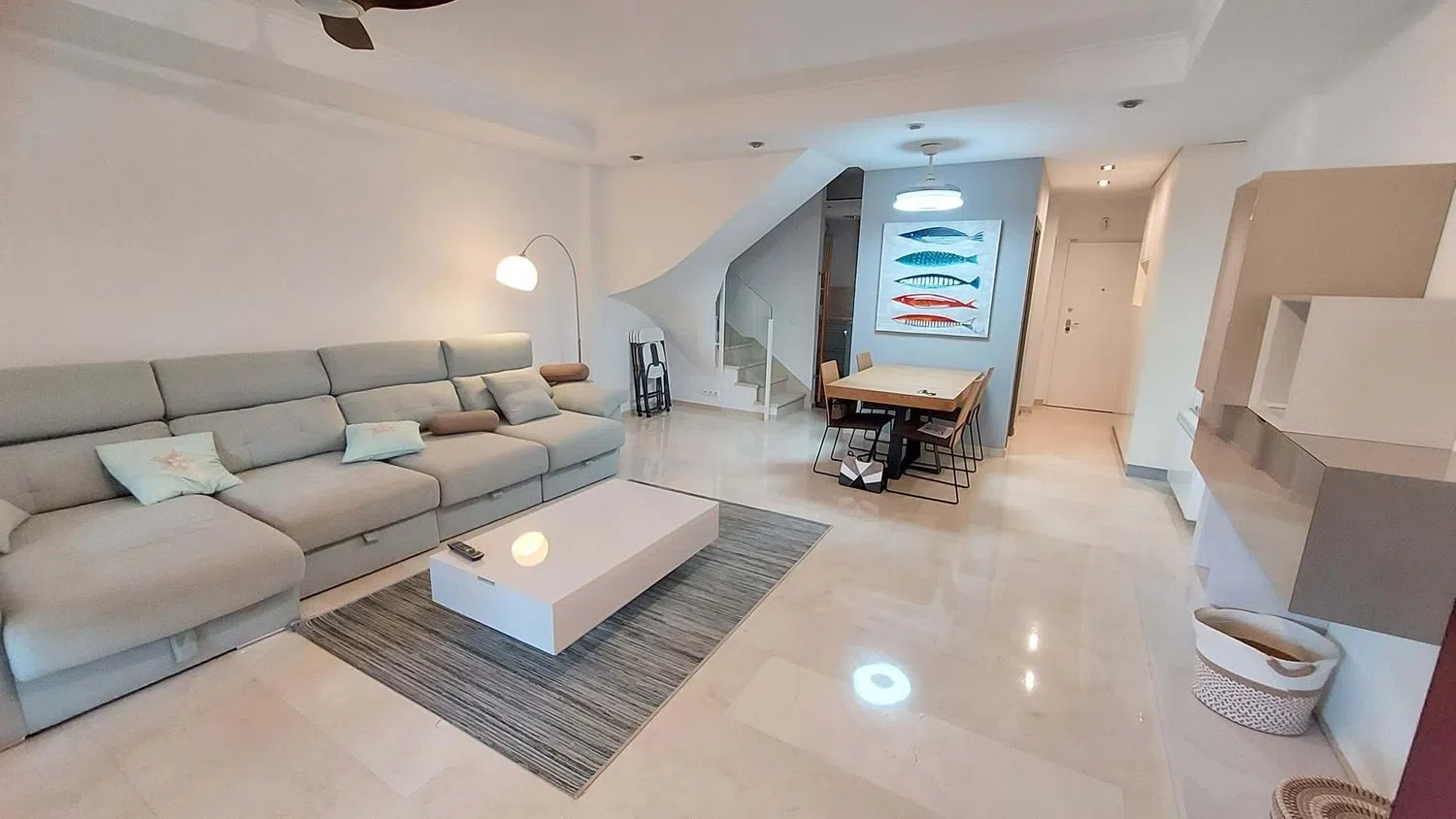 El tríplex cuenta con 164 metros cuadrados y ha sido meticulosamente renovado para fusionar la elegancia moderna con un ambiente acogedor. La entrada se abre a un amplio recibidor con armarios empotrados, que da paso a una cocina completamente reformada y equipada con electrodomésticos de primer nivel. La generosa sala de estar y comedor se extiende hacia una amplia terraza de 70 metros cuadrados, ideal para cenas al aire libre y entretenimiento con estilo.