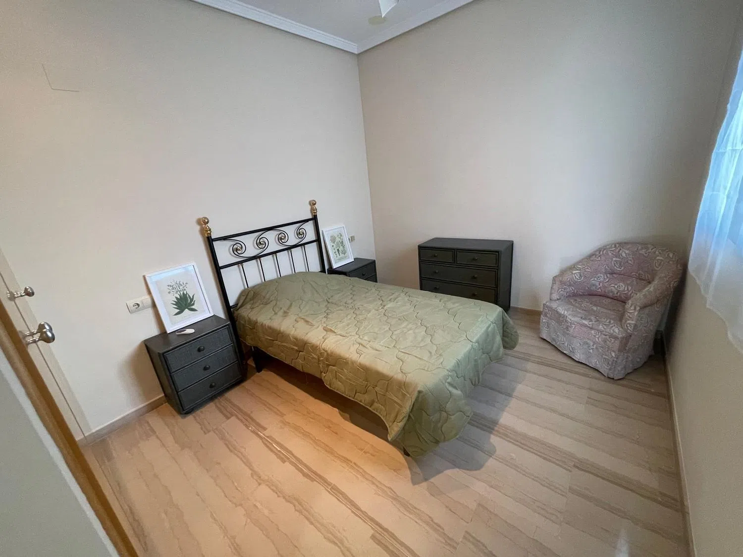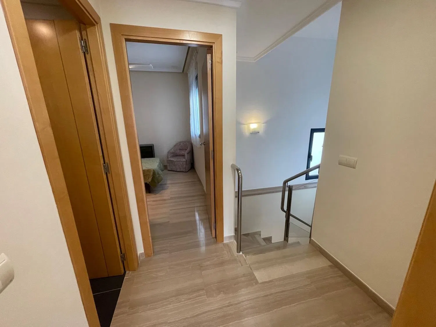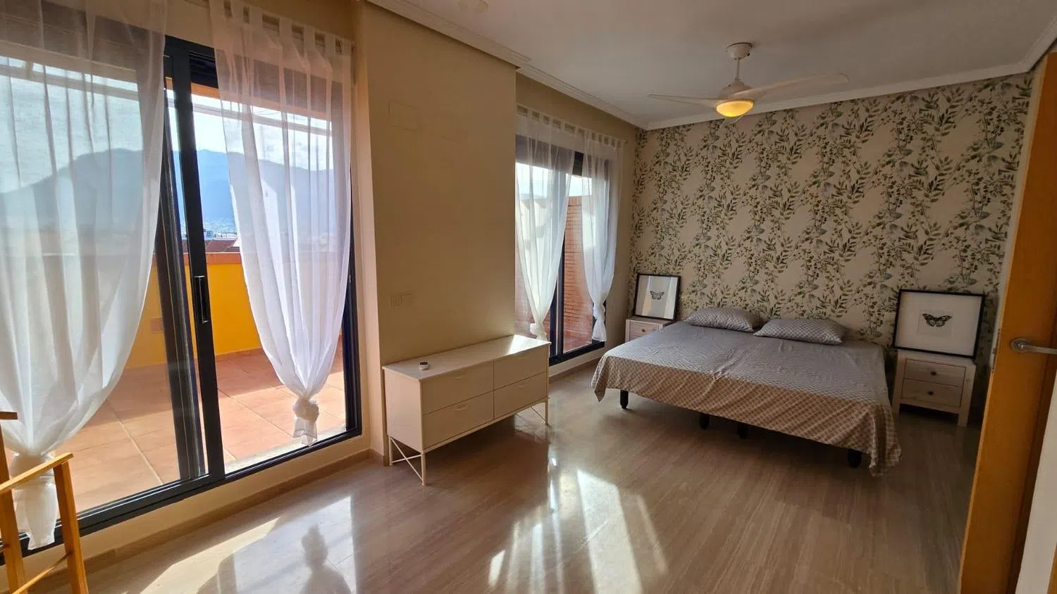 En la planta superior se hallan un dormitorio individual, uno doble con vestidor privado y acceso a otra terraza, además de un baño en suite que garantiza máxima comodidad. La propiedad está equipada con aire acondicionado, ventiladores de techo, un elegante suelo de mármol y una puerta de seguridad. Incluye también una plaza de garaje doble. La urbanización es de cuidado impecable, con amplias zonas verdes y una zona de piscina de generosas dimensiones, perfecta para disfrutar en días soleados. Su ubicación es privilegiada, a pocos pasos de todos los servicios requeridos y a corta distancia de la playa.