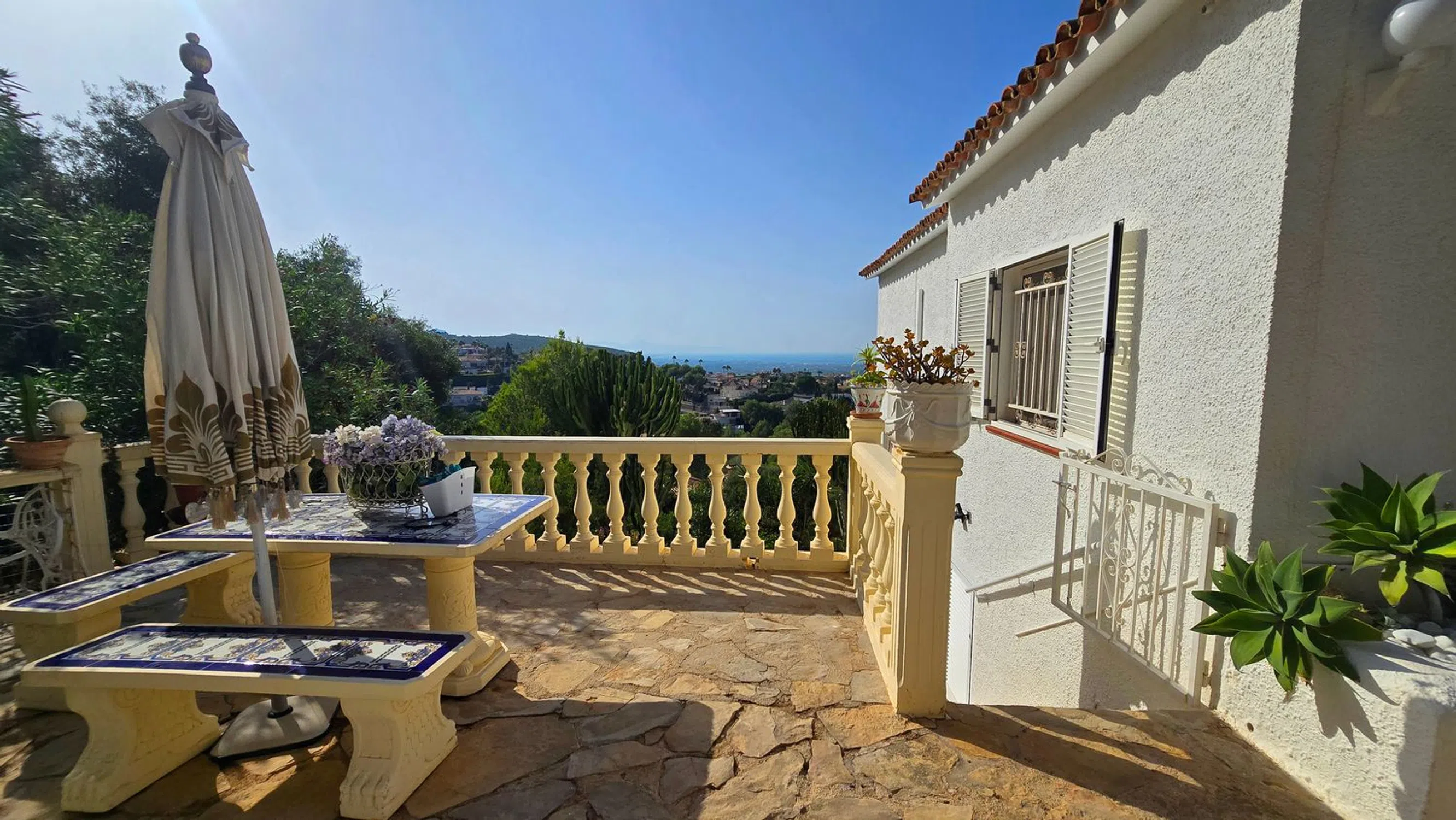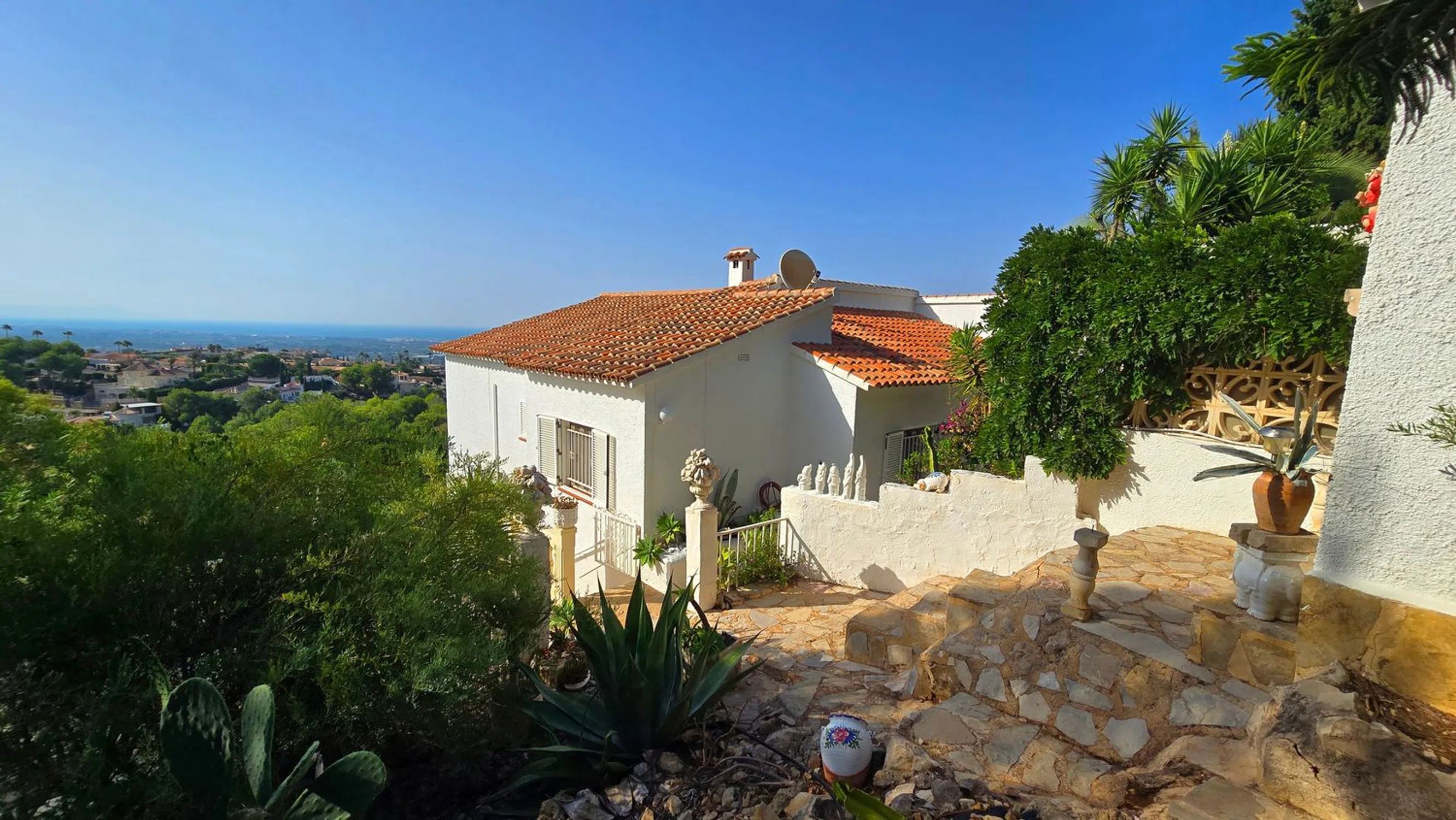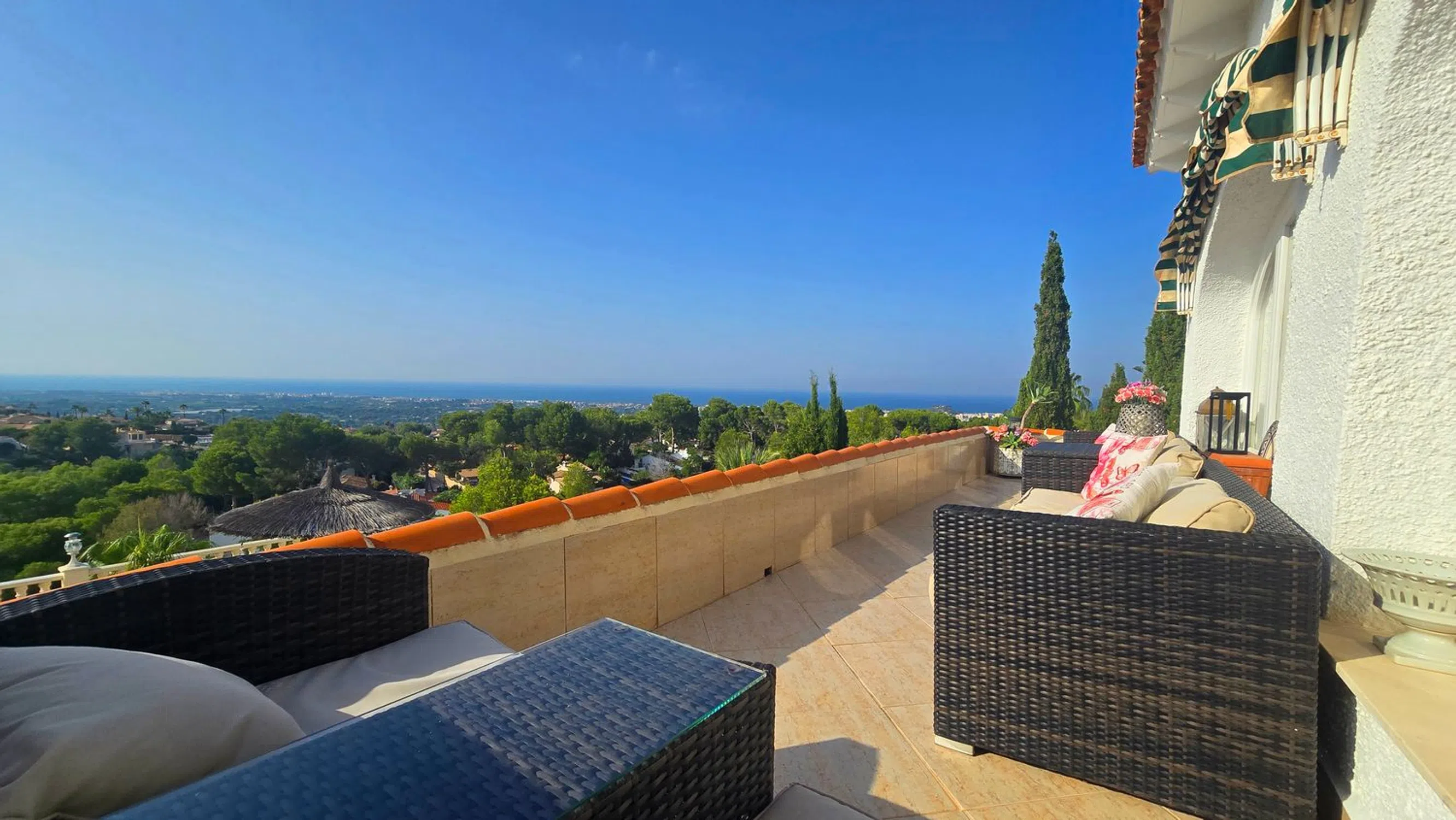 En lo alto de Marquesa V, esta villa ofrece una de las vistas más impresionantes de Dénia. Desde el castillo hasta Cullera, la costa se despliega en un solo panorama, con la ciudad y el mar a tus pies. Situada al final de una tranquila calle sin salida, la propiedad cuenta con la rara comodidad de dos accesos desde calles diferentes, cada uno con su propio garaje doble. A pesar de la privacidad, estás a solo cinco minutos del centro de Dénia y de todos sus servicios. La planta principal te recibe con un amplio y luminoso salón-comedor, conectado con una cocina semiabierta. En esta planta hay también tres dormitorios y dos baños, además de una escalera interior que conduce a la planta inferior. A lo largo de toda la fachada se extiende un balcón, perfecto para disfrutar de las vistas desde el amanecer hasta la puesta de sol, mientras que una gran terraza en la entrada ofrece otro espacio exterior. Dos escaleras exteriores rodean la casa, comunicando los niveles con facilidad. En la planta inferior se encuentra la zona de la piscina y la gran terraza, que se convierten en el corazón de la vivienda. Aquí está la suite principal con baño en suite y un amplio salón con salida directa a la piscina. Una naya cubierta y una cocina exterior hacen de este nivel el lugar ideal para reuniones y largas veladas de verano. Más abajo, un apartamento de invitados independiente ofrece comodidad y privacidad con su propio salón y cocina americana, dos dormitorios, un baño y una terraza privada. Es una vivienda pensada para familias que desean compartir momentos juntos sin renunciar a su propio espacio. Cada planta ofrece independencia, pero las terrazas, la piscina y la cocina exterior invitan siempre a reunirse. Con carácter, amplitud y unas de las mejores vistas de la costa, es un hogar para vivir el día a día y para disfrutar de encuentros inolvidables.