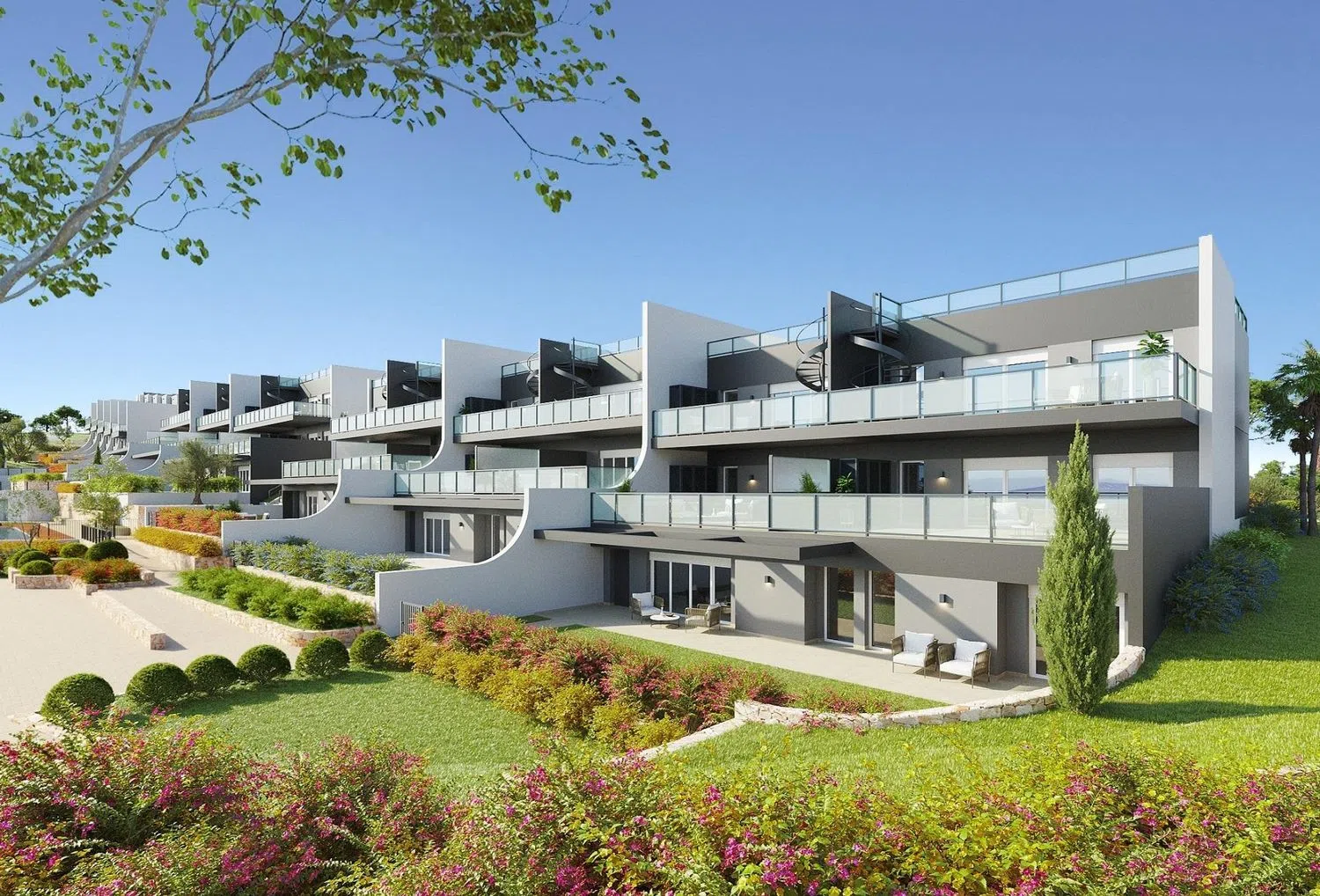 Descubre un exclusivo complejo residencial de nueva construcción en la encantadora zona de Finestrat, que ofrece una variedad de apartamentos, áticos y adosados. Este desarrollo incluye atractivos apartamentos en planta baja con jardines privados, comodas unidades en planta media con amplias terrazas y lujosos áticos que cuentan con un solarium privado.