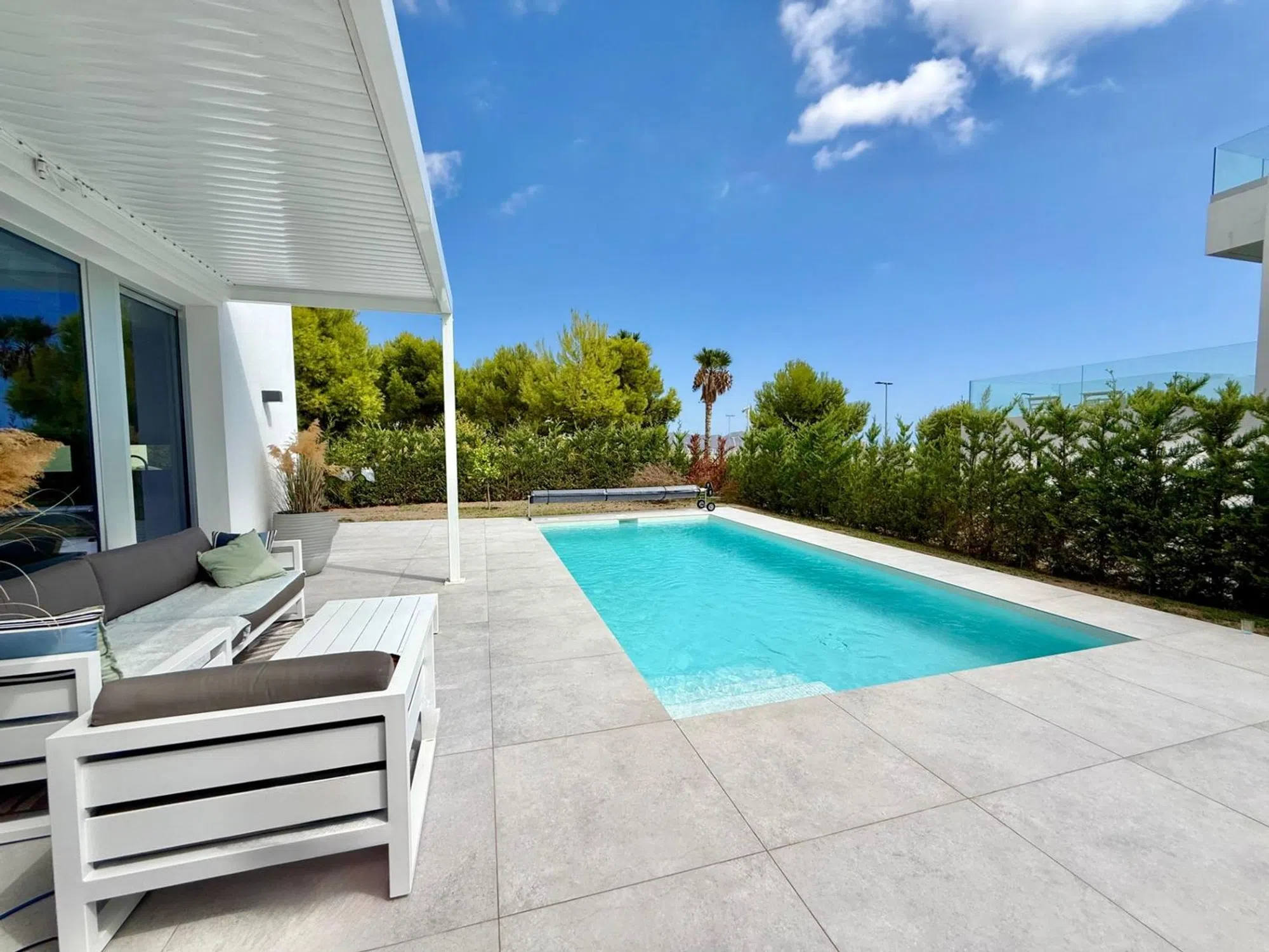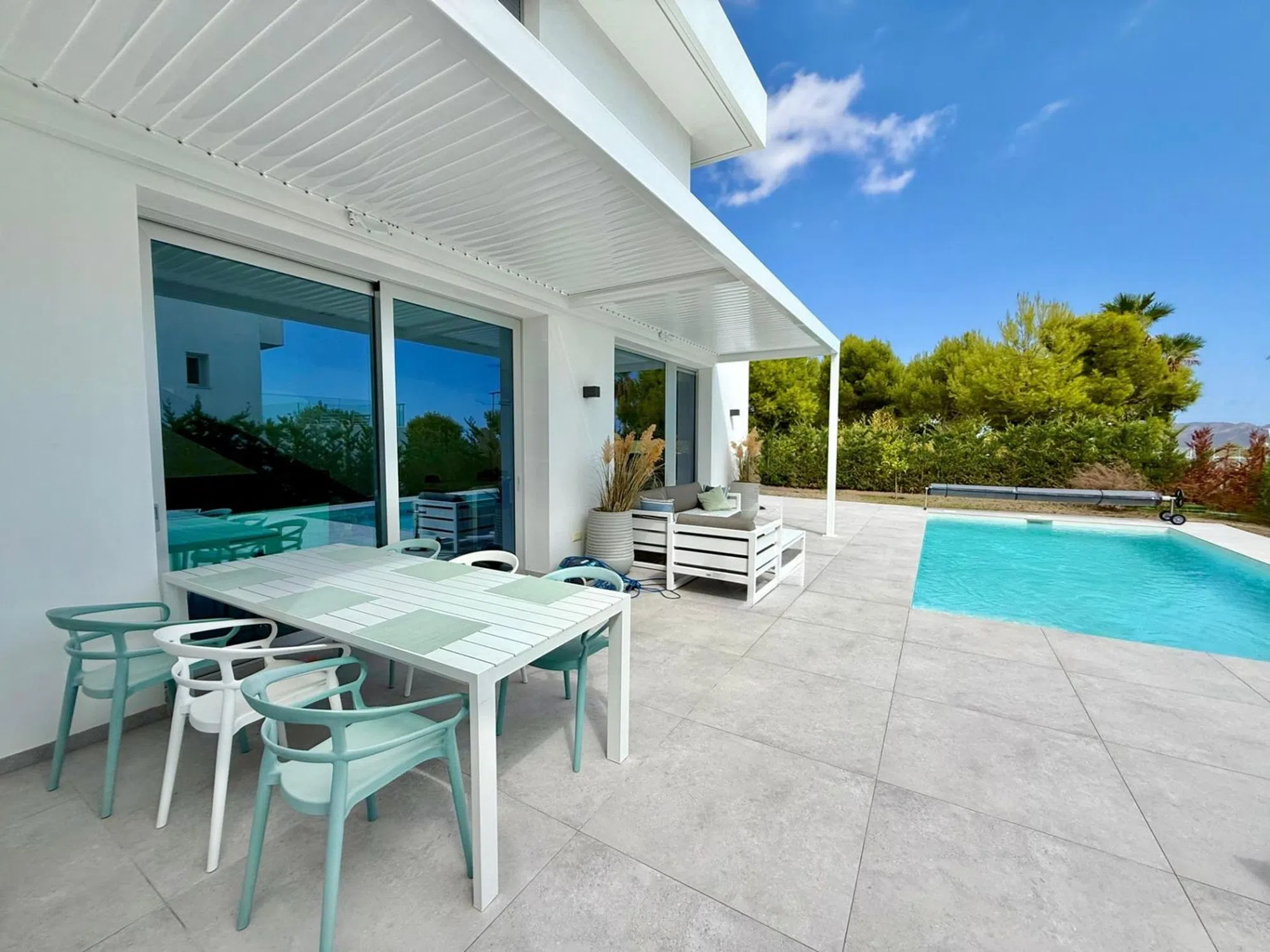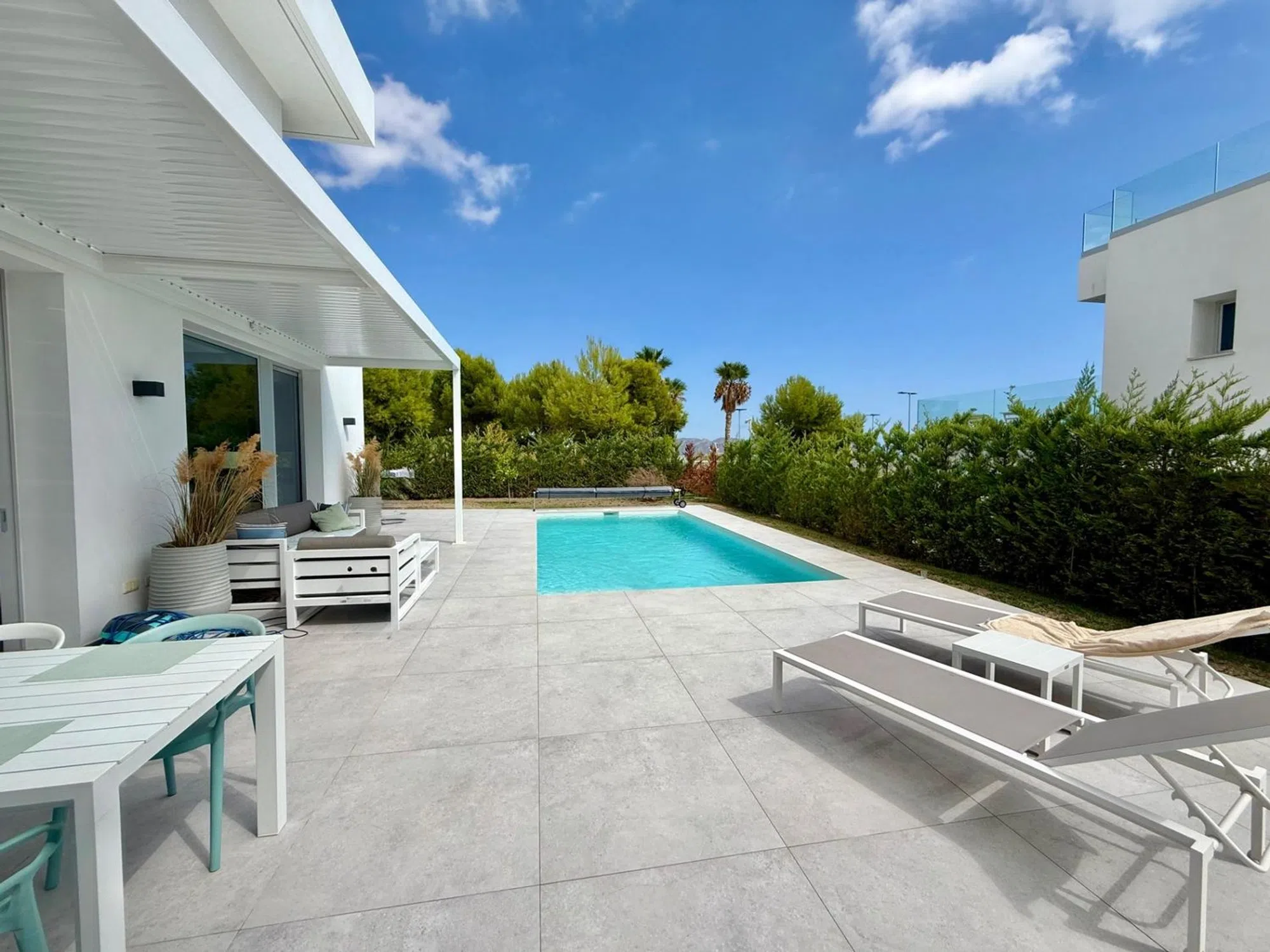 La vivienda tiene 176m2 construidos y costa de 3 dormitorios amplios, 3 baños completos, salón, cocina abierta, lavadero y varias terrazas. La parcela es de 600 m2 y tiene piscina privada, parking techado, terraza solada con vista al mar y zona ajardinada con palmeras, césped natural con riego automático. En toda la casa esta instalada calefacción marca Daikin por suelo radiante y dispone de paneles solares para agua sanitaria. Para concertar visita llámanos o escribe por Whats App:.