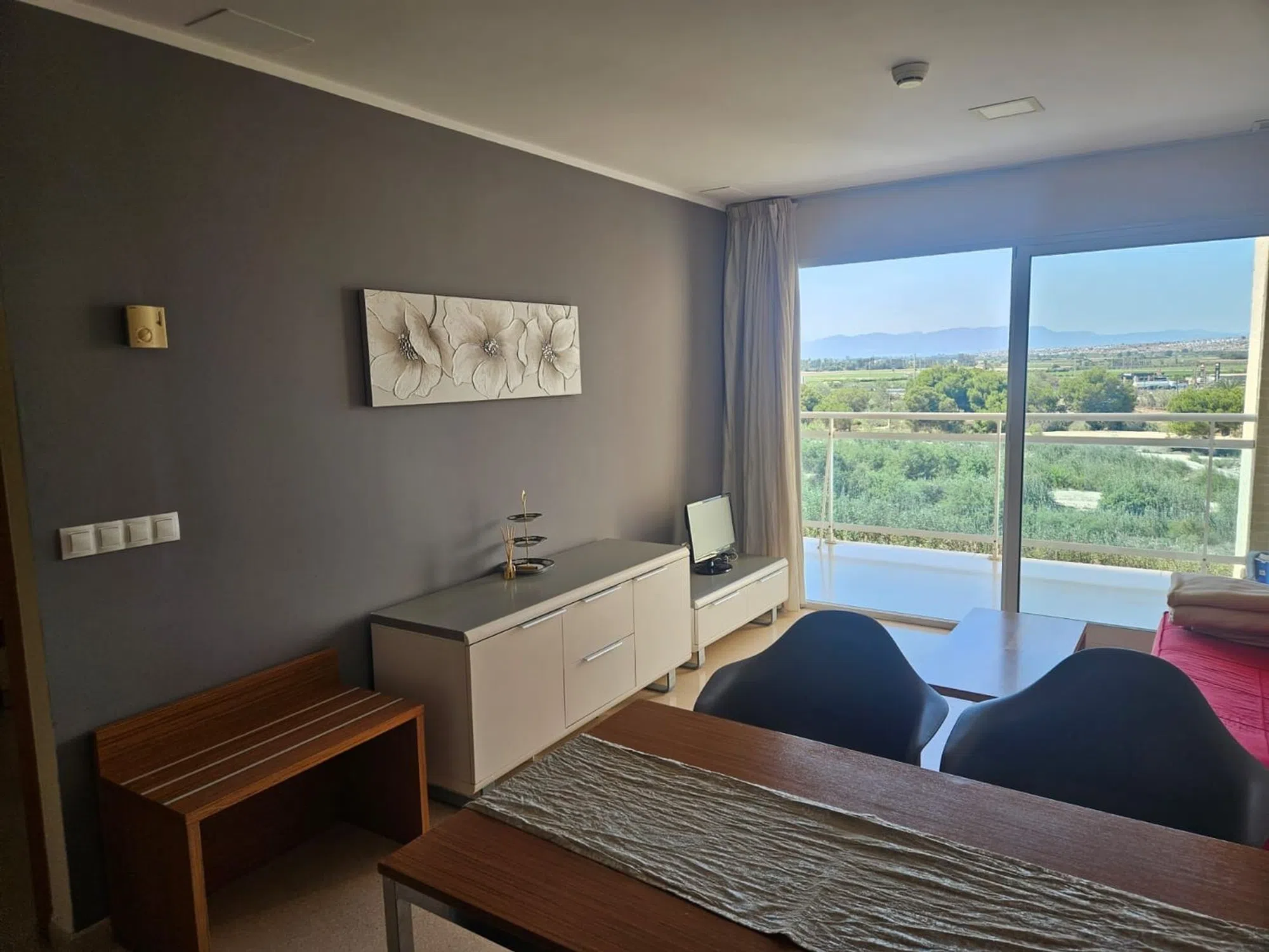 Este apartamento con orientación oeste ofrece espectaculares vistas a las montañas y al entorno natural circundante. Ubicado en la tercera planta de una residencia con piscina y ascensor, se encuentra a aproximadamente 2,4 km de la playa y a 500 metros del centro de Guardamar. Apartamento con amplia terraza El apartamento cuenta con un dormitorio con armario empotrado, cocina americana y un luminoso salón. Desde el salón se accede directamente a una amplia terraza con increíbles vistas a las zonas verdes circundantes y al río Segura. Dispone de un baño completo con ducha y WC. La cocina está totalmente equipada con todos los electrodomésticos necesarios. El apartamento también dispone de aire acondicionado. La residencia cuenta con piscina comunitaria, zona de recepción y aparcamiento. GUARDAMAR DEL SEGURA Guardamar del Segura es un municipio de la Costa Blanca, a 35 km al sur de Alicante. Con un total de 11 km de playas de arena fina, Guardamar del Segura presume de ser una de las playas más bonitas del litoral español. Guardamar es especialmente conocida por sus dunas de arena, ubicadas dentro de un área de conservación costera protegida. El pinar al norte del centro de la ciudad abarca 800 hectáreas y presenta una importante diversidad de especies vegetales, como pinos, palmeras y cipreses. La expansión del municipio, dedicado íntegramente al turismo, incluye numerosos hoteles y campings que reciben a miles de visitantes. La población se quintuplica durante el verano, lo que la convierte en un destino vacacional ideal. La ciudad presume de una rica oferta gastronómica, con una amplia variedad de bares y restaurantes que ofrecen una variedad de platos locales. Su conveniente ubicación cerca de la autopista AP7 proporciona un rápido acceso al Aeropuerto Internacional de Alicante.