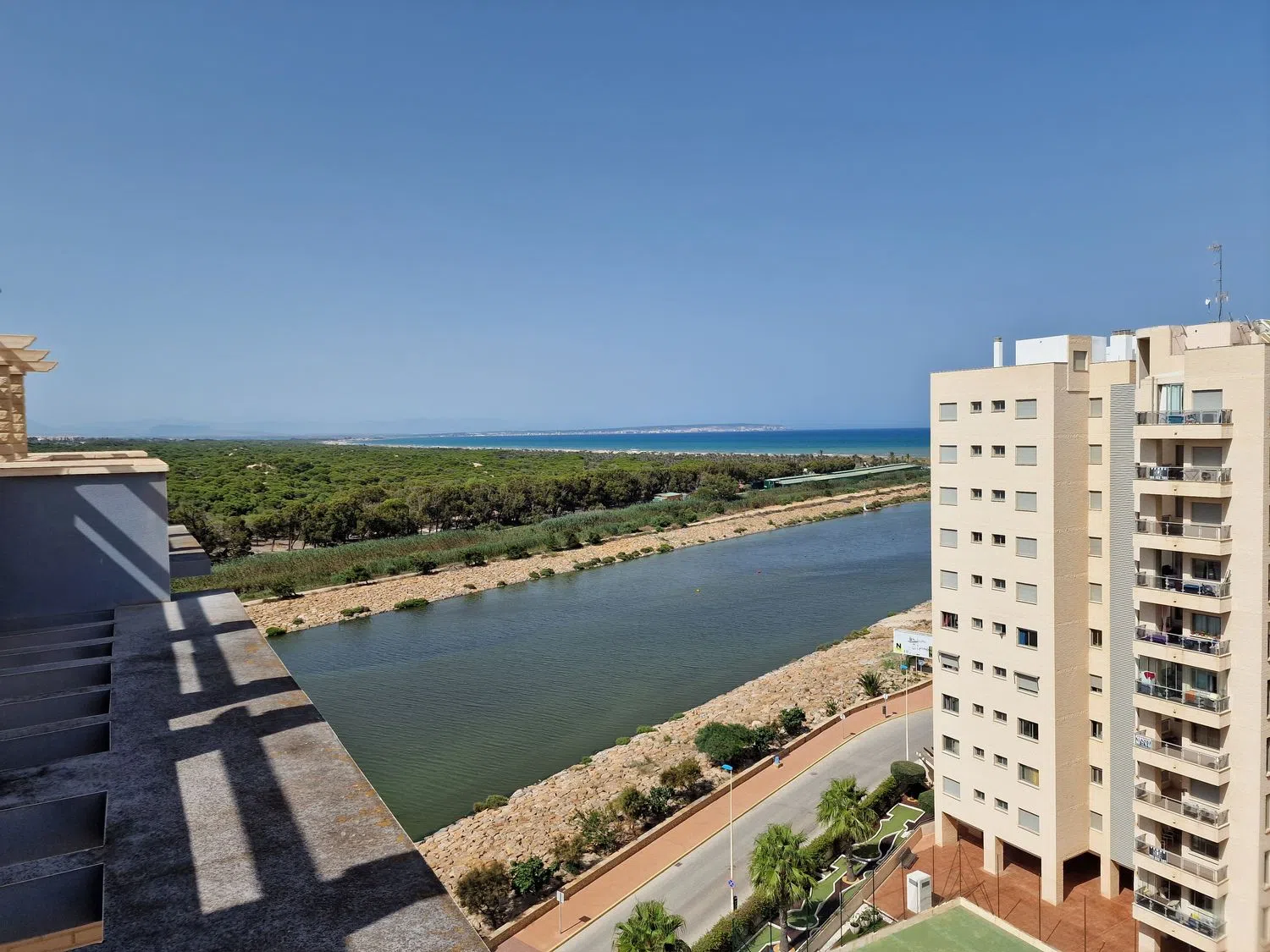 Desde el salón, se accede a una encantadora terraza que ofrece vistas al mar y al río, un espacio perfecto para disfrutar de comidas al aire libre o relajarse mientras se aprecia el ambiente mediterráneo. En la planta superior, le espera un solárium privado que ofrece panorámicas impresionantes del océano y del pintoresco bosque circundante. Con una superficie de aproximadamente 40 metros cuadrados, este solárium brinda un amplio espacio para tomar el sol, relajarse y, opcionalmente, instalar una cocina al aire libre, ideal para reuniones memorables con un espectacular telón de fondo costero.