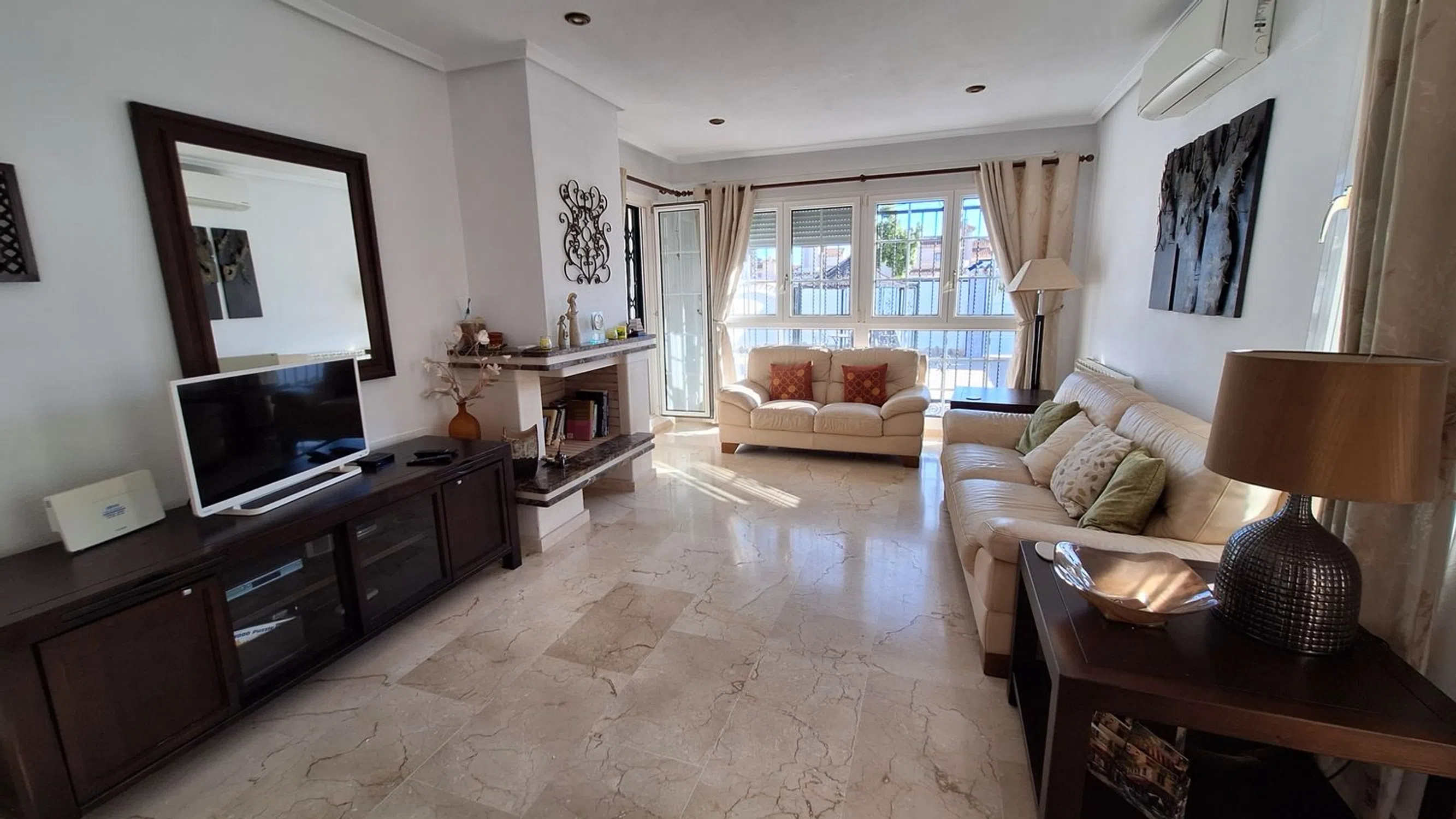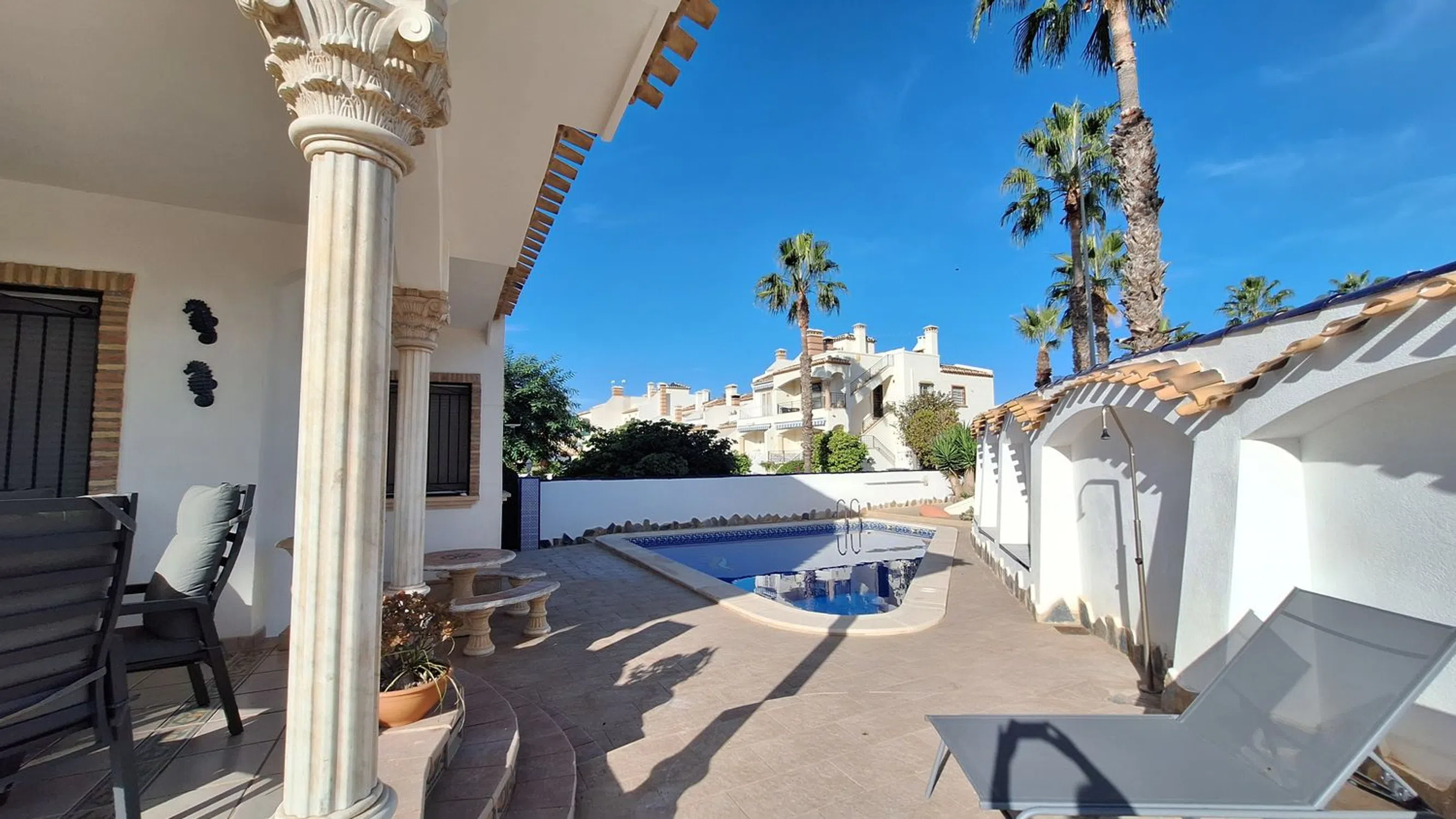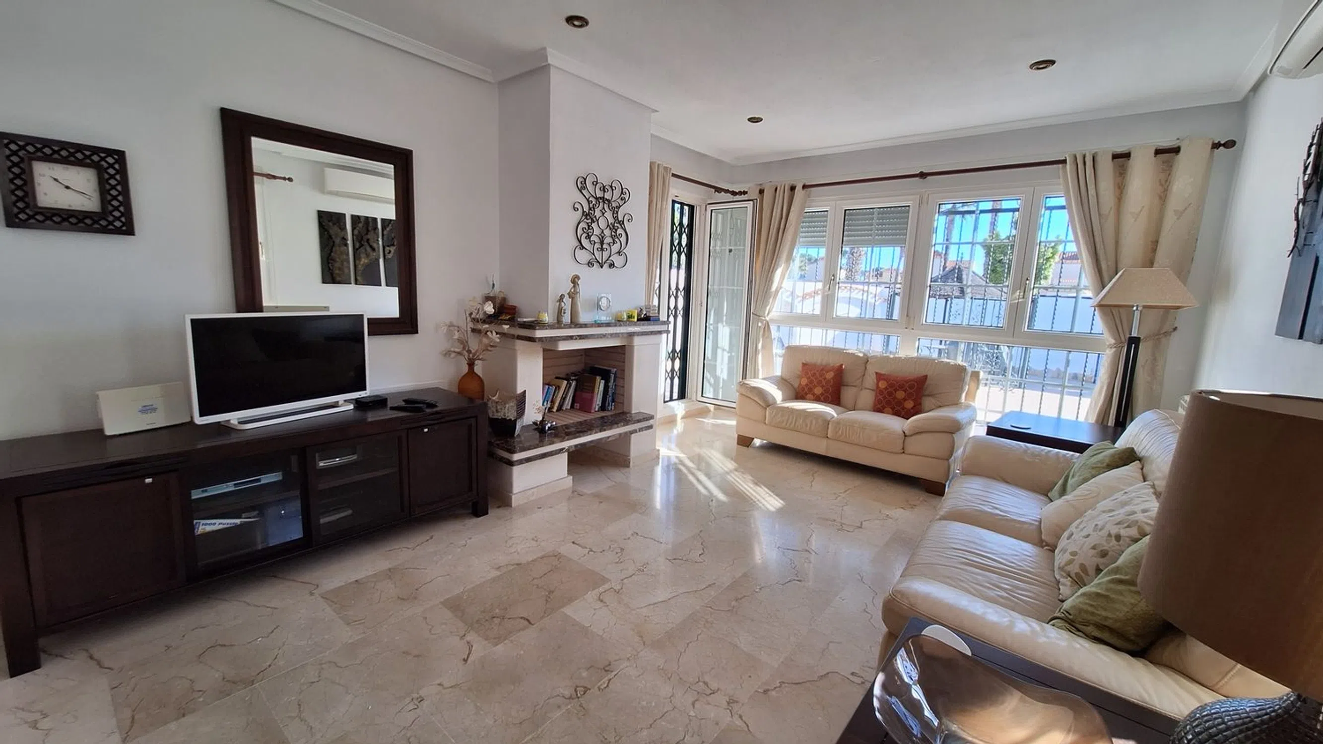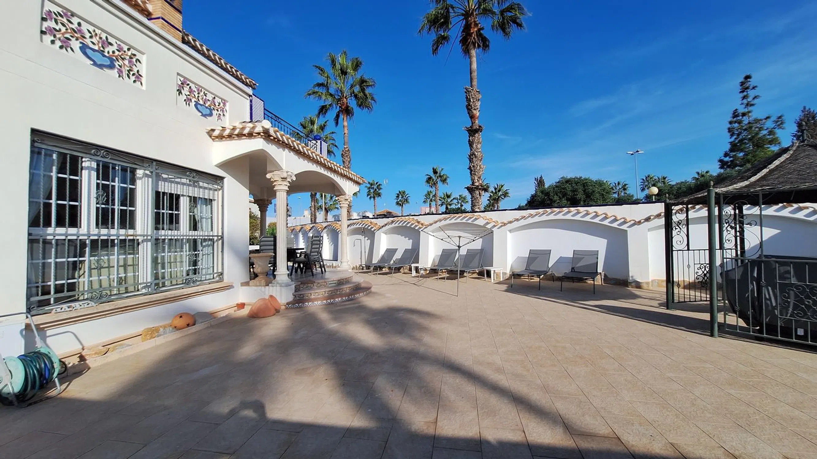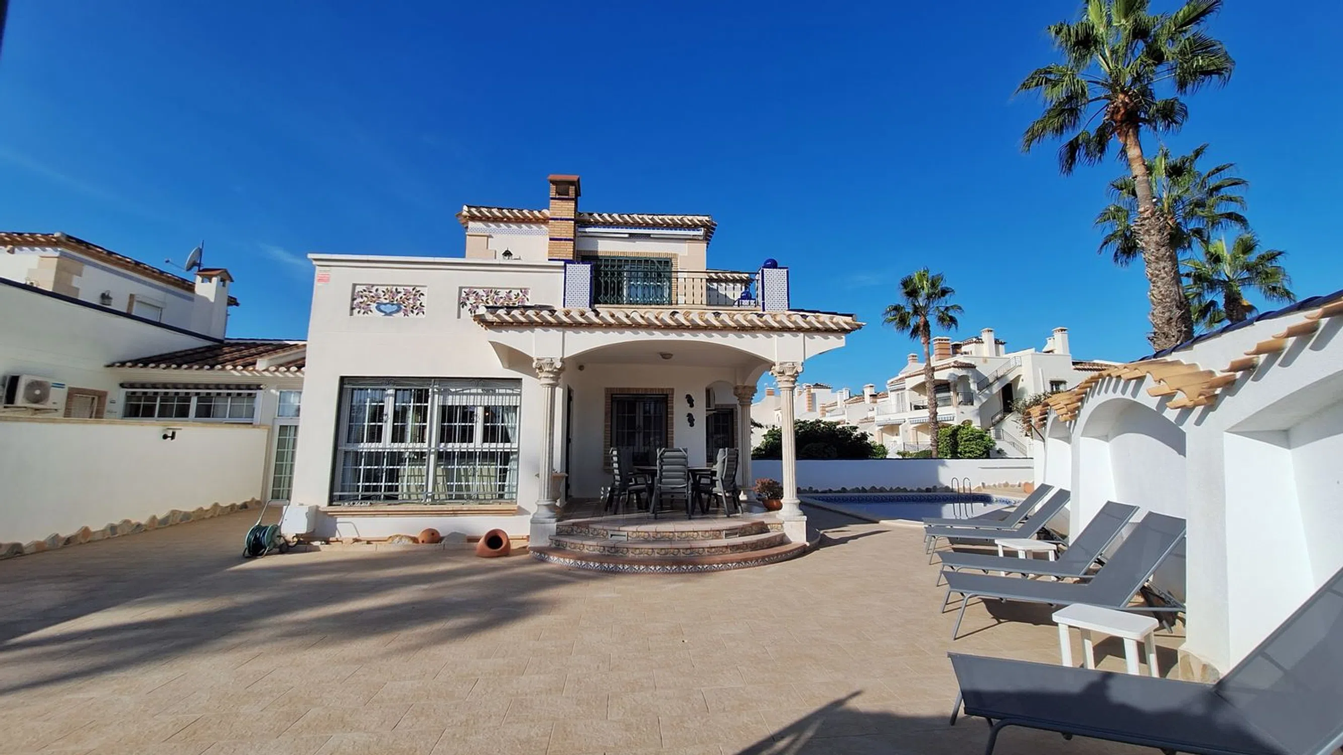 A rare opportunity to purchase this spacious and well-presented detached villa, ideally located on a 400 m² corner plot within easy walking distance of the popular bars, restaurants, and amenities of El Raso. This attractive property offers a fantastic blend of comfort, versatility, and Mediterranean charm. Outside, you’ll find a large private swimming pool, off-road parking, and a garage, all surrounded by low-maintenance terraces perfect for relaxing or entertaining. Inside, the villa features a bright and airy lounge with large windows that flood the space with natural light, a separate fully fitted kitchen, and a conservatory currently used as a dining area. The ground floor also comprises two double bedrooms and a family bathroom, providing ideal accommodation for guests or family members. Upstairs, the spacious master suite includes an en-suite shower room, dressing area, and access to a private sun terrace — perfect for enjoying the sunshine and views. Additional spaces include a sun room and a gym area, adding flexibility to suit your lifestyle needs. The home benefits from air conditioning throughout and offers excellent potential for personalisation or investment. Whether you’re seeking a permanent residence, a family holiday home, or a rental opportunity, this property ticks every box. Oportunidad única de adquirir este amplio y bien presentado chalet independiente, situado en una parcela esquinera de 400 m², a muy poca distancia a pie de los populares bares, restaurantes y servicios de El Raso. Esta atractiva propiedad ofrece una fantástica combinación de comodidad, versatilidad y encanto mediterráneo. En el exterior encontrarás una gran piscina privada, aparcamiento dentro de la parcela y un garaje, todo rodeado de terrazas de bajo mantenimiento ideales para relajarse o recibir invitados. En el interior, la vivienda cuenta con un salón luminoso y espacioso gracias a sus amplios ventanales, una cocina independiente totalmente equipada y un invernadero actualmente utilizado como comedor. La planta baja también dispone de dos dormitorios dobles y un baño familiar, proporcionando un alojamiento ideal para familiares o invitados. En la planta superior, la amplia suite principal incluye un cuarto de baño en suite con ducha, vestidor y acceso a una terraza solárium — perfecta para disfrutar del sol y las vistas. Además, la propiedad cuenta con una sala acristalada y un espacio de gimnasio, ofreciendo flexibilidad para adaptarse a tus necesidades. La vivienda dispone de aire acondicionado en toda la casa y ofrece excelente potencial para personalizar o invertir. Tanto si buscas una residencia permanente, una casa de vacaciones familiar o una oportunidad de inversión, esta propiedad lo tiene todo.