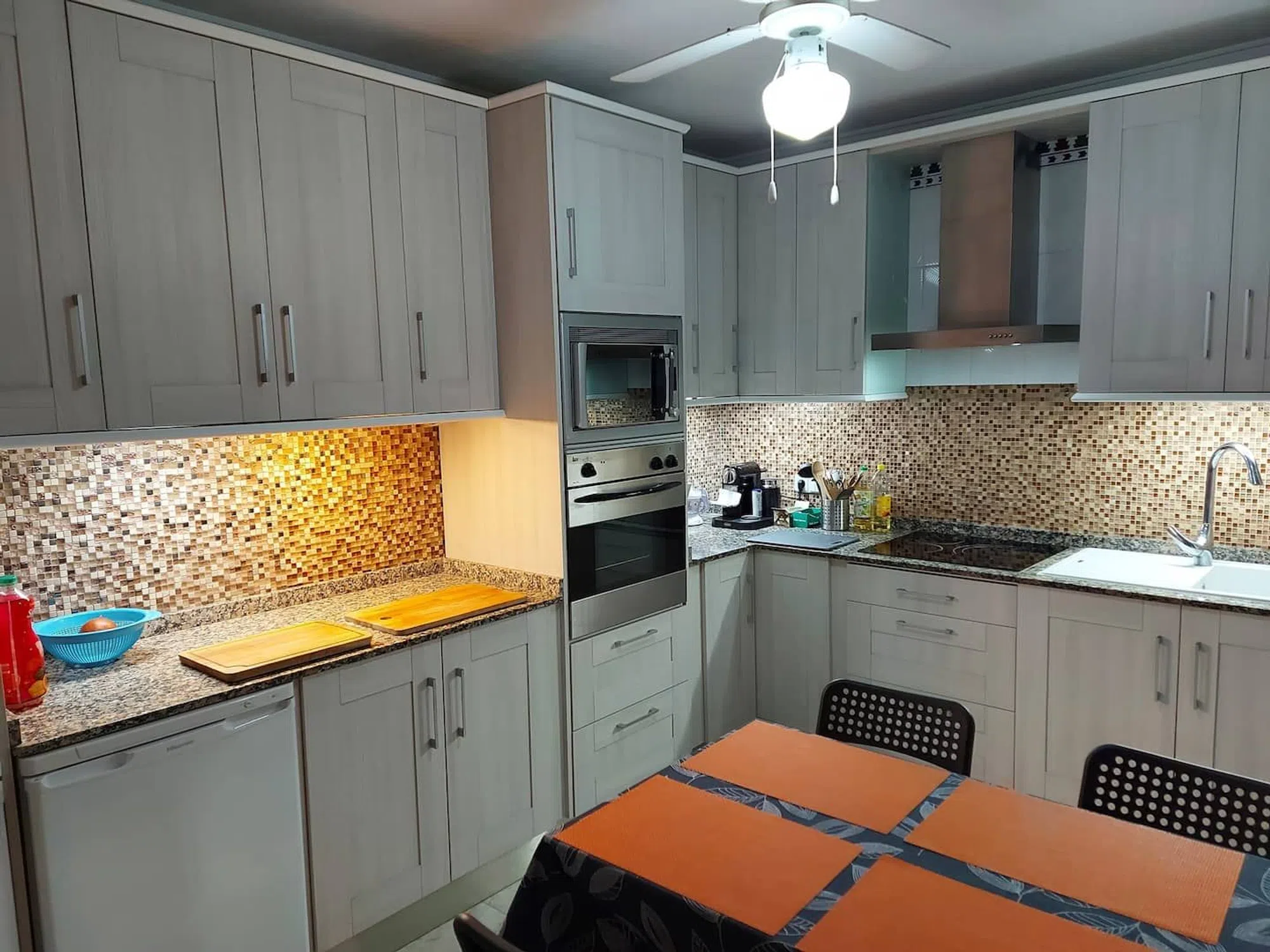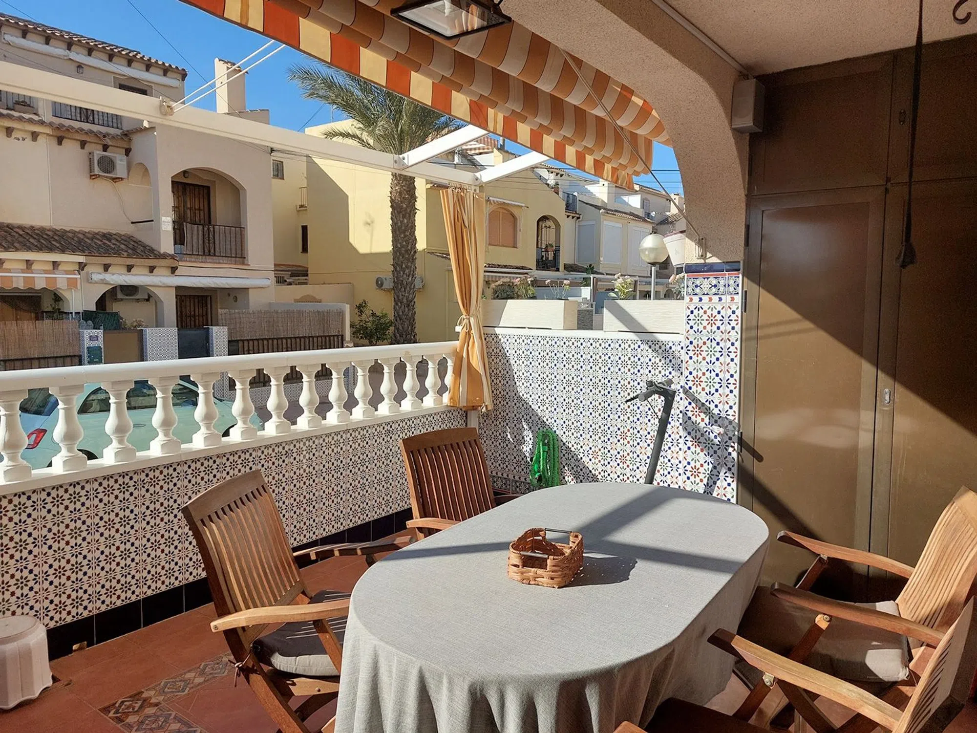 Casa adosada con planta baja elevada y dos plantas más (3 plantas en total) en El Moncayo, Residencial La Laguna, Guardamar del Segura. En la planta baja se encuentran el salón, la cocina, un baño y la terraza con muebles de jardín, armario exterior y toldo. En la primera planta hay dos dormitorios y otro baño. En la segunda planta hay otros dos dormitorios más pequeños y la azotea con toldo. En total, 4 habitaciones con 7 plazas para dormir. Salón con sofá rinconera. Cocina con lavadero independiente y lavavajillas. 2 baños con ducha. Terraza con toldo y muebles de teka, y un armario exterior. Azotea / solarium con toldo. 4 aparatos de aire acondicionado. Suelo: Baldosas en cocina y baños, parquet laminado en dormitorios y salón. Conexión a Internet por fibra óptica. 2 piscinas comunitarias, una de ellas directamente detrás de la casa. Gastos comunitarios: 175€ / 6 meses, febrero y agosto. Totalmente amueblado con cómodas, armarios empotrados, 5 camas, mesas y sillas y con todos los electrodomésticos visibles en las fotos. Listo para entrar a vivir. Venta privada sin agente inmobiliario. Contrato de compra gestionado por una asesoría con experiencia en Guardamar, incluida la transferencia en el registro de la propiedad y todos los contratos de suministro. Los honorarios de Gestoria se reparten entre el comprador y el vendedor. El vendedor vive en Torrevieja y habla alemán, francés e inglés, y sólo un poco de español. Por lo tanto, póngase en contacto conmigo a través del chat para que pueda traducir el mensaje. La casa tiene varios alquileres privados hasta finales de octubre, y por lo tanto sólo se puede ver en algunos días cuando no hay huéspedes. Estaré encantada de enviarle una lista de posibles días de visita.