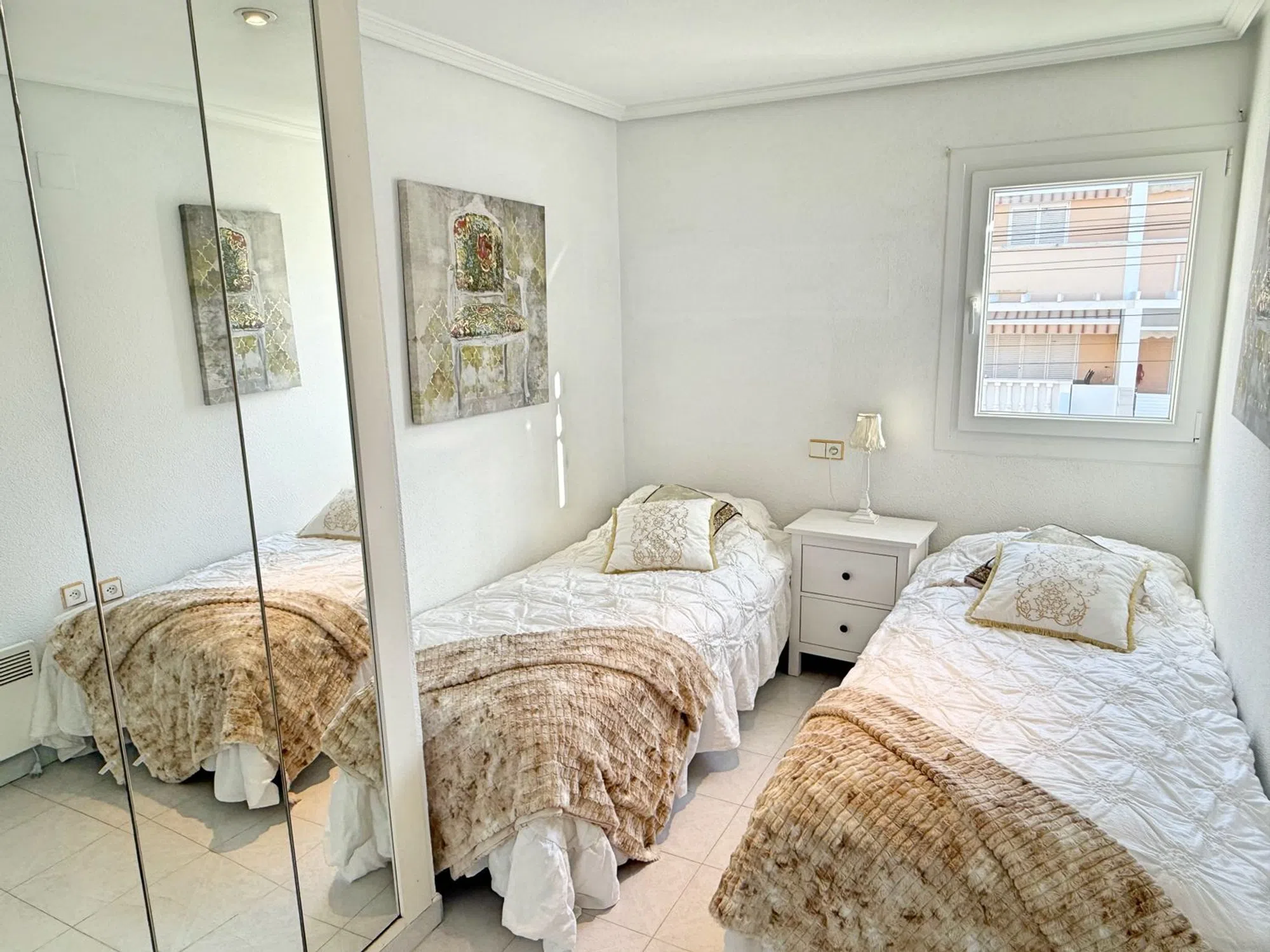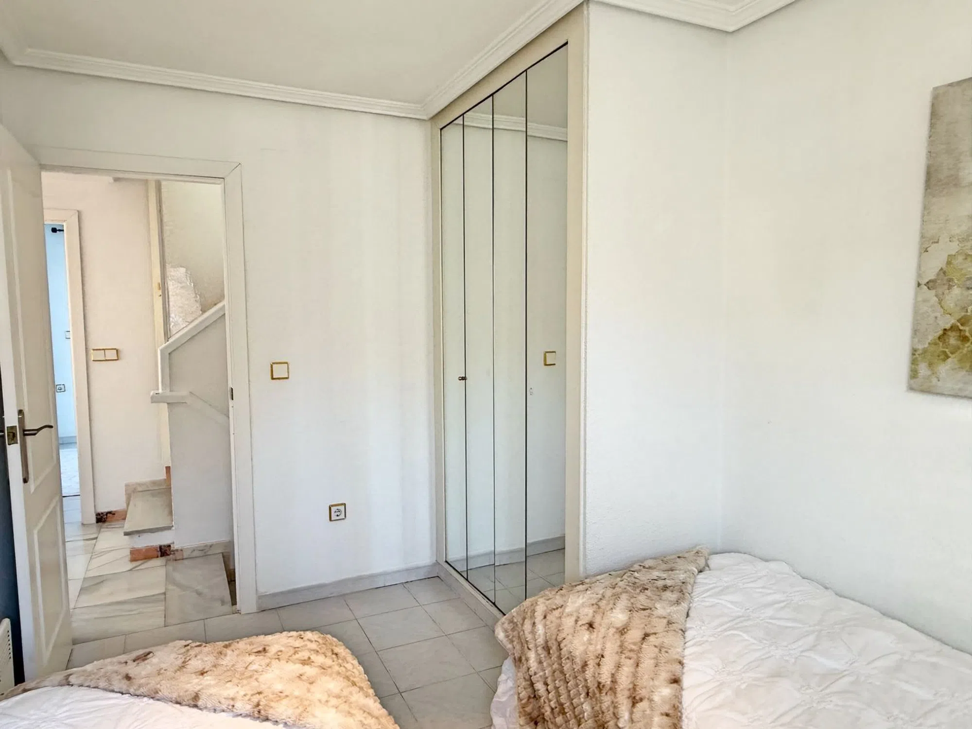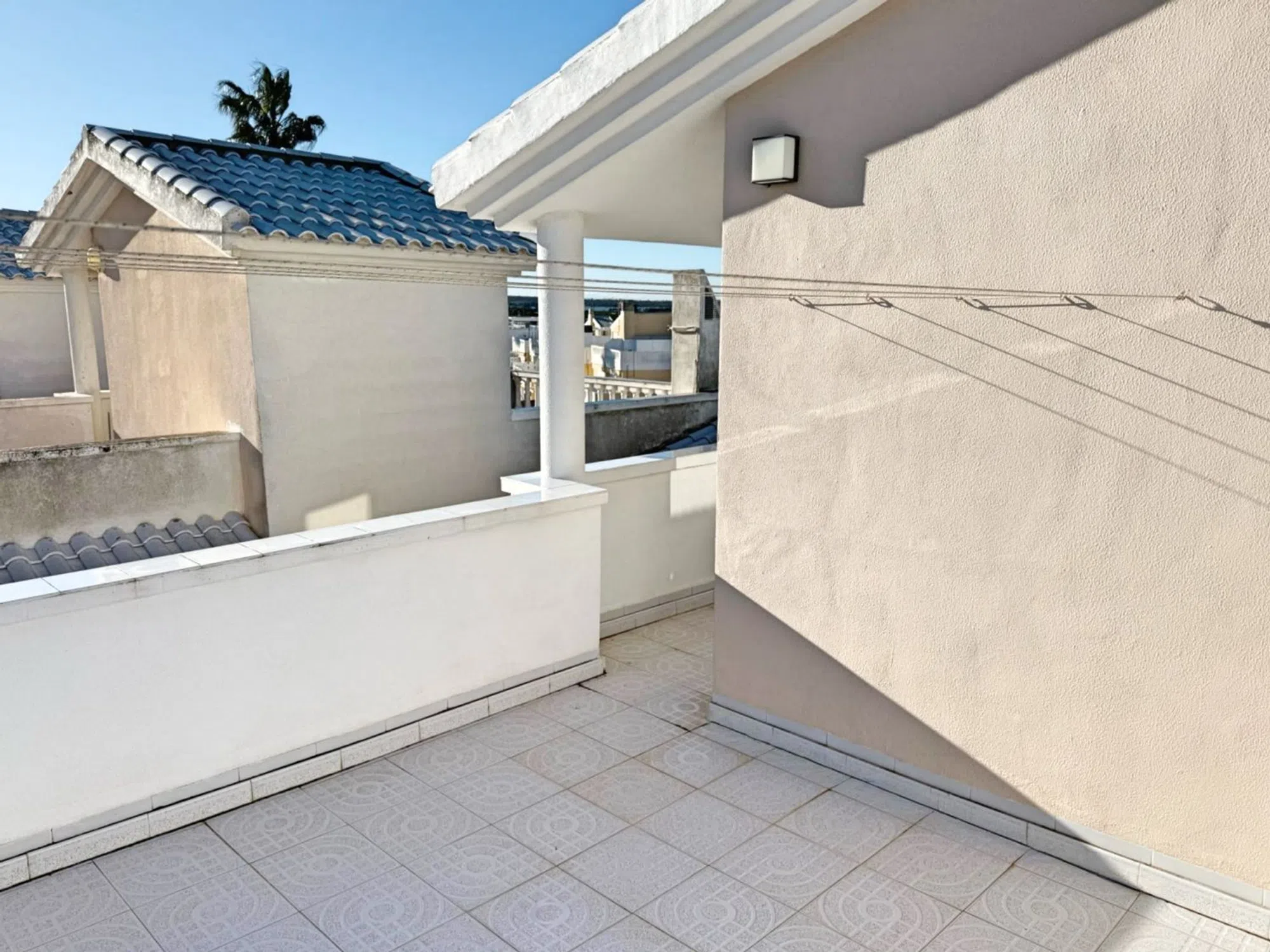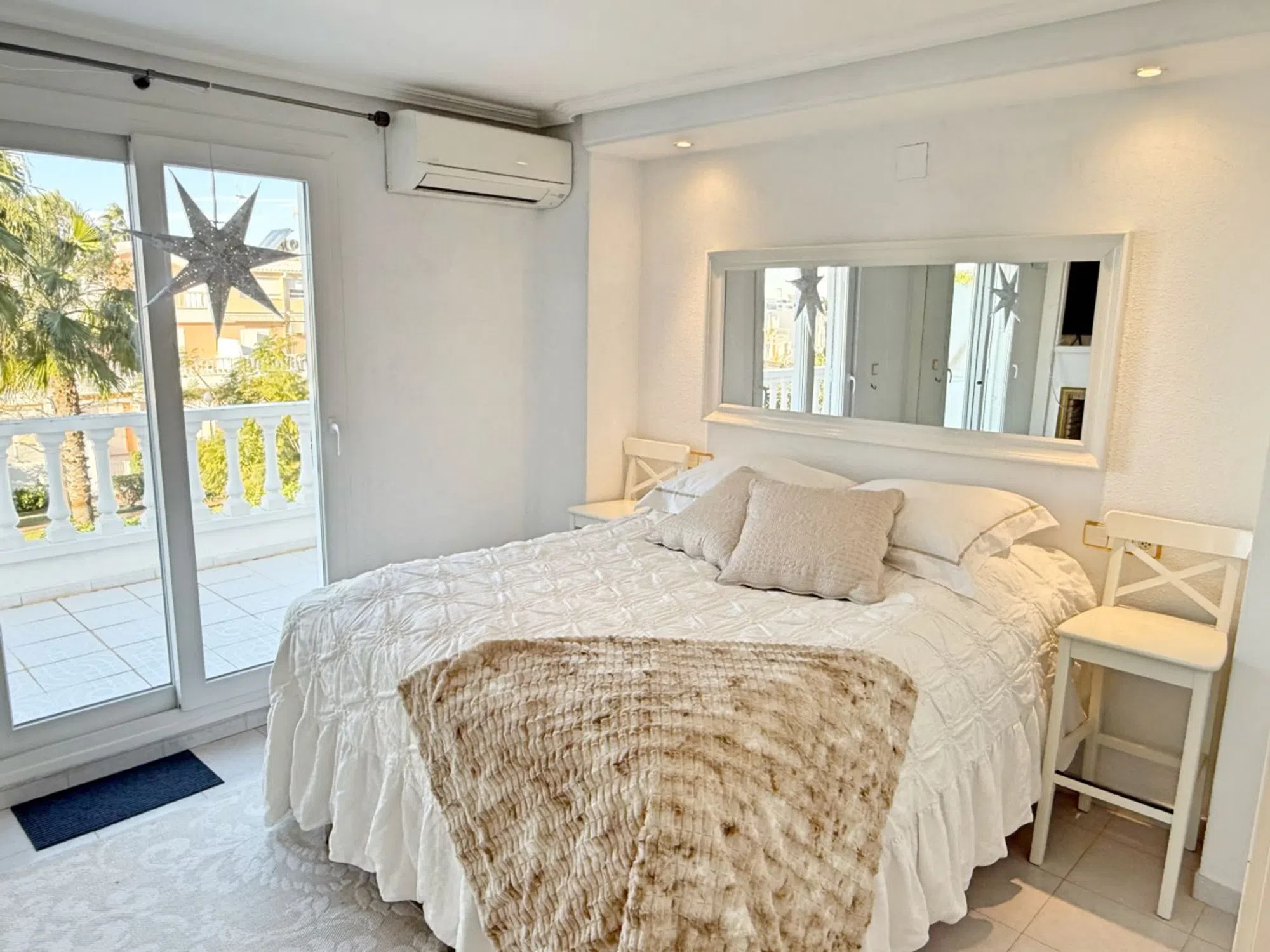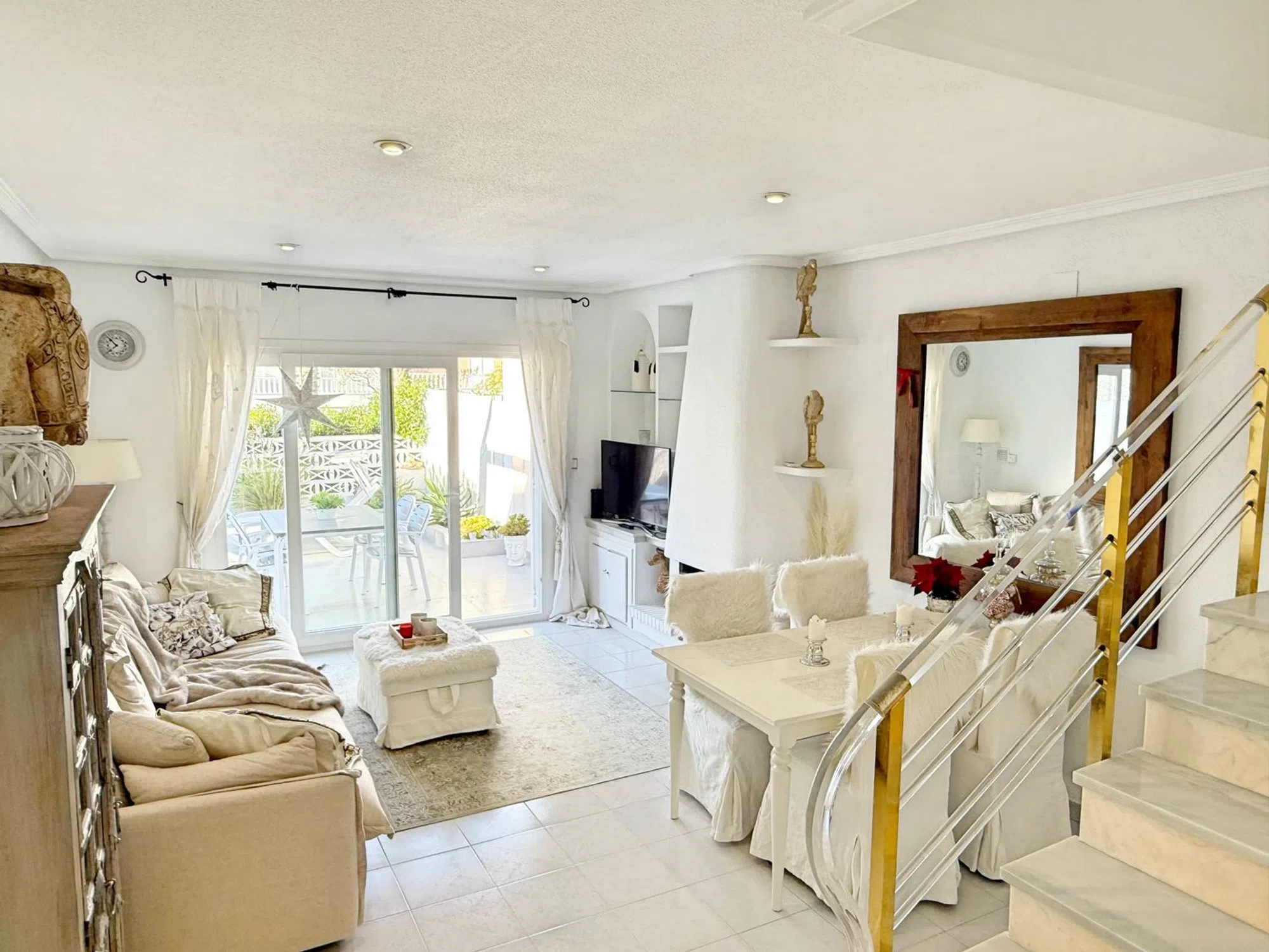 Luminosa chalet de dos plantas con solarium en El Moncayo, Guardamar del Segura Esta vivienda luminosa de dos plantas se encuentra en la Costa Blanca, en la zona de El Moncayo en Guardamar del Segura, a solo un corto paseo de las magníficas playas de arena de la zona. La casa ha sido cuidadosamente renovada y se encuentra en excelente estado, sin necesidad de reformas. En la planta baja hay un salón amplio y luminoso, una cocina funcional y un aseo independiente. En la parte delantera de la vivienda hay una acogedora terraza, y en la parte trasera un gran patio vallado con acceso directo a la piscina comunitaria y a la zona ajardinada. En la segunda planta se encuentran dos dormitorios y un baño. Desde uno de los dormitorios se accede a un amplio balcón con vistas a la piscina y a las zonas verdes de la comunidad. Desde el balcón se accede a una zona privada de sauna, con sauna, ducha y área de descanso. La estufa de la sauna es nueva. La vivienda también cuenta con una gran terraza en la azotea con vistas impresionantes, incluyendo vistas a las lagunas salinas. Está completamente equipada y dispone de bombas de aire acondicionado para calefacción y refrigeración. El baño tiene calefacción por suelo radiante. El salón y uno de los dormitorios cuentan con chimenea funcional. Además, el salón dispone de un sistema de ventilación solar que mantiene la humedad fuera incluso cuando la vivienda está vacía. También dispone de un garaje amplio privado, ideal para guardar bicicletas. El aeropuerto de Alicante está a solo unos 30 minutos en coche. Las magníficas playas naturales de Guardamar están a unos 10 minutos a pie. A poca distancia hay un par de restaurantes, y el centro de la ciudad está a 3 kilómetros. Torrevieja está a unos 10 km.