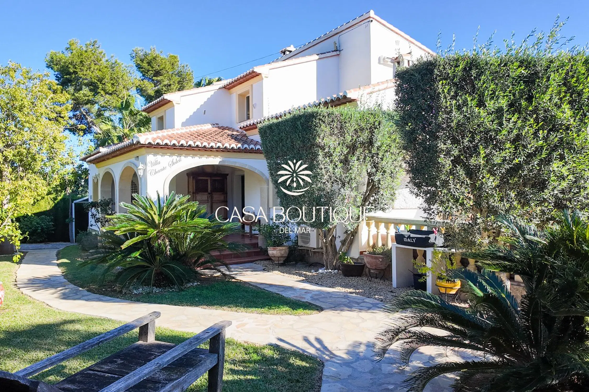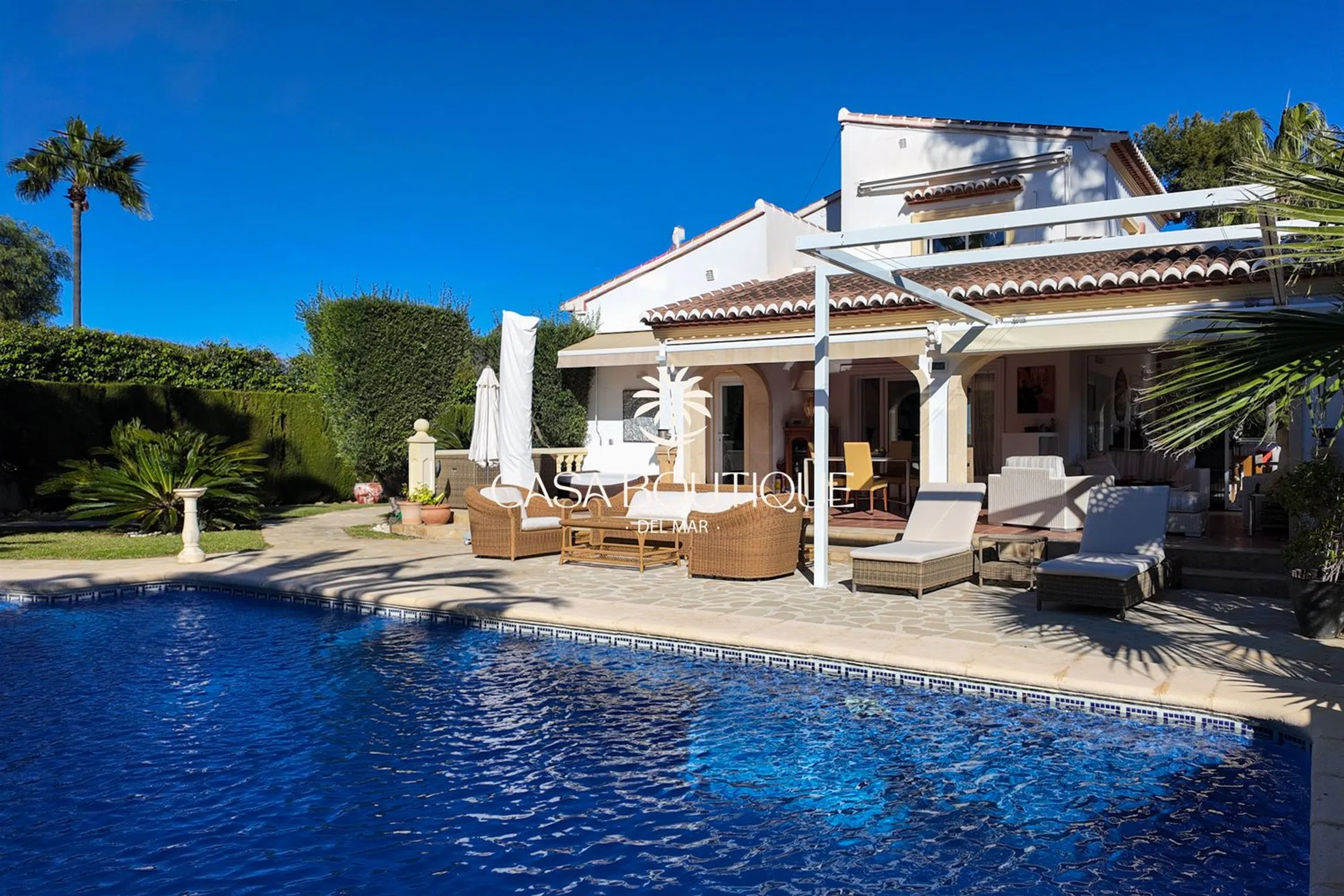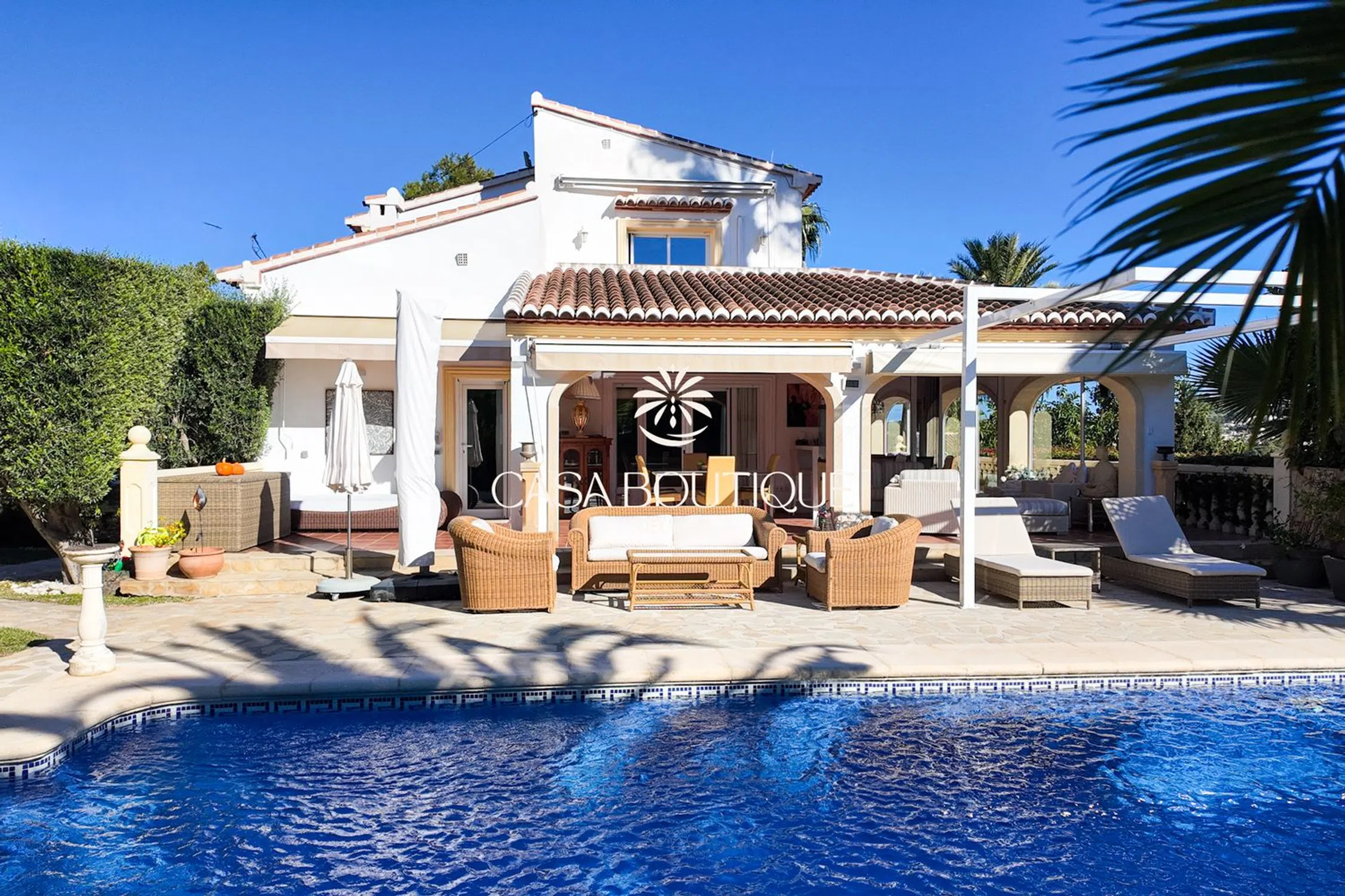 Situada en un terreno de poco más de 1.000 m², esta villa mediterránea disfruta de una posición dominante a 60 m sobre el valle, con orientación suroeste que garantiza vistas despejadas sobre las colinas de Jávea y total intimidad. Construida en 2003 y completamente renovada en 2017, la propiedad está rodeada de un jardín mediterráneo maduro salpicado de palmeras, cipreses y espacios exteriores diseñados para la relajación. La arquitectura retoma los códigos locales: arcos de piedra toscana, tejas canal, vigas a la vista y una naya acristalada que prolonga de forma natural la sala de estar principal. La entrada, diseñada en doble altura y adornada con un candelabro clásico, conduce a un salón luminoso con chimenea. El espacio de día se abre a una terraza cubierta y a la piscina, creando una circulación fluida entre el interior y el exterior —ideal para vivir todo el año bajo el clima de la Costa Blanca. La zona de noche incluye cuatro habitaciones dobles y tres baños, dos de ellos en suite. La suite principal, situada en la planta superior, dispone de vestidor, un baño con bañera y ducha separada, y una terraza privada que ofrece panorámicas del paisaje circundante. Una de las habitaciones tiene acceso independiente, ideal para invitados. En el exterior, la piscina de 10 x 5 m (renovada por Gunitec) constituye el centro de la vida al aire libre, acompañada de un gazebo balinés de 3,5 x 3,5 m, zonas chill‑out y rincones de comedor para disfrutar plenamente del clima. Las prestaciones incluyen 12 paneles solares con batería de 10 kW, estores recientes (incluido un estor eléctrico de alta gama), calefacción a gas (depósito), aire acondicionado reversible en toda la casa, sistema de alarma cableado con cámaras interiores y exteriores, mosquiteras nuevas, fibra óptica con Wi‑Fi exterior, garaje cerrado y aparcamiento para tres vehículos. Situada al final de un cul‑de‑sac y adosada a la urbanización demandada de El Tosalet, la casa ofrece la tranquilidad y la seguridad de esta zona sin gastos de comunidad. Una vivienda auténtica, lista para entrar a vivir, que combina el encanto mediterráneo de Jávea con equipamientos modernos para un estilo de vida sereno en la Costa Blanca.