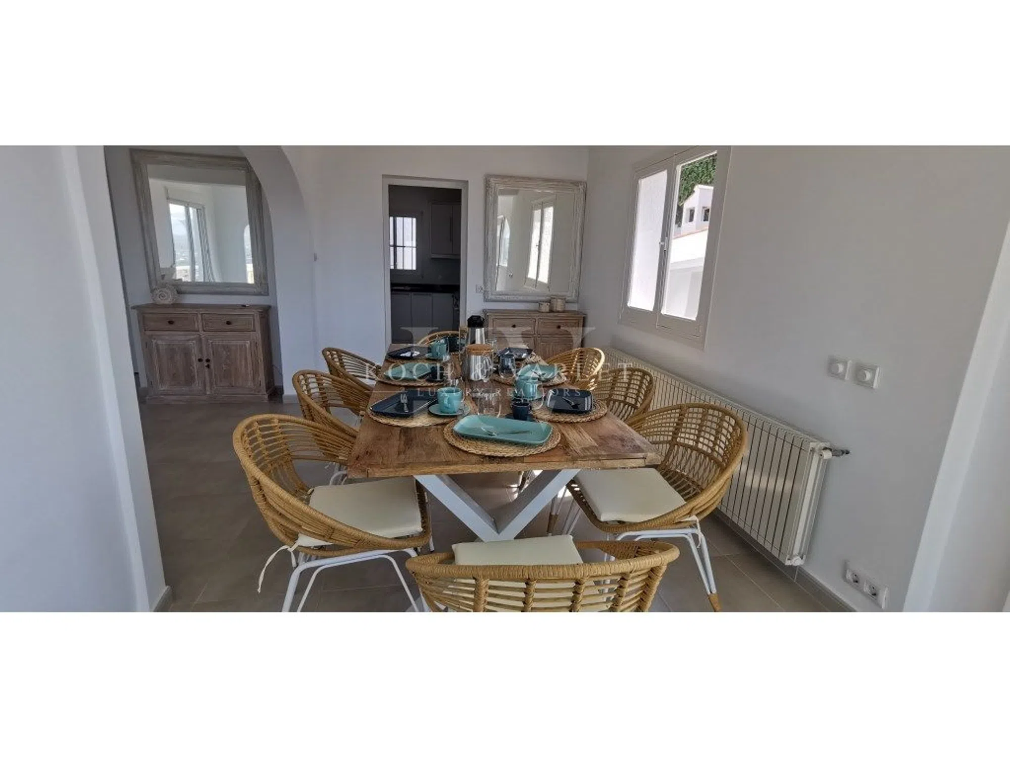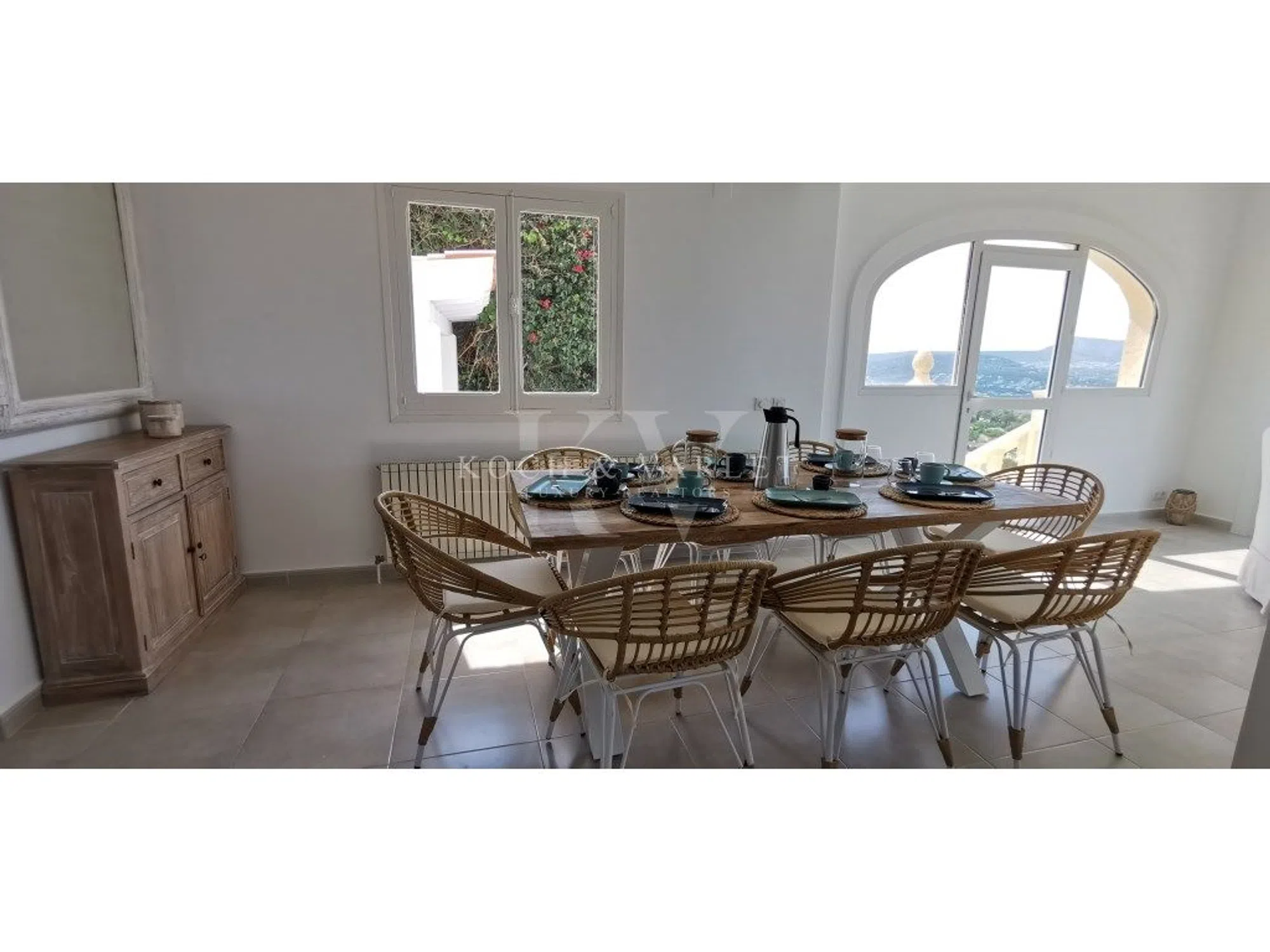 Villa El Mirador es una encantadora villa de estilo mediterráneo situada en la parte alta de Castellans, en una tranquila calle sin salida que garantiza un entorno de absoluta privacidad, silencio y serenidad. Gracias a su posición elevada, la propiedad disfruta de espectaculares vistas abiertas al valle de Jávea, al Parque Natural del Montgó y de vistas al mar, especialmente visibles desde la terraza principal, creando una constante sensación de amplitud, luz y conexión con la naturaleza. La villa se asienta sobre una parcela de casi 900 m² y se distribuye en dos plantas, comunicadas tanto por escalera interior como exterior, una configuración ideal para una familia numerosa o para recibir invitados, ofreciendo independencia y confort en ambos niveles. En la planta principal, la vivienda nos recibe con un luminoso salón-comedor decorado en un cálido y acogedor estilo mediterráneo. Cuenta con chimenea, mobiliario confortable y grandes ventanales en arco de tosca, la piedra natural típica de Jávea, que enmarcan unas magníficas vistas al valle, al Montgó y al mar. Desde este espacio se accede directamente a dos amplias terrazas: La terraza principal, habilitada como comedor de verano y zona de estar, ofrece vistas abiertas al mar y es perfecta para disfrutar de desayunos al sol, comidas al aire libre y de inolvidables amaneceres y atardeceres gracias a su orientación panorámica. La terraza de la piscina, desde la que se aprecian vistas abiertas al entorno natural y vistas parciales al mar desde la zona de la piscina, dispone de una zona cubierta con una completa cocina de verano, ideal para reuniones sociales y momentos de relax. La cocina principal, totalmente equipada y funcional, se encuentra en esta misma planta. Completan este nivel dos dormitorios dobles y dos baños, uno de ellos en suite, todos ellos decorados con gusto y pensados para ofrecer confort y tranquilidad. La planta baja, accesible tanto desde el interior como desde el exterior, ofrece un espacio adicional muy versátil. Dispone de un segundo salón-comedor, también muy luminoso gracias a sus grandes ventanales, con salida directa a una terraza con vistas abiertas al valle y al Montgó. En esta planta encontramos además una cocina auxiliar, un baño con ducha y dos dormitorios dobles adicionales. Aunque ninguno de ellos cuenta con baño en suite con acceso directo, la distribución de este nivel refuerza su carácter independiente, siendo ideal como zona de invitados, apartamento independiente o área de ocio familiar. La propiedad dispone de una zona de aparcamiento con puerta automática, que conduce a un porche cubierto en la entrada principal. Los espacios exteriores han sido cuidadosamente diseñados para disfrutar del clima mediterráneo durante todo el año, combinando terrazas abiertas, zonas cubiertas y áreas de ocio, siempre acompañadas de magníficas vistas y con la ventaja añadida de ser una propiedad de fácil mantenimiento, ya que no cuenta con jardín ni césped. La villa está equipada con aire acondicionado mediante splits, calefacción por radiadores alimentados por gas con depósito y mosquiteras en todas las ventanas, garantizando un alto nivel de confort durante todo el año. Su ubicación es excelente, a tan solo 10 minutos del mar, con una amplia oferta de restaurantes y actividades náuticas. Las prestigiosas calas de La Granadella, La Barraca y Cala Moraig se encuentran a aproximadamente 20 minutos en coche, al igual que el centro comercial y las cercanas localidades de Dénia y Moraira. ref:KV137V.