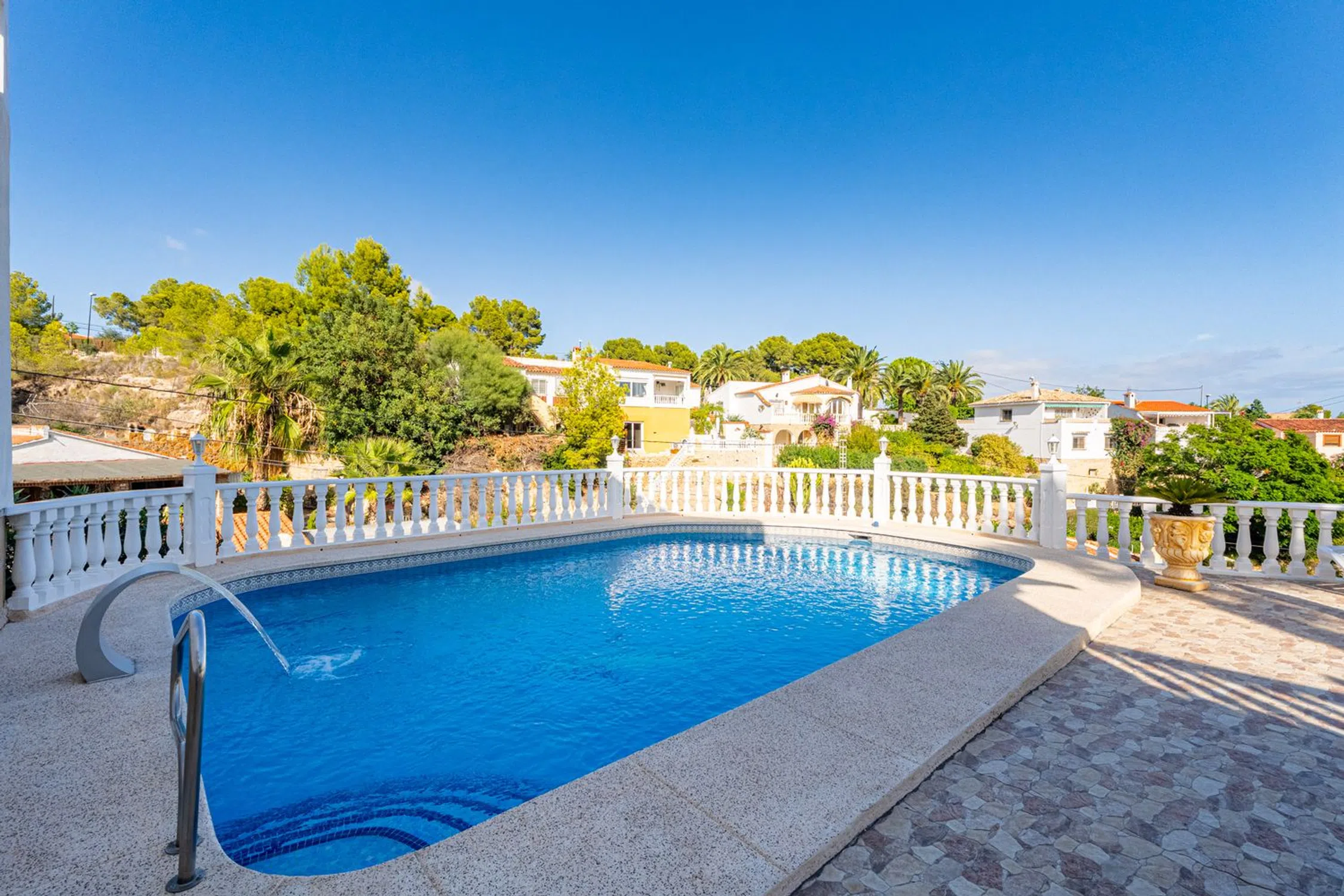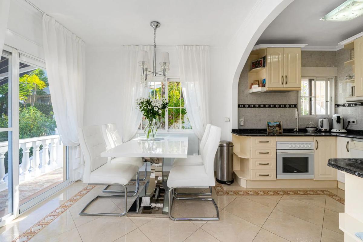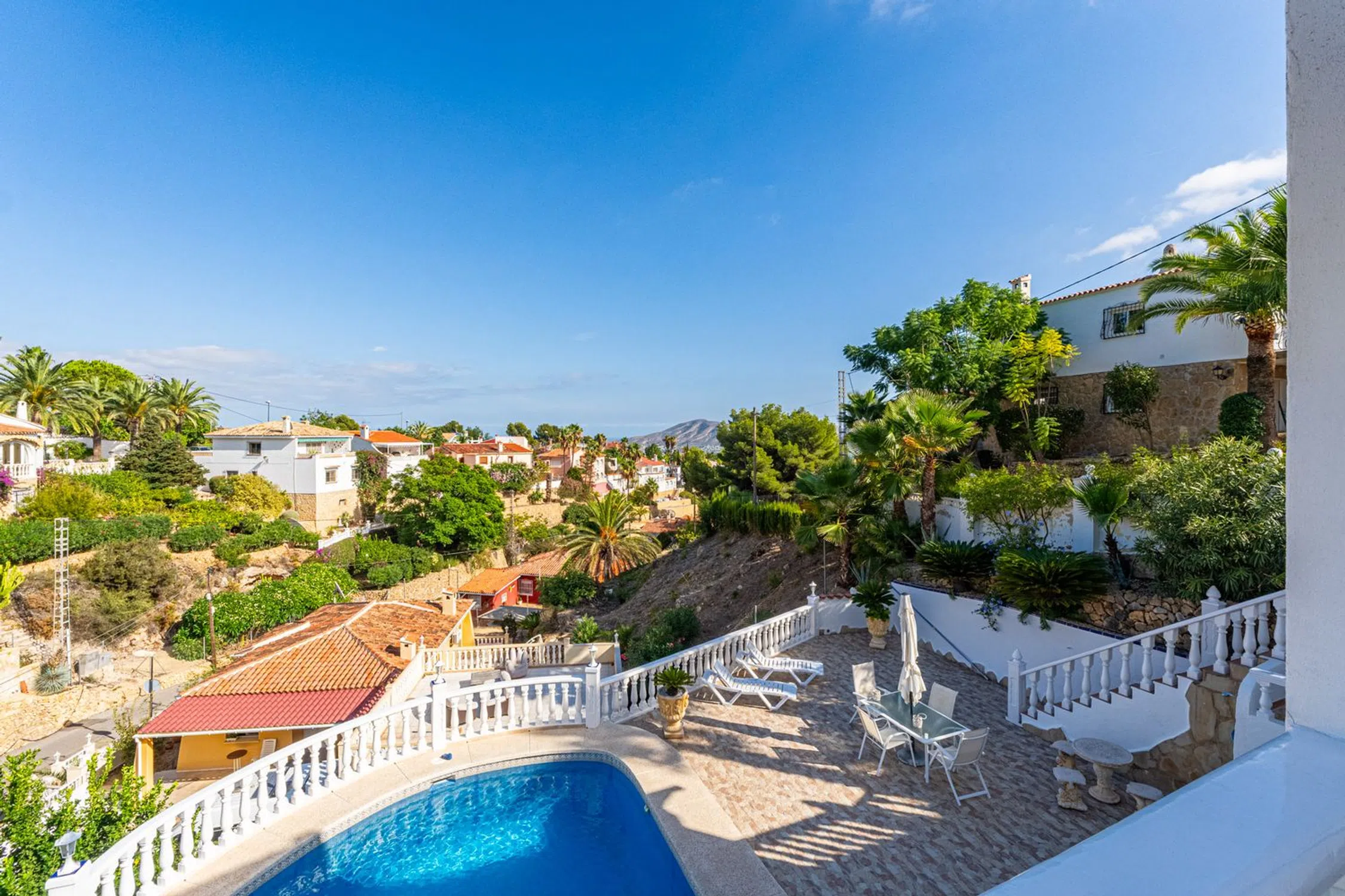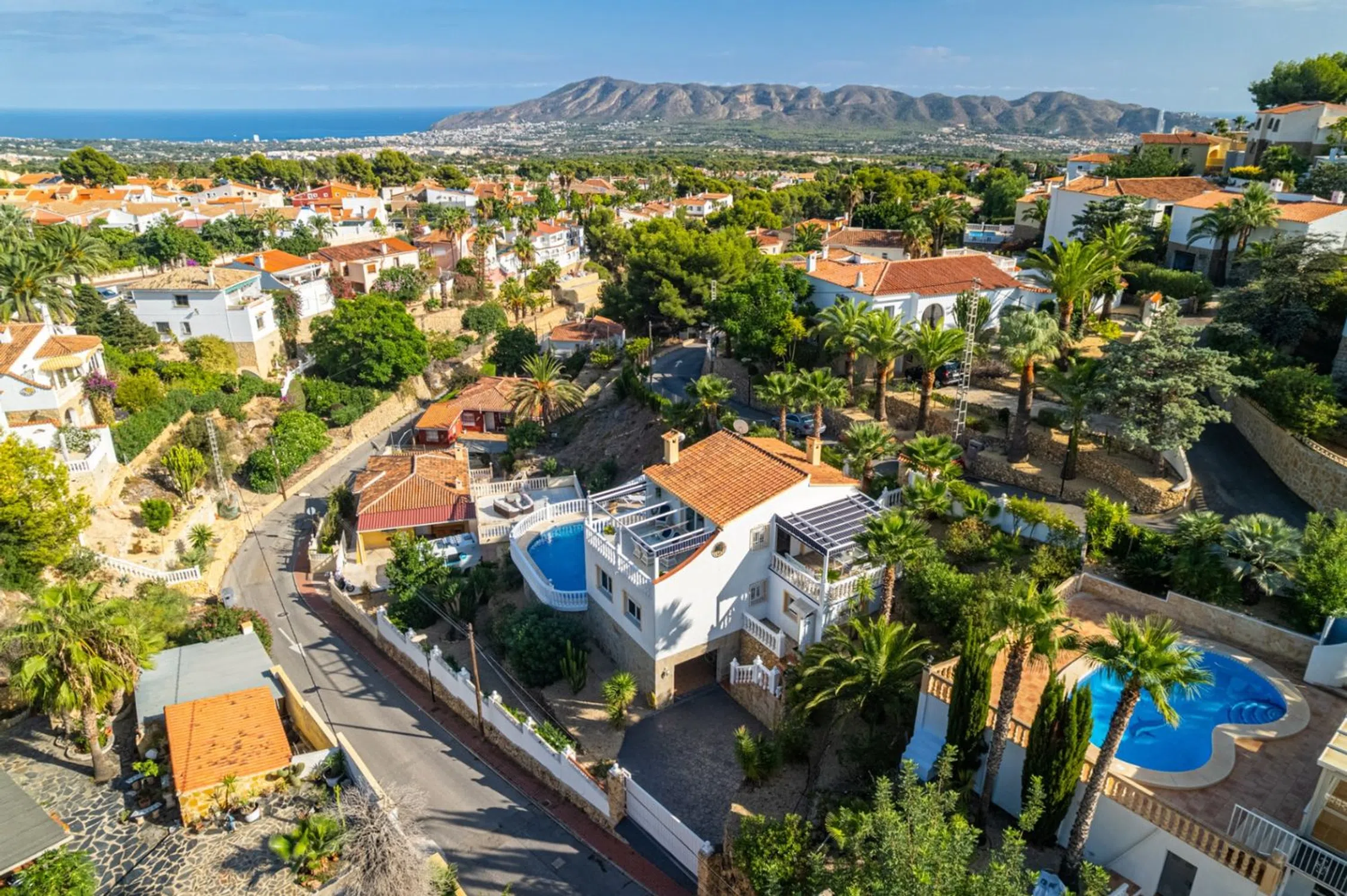 Casa Independiente con Vistas y Garaje en La Nucía Ubicada en una zona residencial tranquila y soleada, cerca de todos los servicios como restaurantes, supermercados, farmacia y tiendas, y a solo minutos de la Escuela Internacional Elian. Construida en 1975 y reformada en 2016, la propiedad se distribuye en tres plantas. Esta casa independiente se sitúa en una parcela con acceso desde dos calles: la entrada principal para peatones y una secundaria con acceso directo al garaje y espacios de estacionamiento. En la planta superior, un luminoso salón-comedor con chimenea de gas y grandes ventanales se abre a terrazas soleadas y sombreadas. La cocina abierta está totalmente equipada y también hay un baño de cortesía. En la planta inferior (nivel de la calle), hay cuatro dormitorios (uno con entrada independiente, ideal para huéspedes o una oficina), un baño completo y un lavadero con acceso directo a la piscina, además de un trastero. El exterior ofrece un jardín tropical con sistema de riego, varias terrazas perfectas para disfrutar durante todo el año, una piscina privada con una profundidad de 2.10 metros, y un amplio garaje con potencial de conversión en apartamento de huéspedes, gimnasio o taller. Esta vivienda incluye cuatro dormitorios y dos baños, un salón-comedor con chimenea, una cocina abierta, múltiples terrazas con sol y sombra equipadas con toldos, un jardín con sistema de riego, piscina privada, garaje con múltiples posibilidades y acceso desde dos calles. Situada en una urbanización tranquila pero bien comunicada, ofrece un oasis mediterráneo de confort y encanto en la Costa Blanca. 10 minutos a la playa45 minutos al Aeropuerto de Alicante1 hora 15 minutos al Aeropuerto de Valencia.