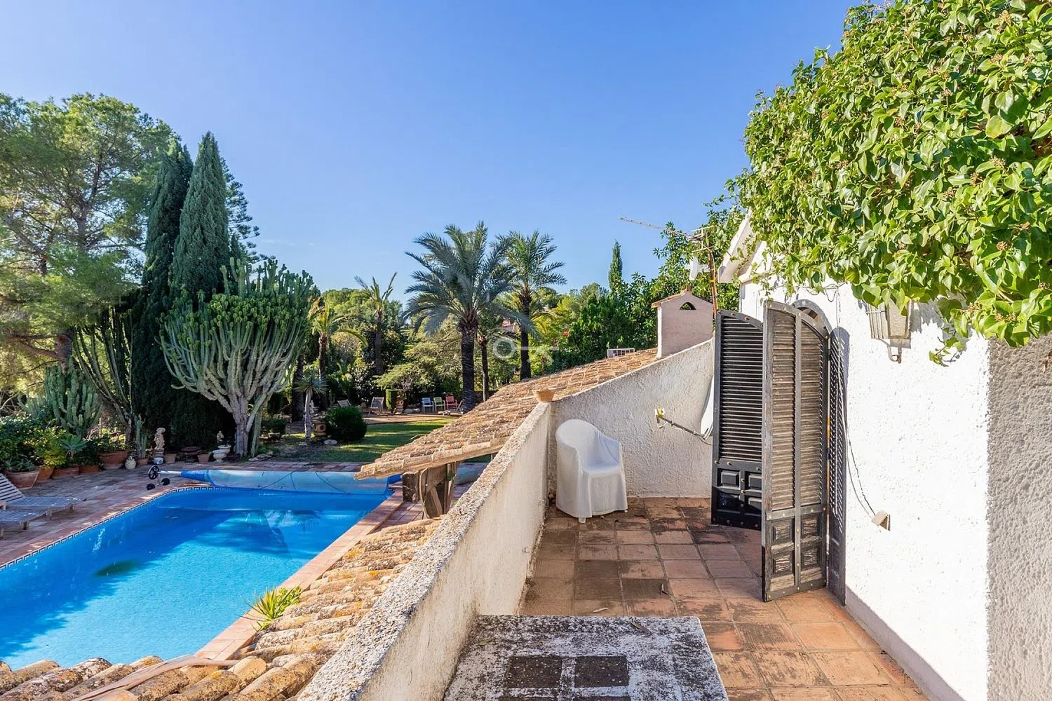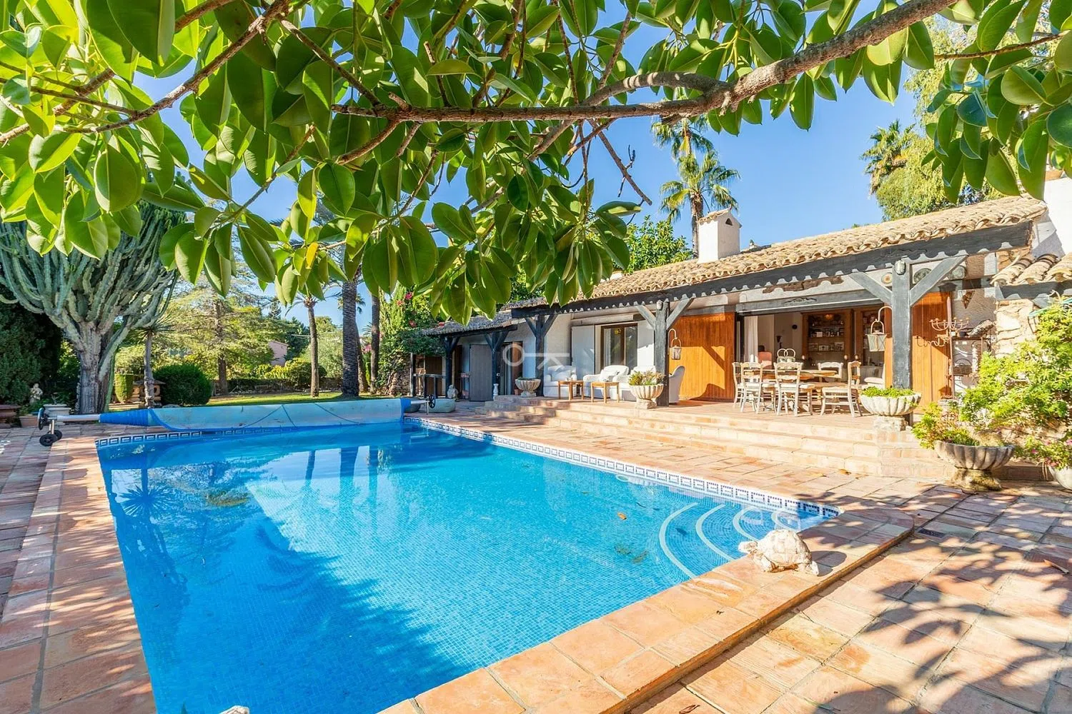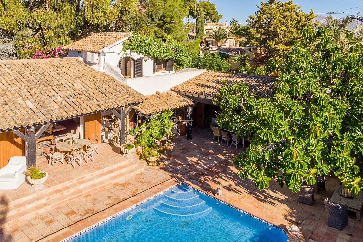 Esta encantadora villa mediterránea está situada en una urbanización tranquila y ofrece total privacidad gracias al gran jardín (doble parcela). La casa consta de un amplio salón/comedor, una cocina totalmente equipada, 4 dormitorios y 3 baños, 2 de ellos en suite. Todo está en una sola planta, excepto el dormitorio principal. Tiene una terraza privada con vistas panorámicas al horizonte de Benidorm y al mar Mediterráneo. Desde el salón se tiene acceso directo a la terraza, a la piscina climatizada y al jardín. Aquí podrá disfrutar del sol tranquilamente y sin ser molestado durante todo el día gracias a la orientación sur. Desde la cocina se camina directamente a la terraza cubierta y a la zona de barbacoa. La villa dispone de calefacción central (gas), aire acondicionado, alarma, chimenea y parking para 2 coches. Otro punto a favor de esta propiedad es su ubicación, cerca de varios comercios, a pocos minutos del campo de golf de Villaitana, del centro de Benidorm y de la playa y a 40 minutos en coche del aeropuerto de Alicante. La villa necesita ser modernizada un poco, pero sobre todo necesita un poco de amor para convertirla en una joya. .