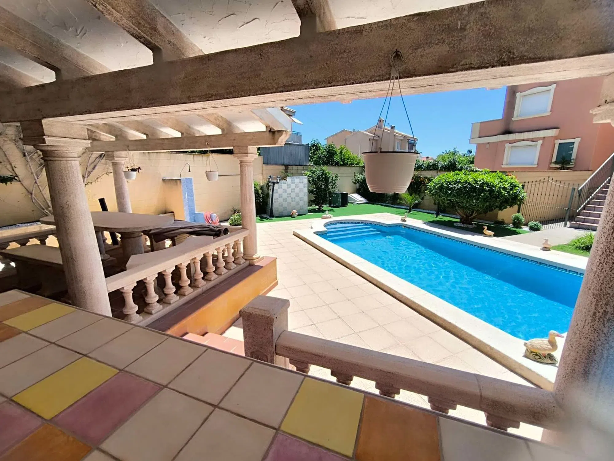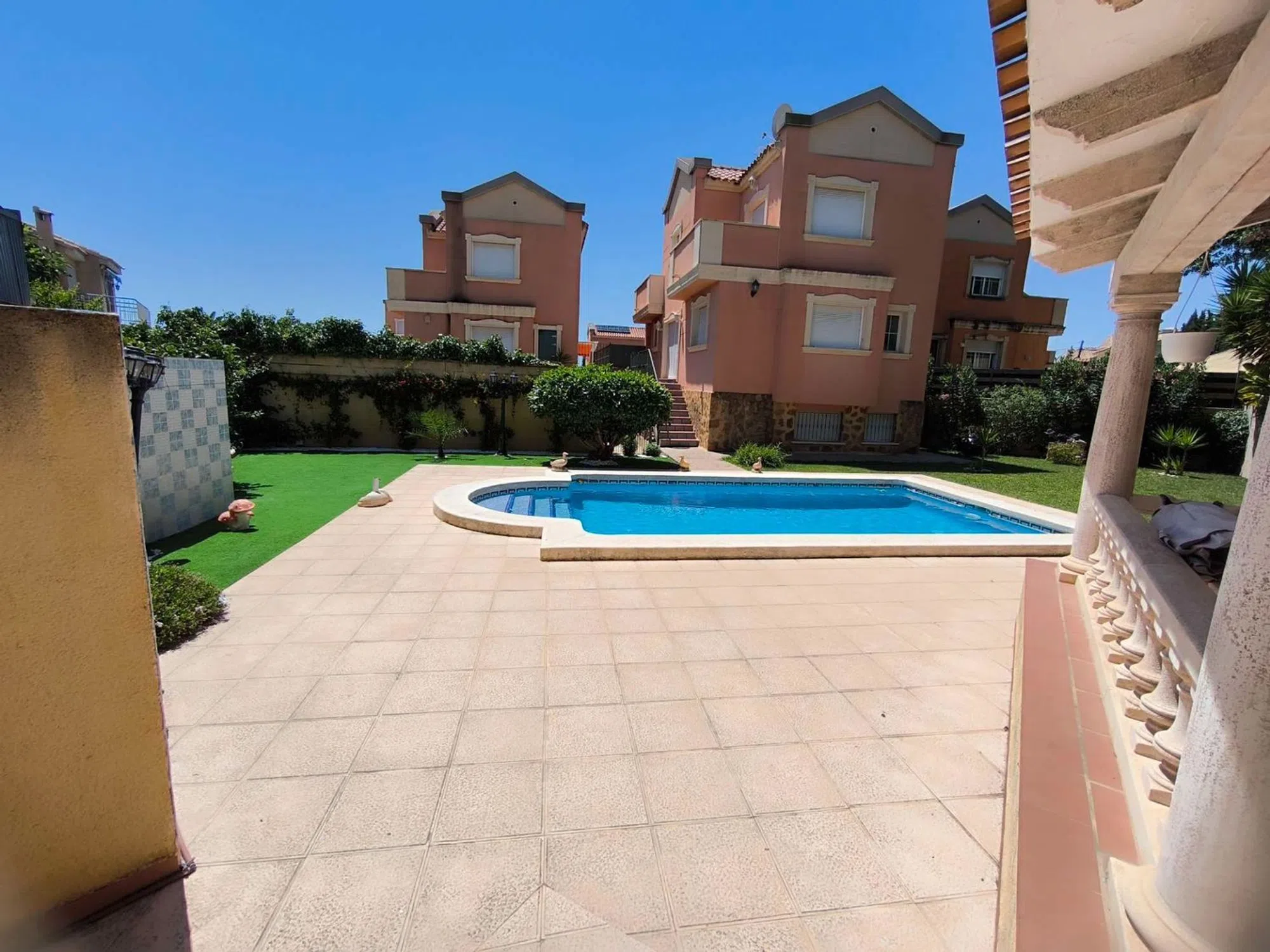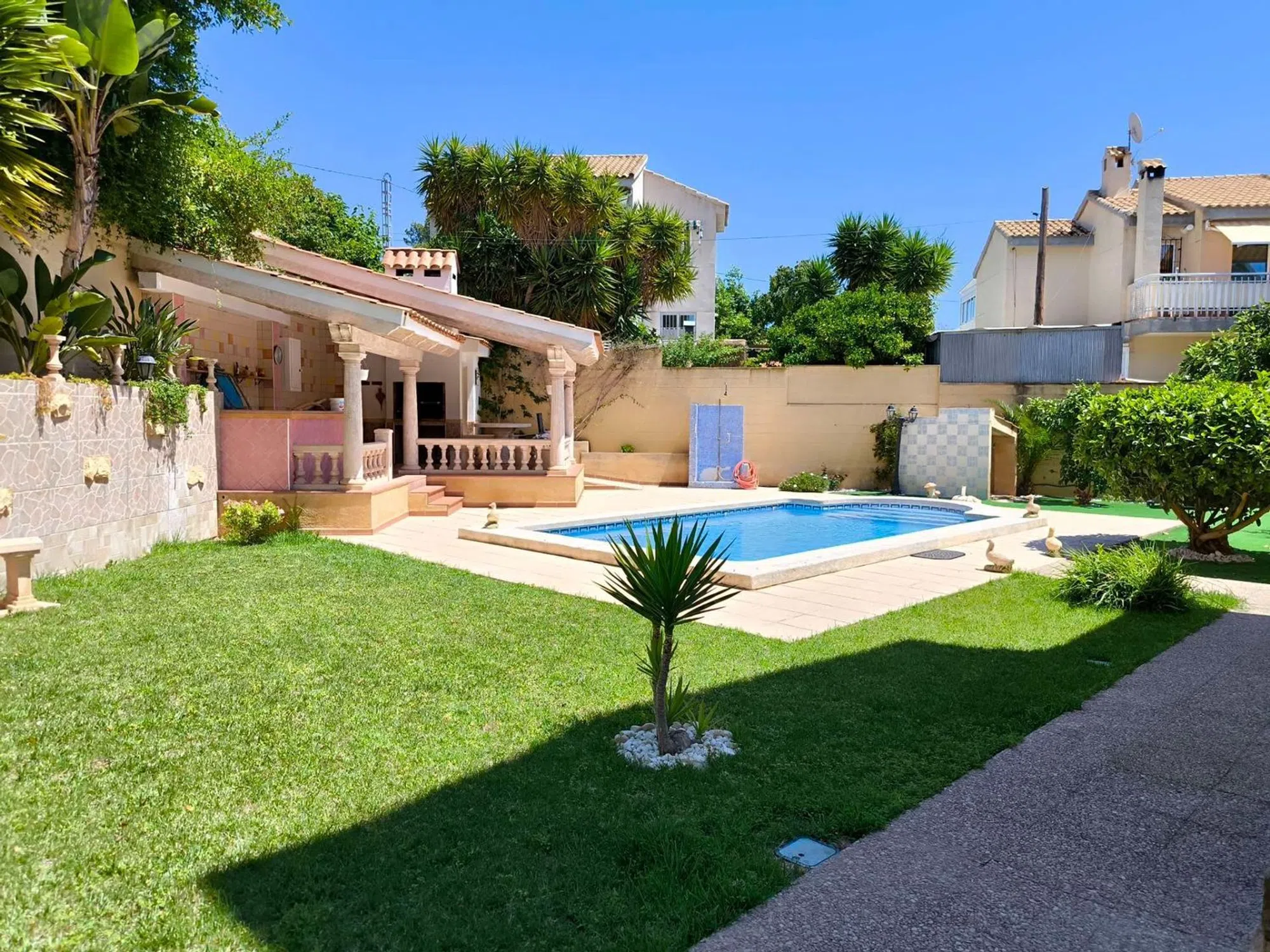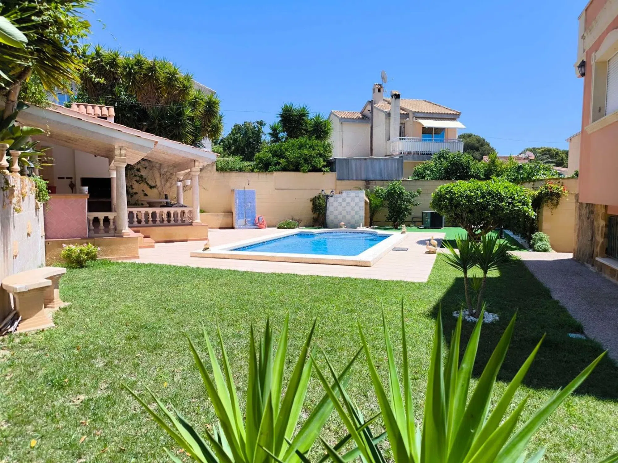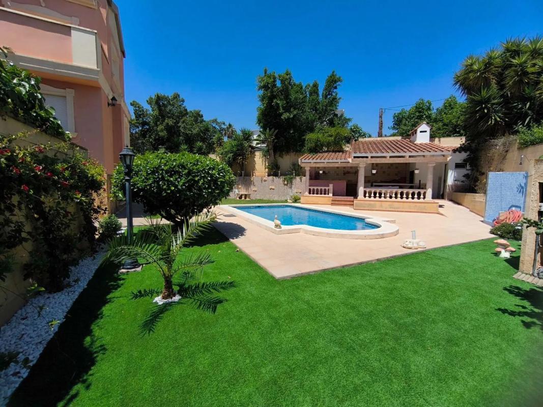 Amplio y luminoso chalet ubicado a unos pasos andando de todas las comodidades y supermercados. Hermosa parcela con piscina privada y cocina de verano. La casa cuenta con 3 dormitorios cada uno con baño en suite, uno de ellos con terraza. Cocina independiente equipada y con despensa, salón comedor con chimenea, aire acondicionado centralizando caliente y frio. La casa dispone de un garaje para 2 coches. [IW].