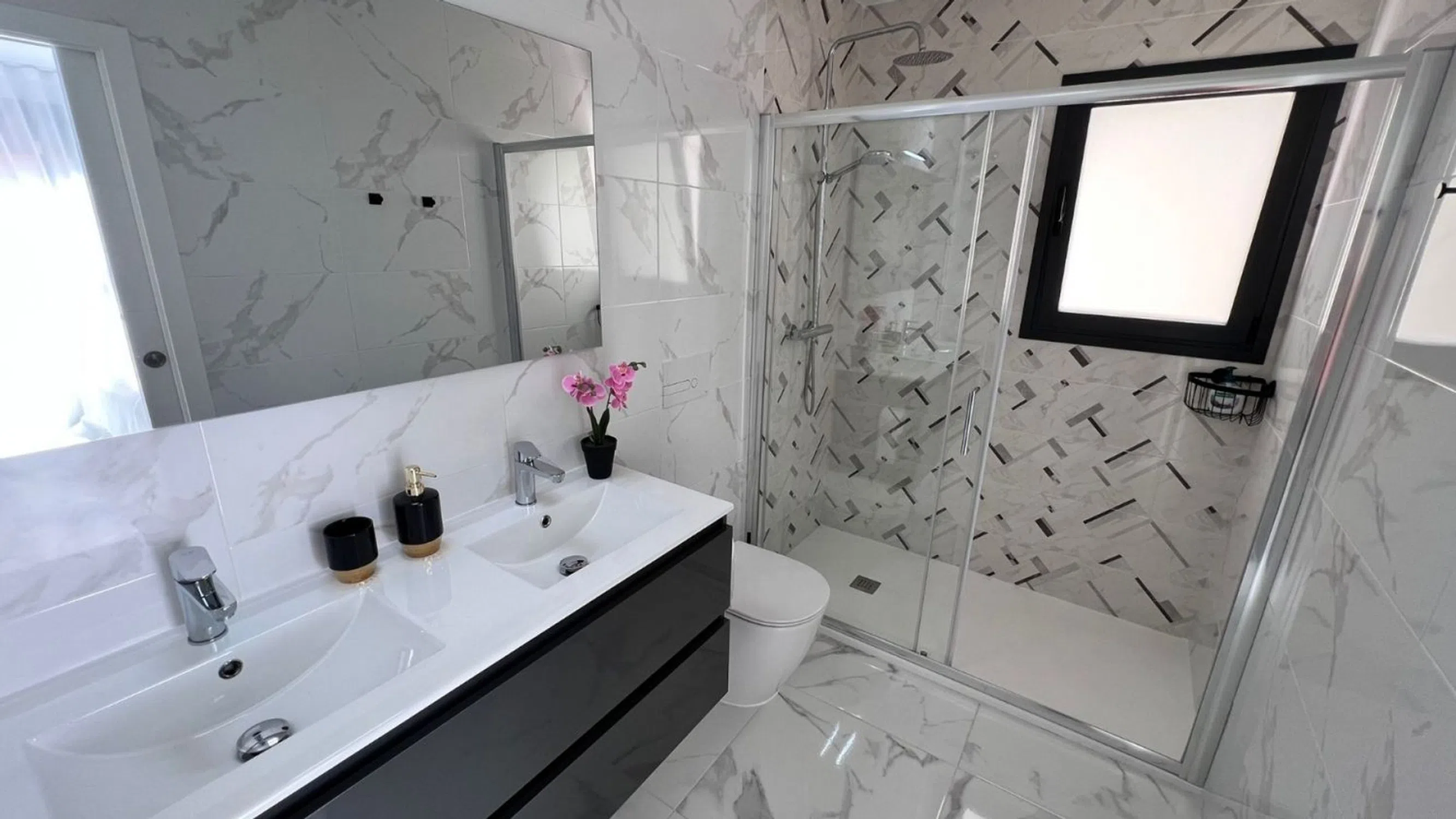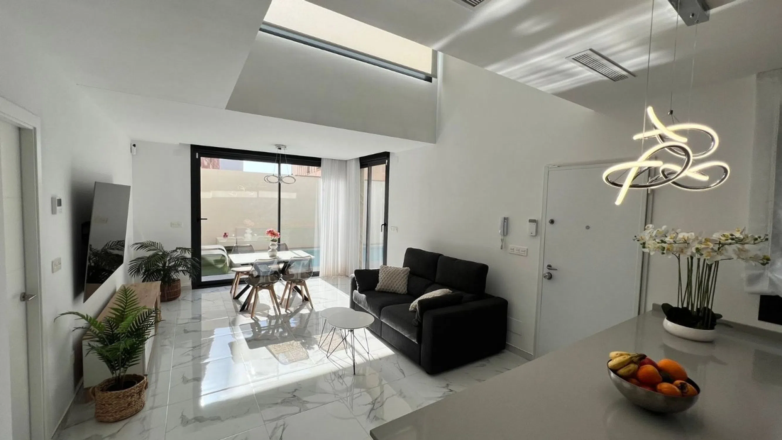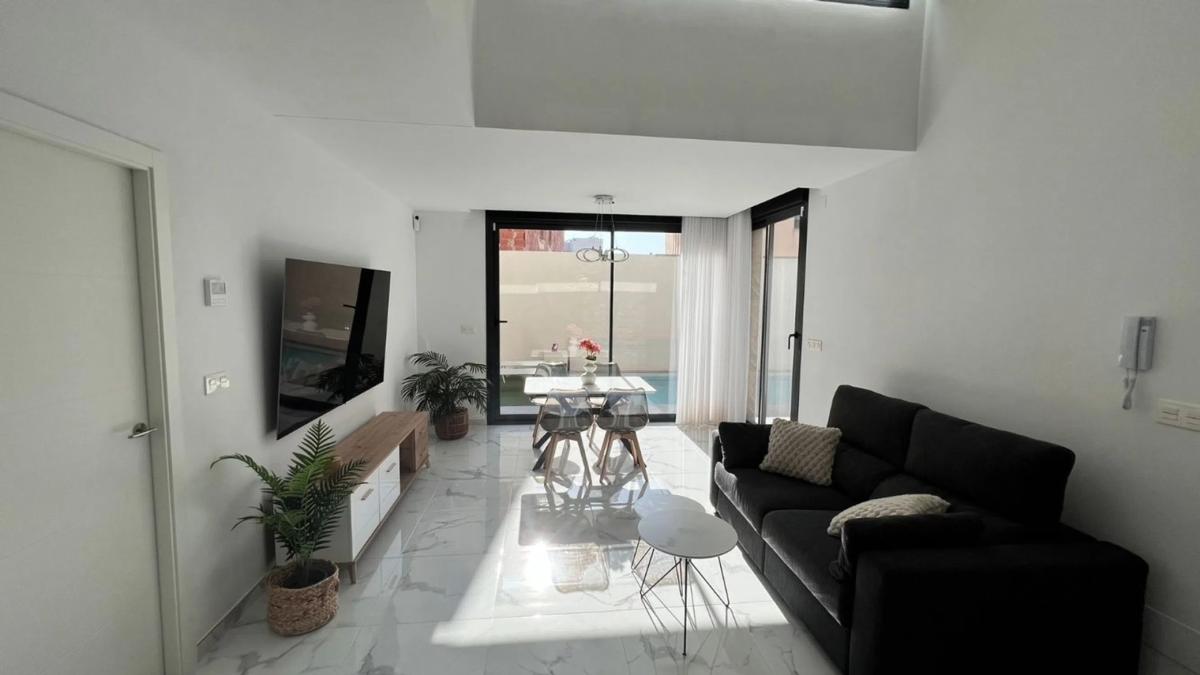 Prácticamente nuevo, chalet independiente orientado al sur en La Herrada Este moderno chalet independiente se encuentra en la encantadora localidad de Los Montesinos y ofrece una mezcla perfecta de confort y comodidad. La propiedad fue construida en 2023 y cuenta con tres dormitorios, dos baños y un amplio salón que fluye a la perfección en una cocina totalmente equipada. Diseñada con esmero, la casa cuenta con armarios empotrados en todos los dormitorios, aire acondicionado en ambas plantas y calefacción por suelo radiante en los baños para mayor comodidad. Salga para disfrutar de la piscina privada y el soleado jardín, ideal para relajarse o divertirse. Un solarium y terraza mejoran aún más el espacio exterior, perfecto para disfrutar del sol mediterráneo. La villa también cuenta con un trastero/lavadero bajo las escaleras y aparcamiento privado en la parcela. Situada a sólo 18 minutos en coche de la playa, a 45 minutos del aeropuerto y a pocos minutos de los servicios locales y campos de golf, esta casa tiene una ubicación ideal. Está completamente amueblada, con todos los electrodomésticos incluidos excepto la TV. Mejorado con características modernas, tales como un sistema de calefacción aerotérmica, puerta blindada y portero automático, esta villa está lista para entrar y en excelentes condiciones.