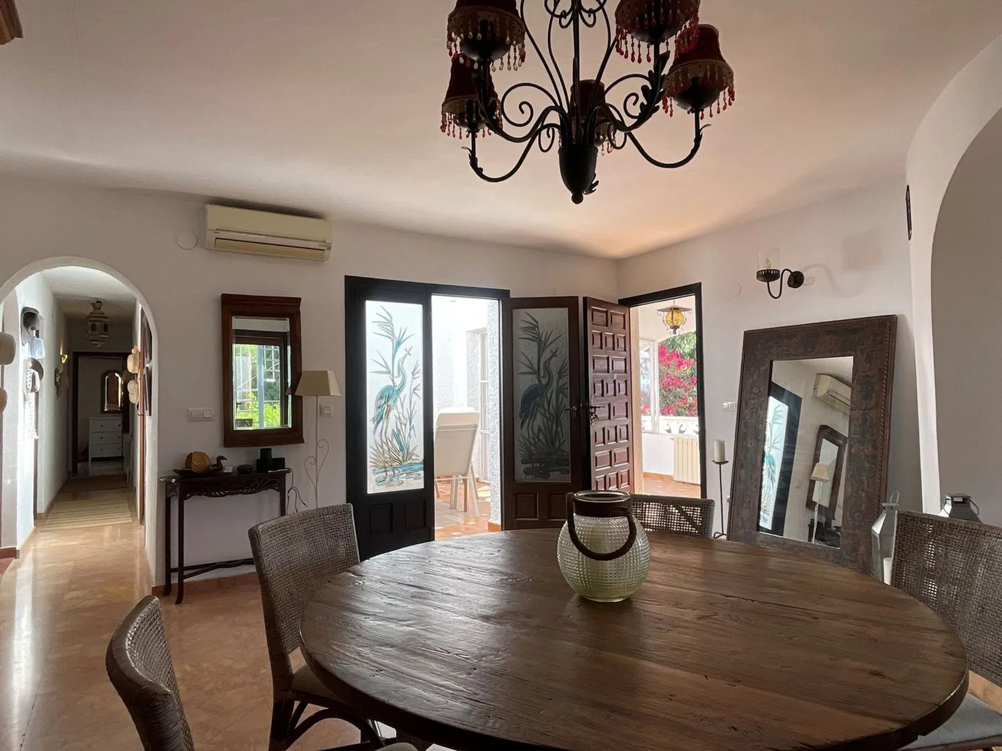 Villa en venta en El Portet, Moraira Aproximadamente a 15 minutos a pie de la playa de El Portet, esta villa de cinco habitaciones combina el encanto mediterráneo con la comodidad moderna. Orientada al suroeste, disfruta de sol durante todo el día en las terrazas y el área de la piscina, mientras que los jardines maduros ofrecen privacidad y espacio para relajarse. Al entrar en la propiedad a través de una puerta eléctrica que da acceso a un espacio de aparcamiento privado. Desde aquí, unas escaleras llevan por un camino con terrazas, rodeado de plantas mediterráneas, hasta la entrada principal cubierta que se abre a un acogedor vestíbulo. A la derecha, se encuentra un baño para invitados; más adelante en el pasillo, se encuentran el comedor, la cocina recientemente renovada y el salón con estufa de leña y aire acondicionado frío/calor. Las grandes ventanas capturan las vistas hacia la montaña Sierra Bernia y dan a la piscina de 8x4 m, lo que le da a esta habitación una sensación brillante y abierta. Desde el comedor, puertas de vidrio se abren a un patio central al aire libre, un área de estar versátil ideal para comer, relajarse o entretener. Este patio y el comedor también se conectan a una terraza cubierta con una barbacoa incorporada, parcialmente cerrada pero abierta a la brisa—perfecto para reuniones y comidas al aire libre. Una puerta del comedor lleva a una escalera de caracol externa que conduce a la terraza en la azotea, donde se pueden disfrutar vistas del Ifach y la Sierra Bernia, especialmente al atardecer. En la planta superior, hay dos toldos eléctricos adicionales para mayor confort en la sombra. Una escalera interna desde el comedor desciende al piso inferior, que ha sido inteligentemente convertido del espacio original del garaje para proporcionar alojamiento flexible. Este nivel cuenta con dos grandes habitaciones dobles (ambas con aire acondicionado), un baño con ducha, dos trasteros en bajo construcción, acceso externo al jardín a través de una nueva puerta y las puertas de garaje de madera dobles originales. Este nivel inferior es ideal para huéspedes o familiares, con su propio acceso y aparcamiento a través de una segunda puerta eléctrica y camino de entrada. Desde el camino de entrada inferior, unas escaleras amplias flanqueadas por exuberante vegetación mediterránea conducen al nivel principal de la vivienda. La terraza de la piscina a la derecha en el nivel inferior disfruta de pleno sol durante todo el día, con una piscina ovalada de 8x4 m, espacio para tomar el sol alrededor y un área de descanso cubierta con un toldo retráctil eléctrico operado a control remoto. El área de la piscina está asegurada con una puerta para prevenir el acceso de los niños. Detrás de la villa hay otra área de jardín sombreada—ideal para comer al aire libre, una zona de lavandería o simplemente un retiro tranquilo. Toda la propiedad está rodeada de un paisaje mediterráneo maduro, que ofrece color y vegetación durante todo el año con un mínimo de mantenimiento.