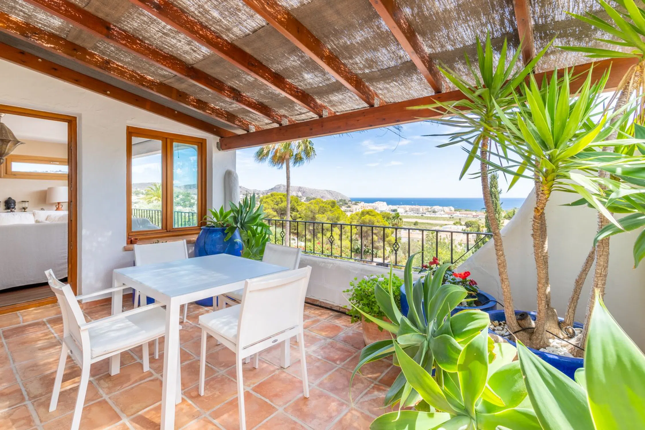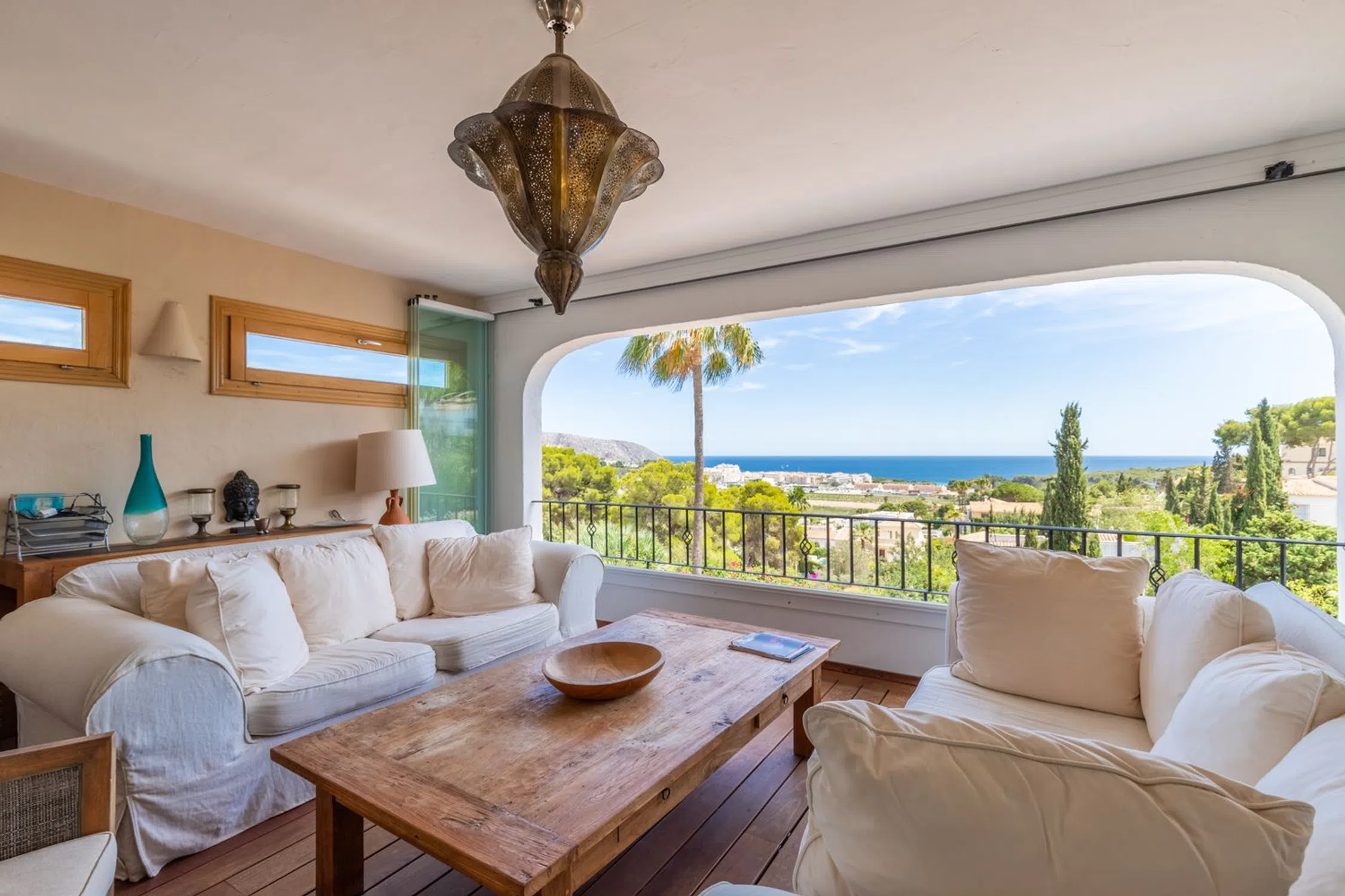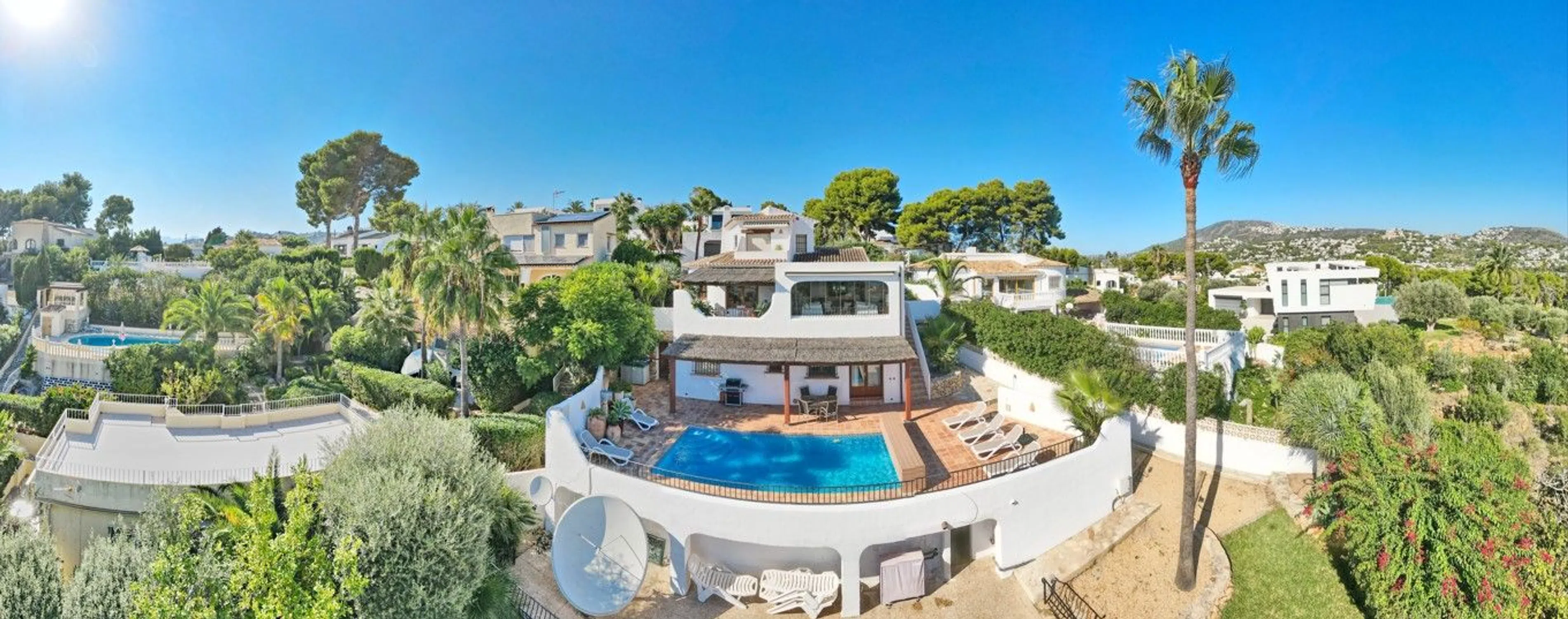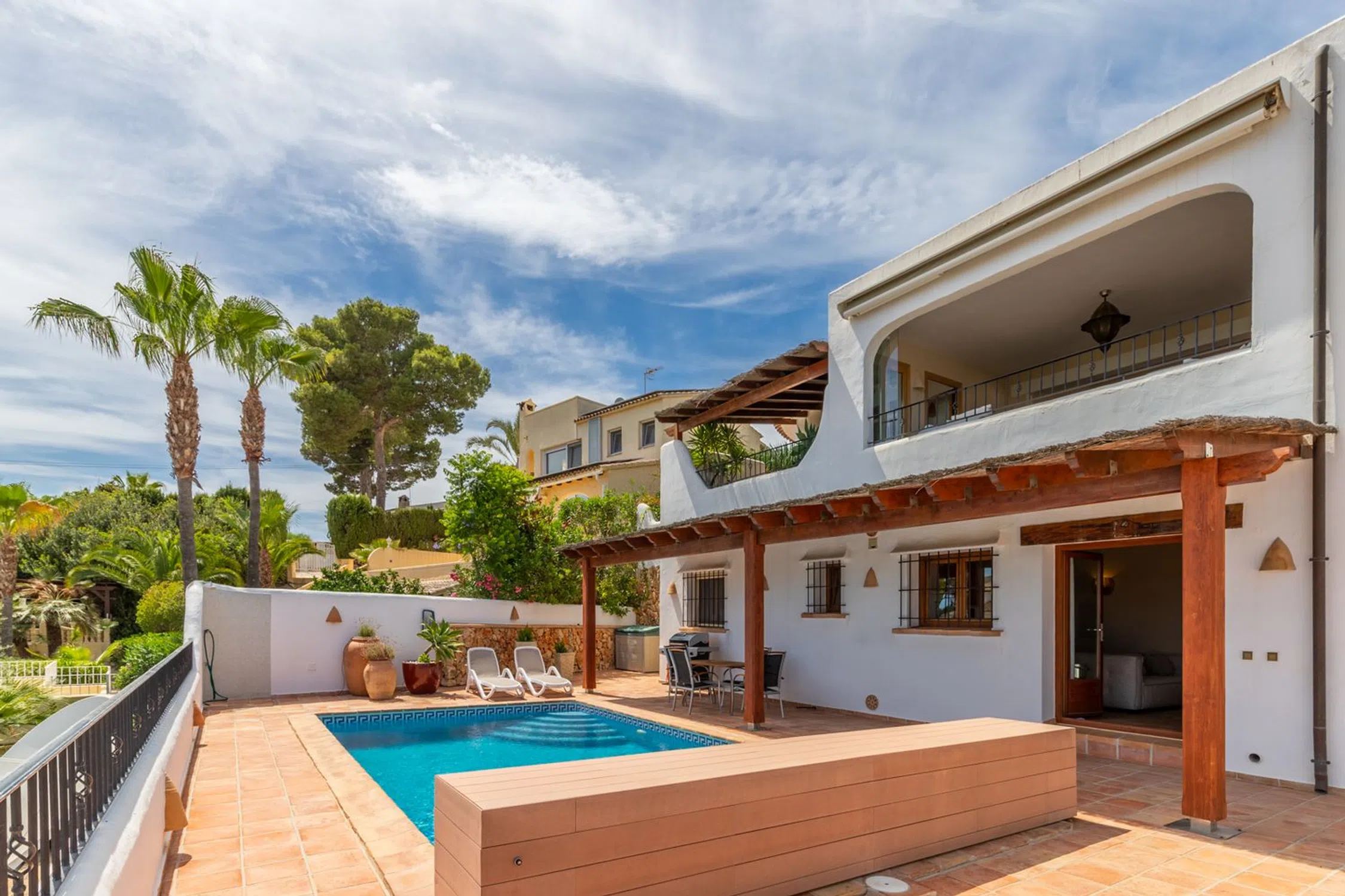 � Villa de lujo con vistas al mar, piscina climatizada y jardín mediterráneo en Moraira, Costa Blanca Una joya del estilo mediterráneo en uno de los enclaves más deseados de la Costa Blanca. Esta villa combina la elegancia tradicional con las prestaciones modernas más avanzadas, ofreciendo un hogar confortable, eficiente y preparado para disfrutarlo durante todo el año. Ubicada en una zona tranquila y residencial, a pocos minutos de la playa y del centro de Moraira, la propiedad disfruta de vistas abiertas y panorámicas al mar Mediterráneo y un entorno natural lleno de calma y privacidad. Características principales Piscina climatizada con cubierta solar de alta calidad, que permite prolongar la temporada de baño y maximiza la eficiencia energética. Sistema de calefacción central y aire acondicionado de última generación en todas las estancias. Jardín mediterráneo maduro, con especies autóctonas, palmeras, olivos y amplias zonas de relax. 4 dormitorios y 4 baños, distribuidos entre la vivienda principal y un apartamento independiente. Apartamento en planta baja, con dormitorio en suite, cocina totalmente equipada y salón-comedor: un espacio ideal para invitados o familiares que deseen privacidad. Amplias terrazas —algunas cubiertas— con zonas de estar, comedor exterior, barbacoa y ducha al aire libre. Salón principal con chimenea, comedor luminoso y cocina equipada con electrodomésticos modernos. Materiales naturales y cálidos, como suelos de terracota y acabados de inspiración mediterránea. Aparcamiento cubierto para dos vehículos dentro de una parcela vallada. Un estilo de vida mediterráneo Esta villa representa a la perfección el espíritu de Moraira: luz, calma y belleza natural. Ideal tanto como residencia permanente como para quienes buscan una segunda vivienda de lujo, ofrece privacidad, confort y proximidad a la playa, restaurantes y servicios. Un lugar para disfrutar del sol todo el año y vivir el auténtico encanto del Mediterráneo.