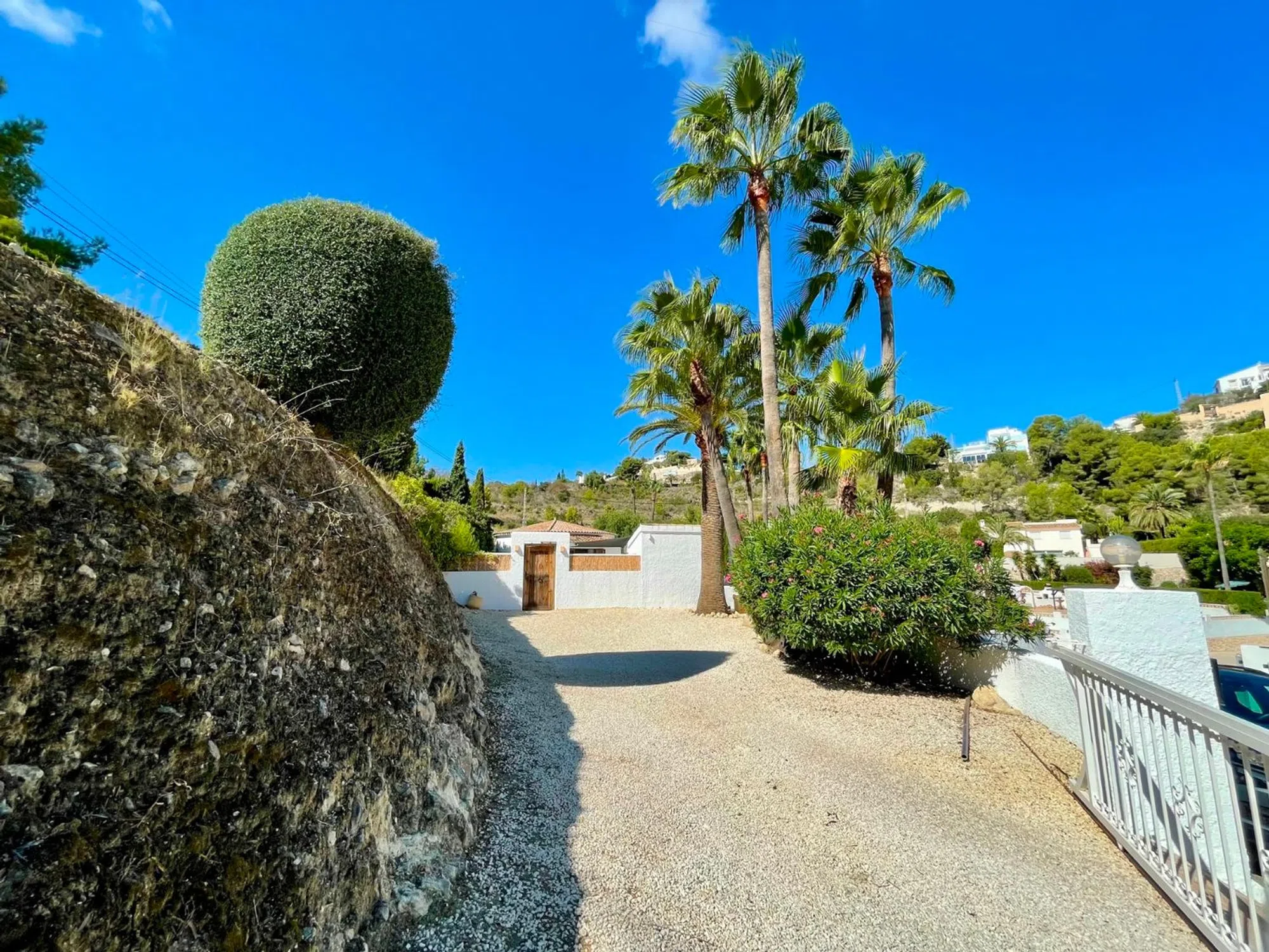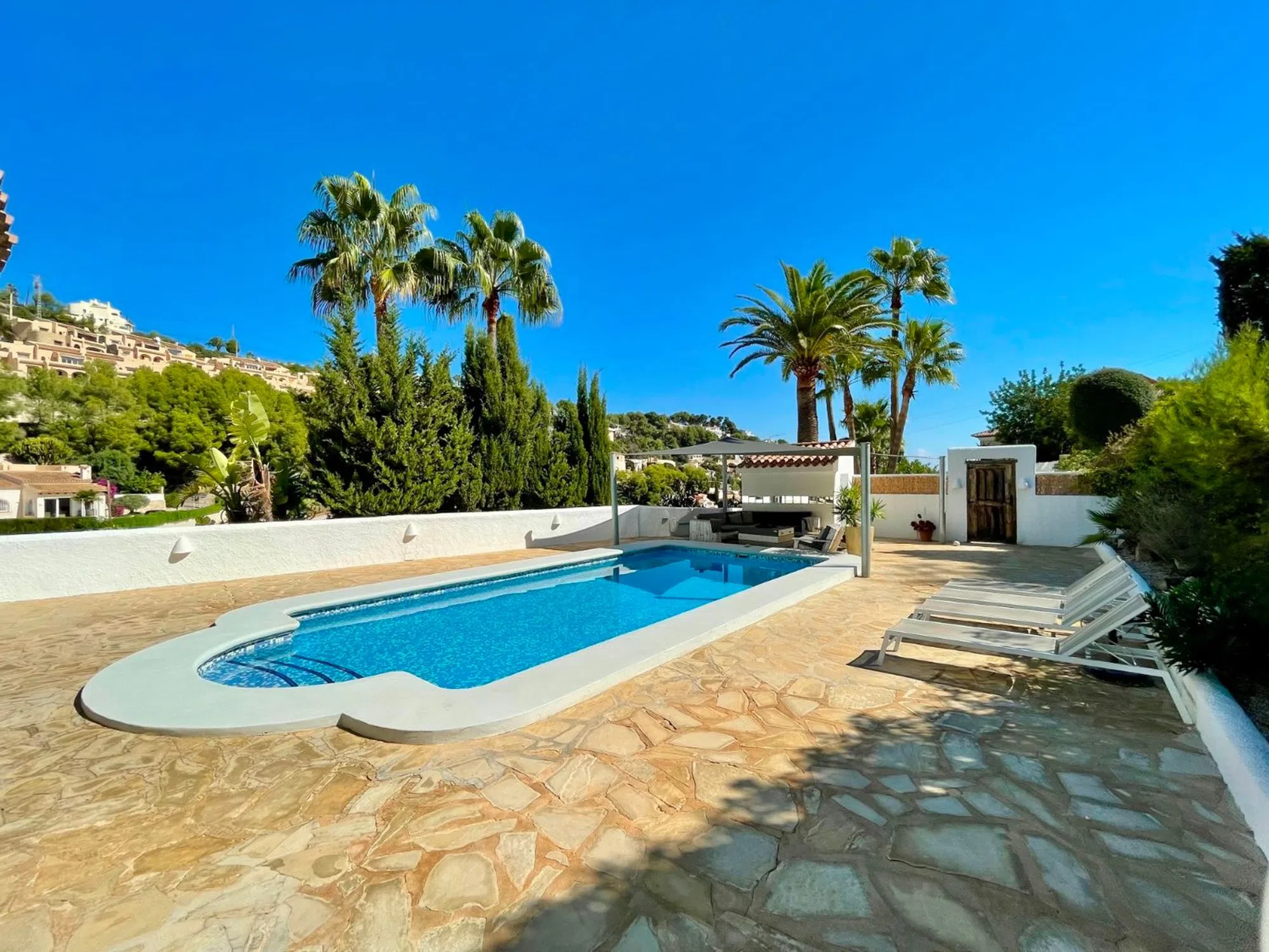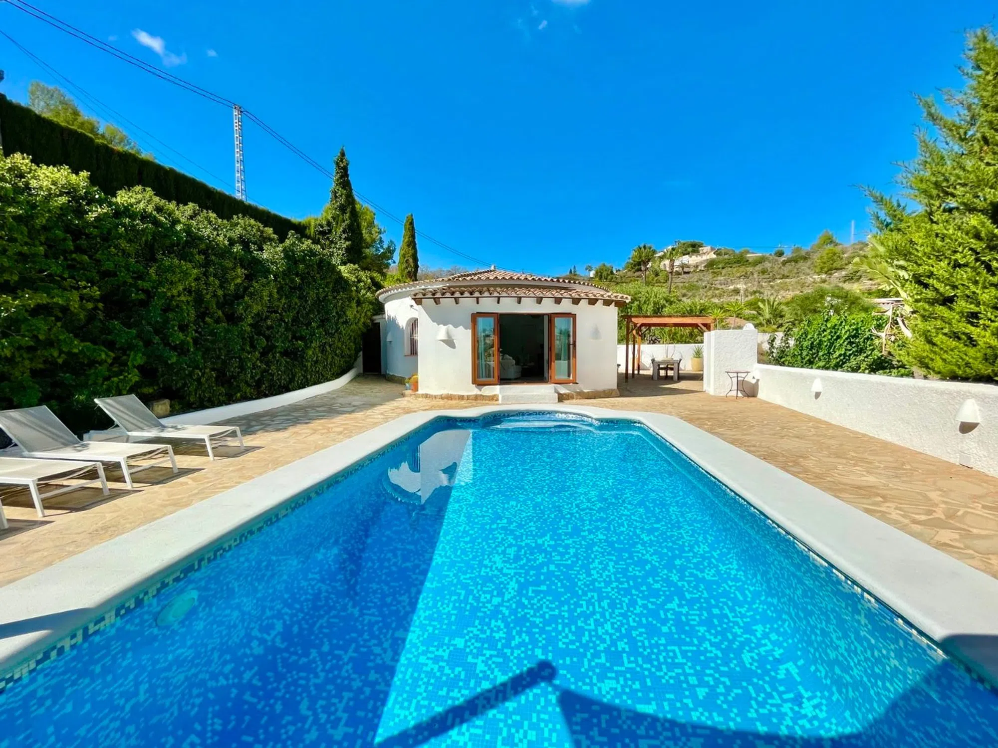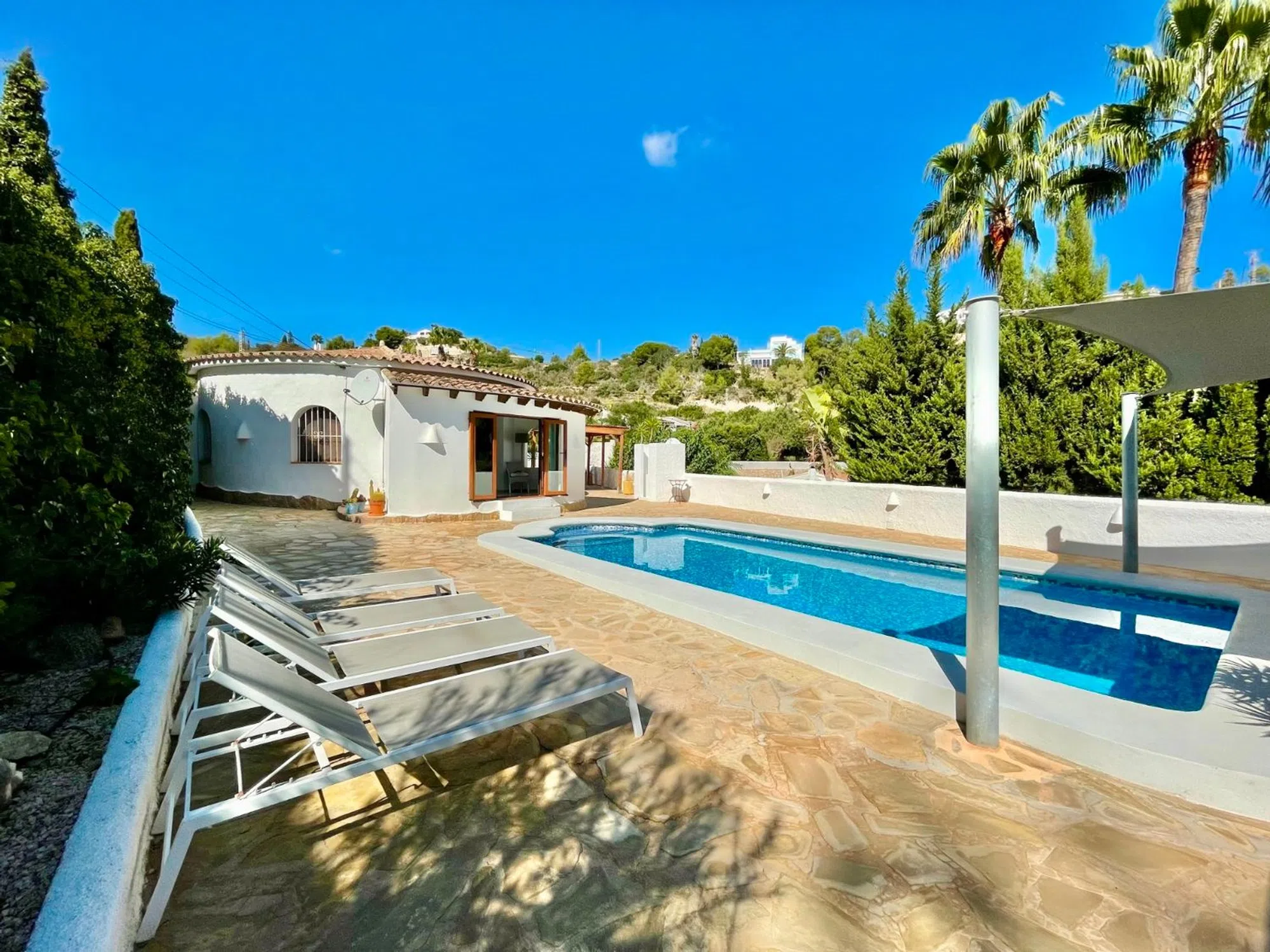 Le presentamos esta preciosa villa mediterránea de una sola planta situada en una parcela llana en la tranquila y verde zona de Benimeit, en Moraira. Ideal para personas que buscan una vivienda fácil de mantener, con tranquilidad, espacio y comodidad. La vivienda está situada en una parcela amplia y llana de 849 m2, en una calle tranquila con tráfico local, a menos de 8 minutos en coche del centro de Moraira y de la playa. Al entrar en la parcela vallada, hay espacio suficiente para aparcar varios coches en la propiedad. Lo que llama la atención inmediatamente son las hermosas palmeras maduras que acentúan el ambiente mediterráneo de la vivienda. Descripción de la vivienda A través de una característica puerta de madera accedemos a la amplia terraza de la piscina, que cuenta con una piscina de buen tamaño. Aquí también encontrará una acogedora zona de descanso con una vela de sombra para que pueda relajarse tanto a la sombra como al sol. Gracias a su ubicación, disfrutará de total privacidad alrededor de la terraza de la piscina. Al entrar en la villa, de una sola planta, llegamos al salón-comedor, equipado con aire acondicionado recientemente renovado y calefacción mediante radiadores en cada habitación. Detrás se encuentra la cocina abierta, equipada con todos los electrodomésticos necesarios. A la izquierda se encuentran los dos dormitorios, que comparten un moderno cuarto de baño con ducha, lavabo e inodoro. Los dormitorios cuentan con elementos característicos como puertas castellanas de madera, armarios empotrados y contraventanas de madera en las ventanas. En el exterior hay un trastero, una ducha exterior y una pérgola de madera junto a la cocina para poder disfrutar de un delicioso desayuno al aire libre por la mañana o cenar bajo el cielo estrellado por la noche. Características: - Parcela llana Mucha privacidad - Vivienda totalmente en planta baja - Vivienda lista para entrar a vivir - Nuevos carpinteria de aluminio en la parte trasera de la vivienda - Mosquiteras.