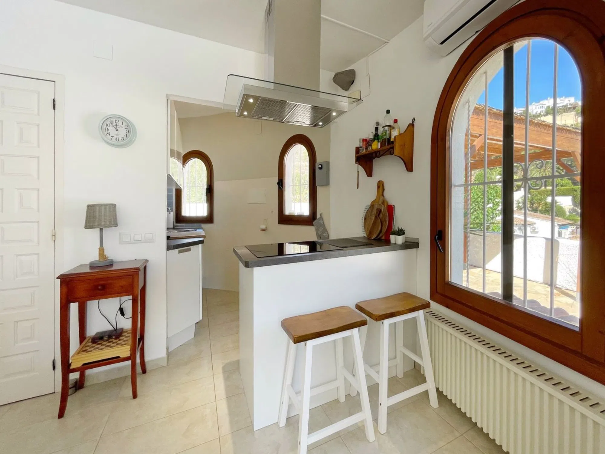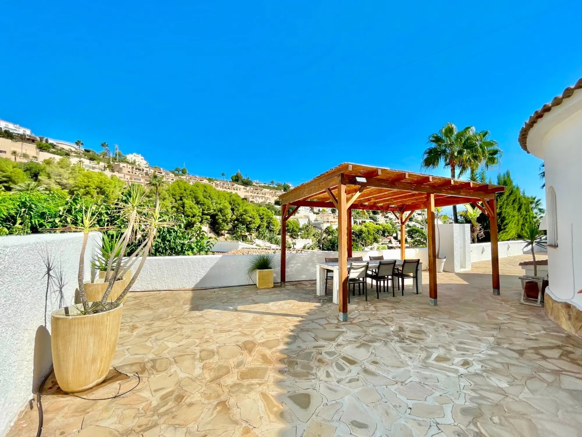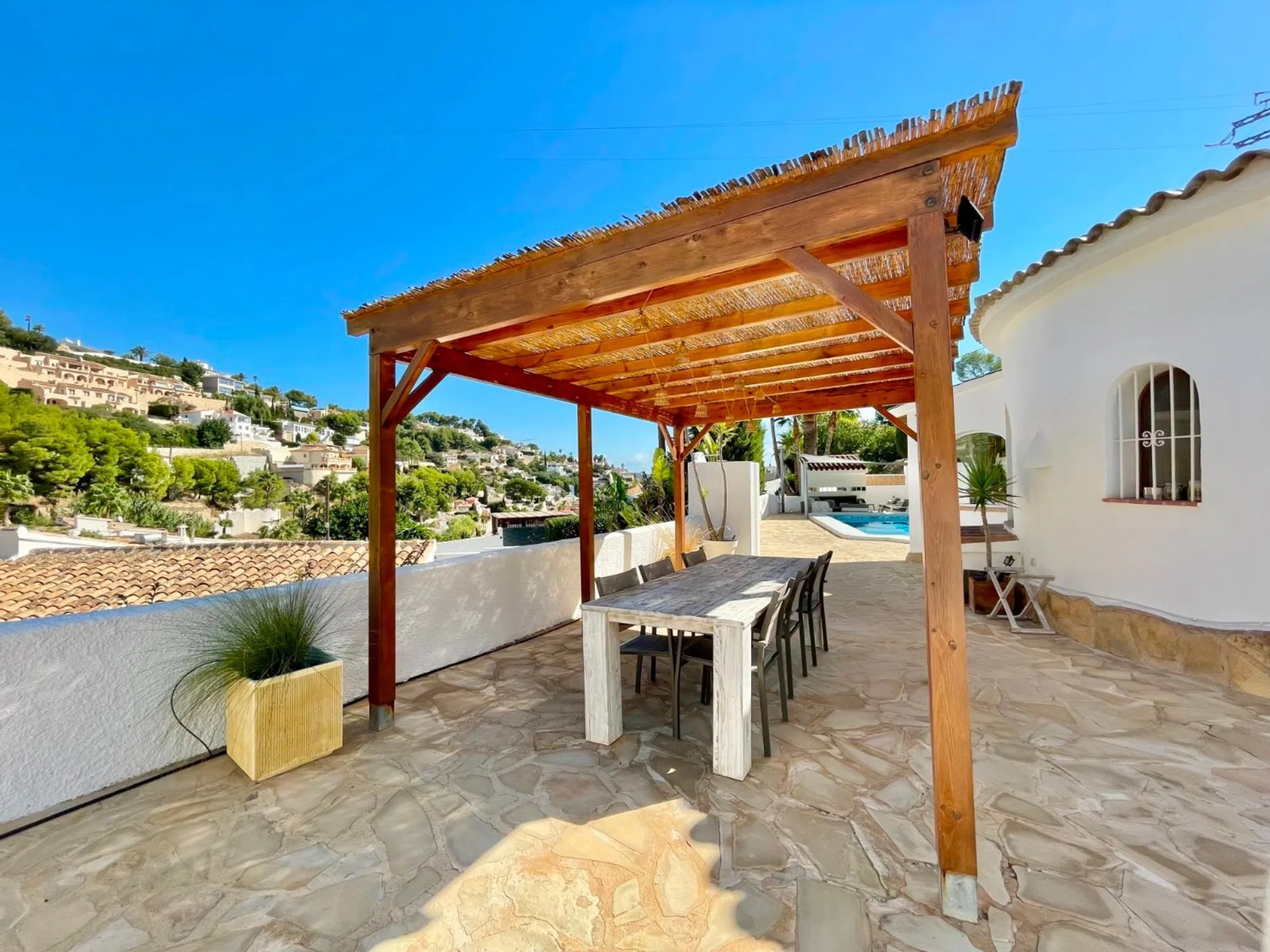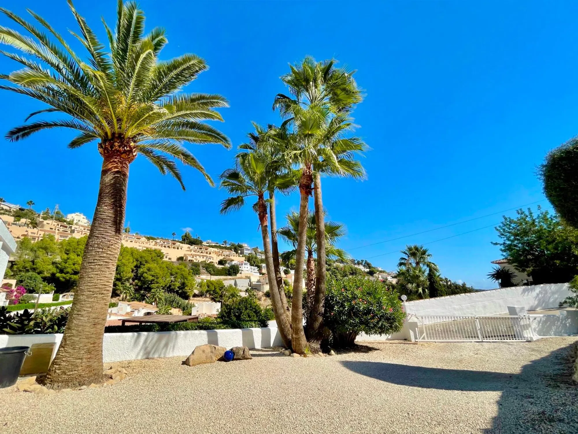 Le presentamos esta preciosa villa mediterránea de una sola planta situada en una parcela llana en la tranquila y verde zona de Benimeit, en Moraira. Ideal para personas que buscan una vivienda fácil de mantener, con tranquilidad, espacio y comodidad. La vivienda está situada en una parcela amplia y llana de 849 m2, en una calle tranquila con tráfico local, a menos de 8 minutos en coche del centro de Moraira y de la playa. Al entrar en la parcela vallada, hay espacio suficiente para aparcar varios coches en la propiedad. Lo que llama la atención inmediatamente son las hermosas palmeras maduras que acentúan el ambiente mediterráneo de la vivienda. Descripción de la vivienda A través de una característica puerta de madera accedemos a la amplia terraza de la piscina, que cuenta con una piscina de buen tamaño. Aquí también encontrará una acogedora zona de descanso con una vela de sombra para que pueda relajarse tanto a la sombra como al sol. Gracias a su ubicación, disfrutará de total privacidad alrededor de la terraza de la piscina. Al entrar en la villa, de una sola planta, llegamos al salón-comedor, equipado con aire acondicionado recientemente renovado y calefacción mediante radiadores en cada habitación. Detrás se encuentra la cocina abierta, equipada con todos los electrodomésticos necesarios. A la izquierda se encuentran los dos dormitorios, que comparten un moderno cuarto de baño con ducha, lavabo e inodoro. Los dormitorios cuentan con elementos característicos como puertas castellanas de madera, armarios empotrados y contraventanas de madera en las ventanas. En el exterior hay un trastero, una ducha exterior y una pérgola de madera junto a la cocina para poder disfrutar de un delicioso desayuno al aire libre por la mañana o cenar bajo el cielo estrellado por la noche. Características: - Parcela llana Mucha privacidad - Vivienda totalmente en planta baja - Vivienda lista para entrar a vivir - Nuevos carpinteria de aluminio en la parte trasera de la vivienda - Mosquiteras.