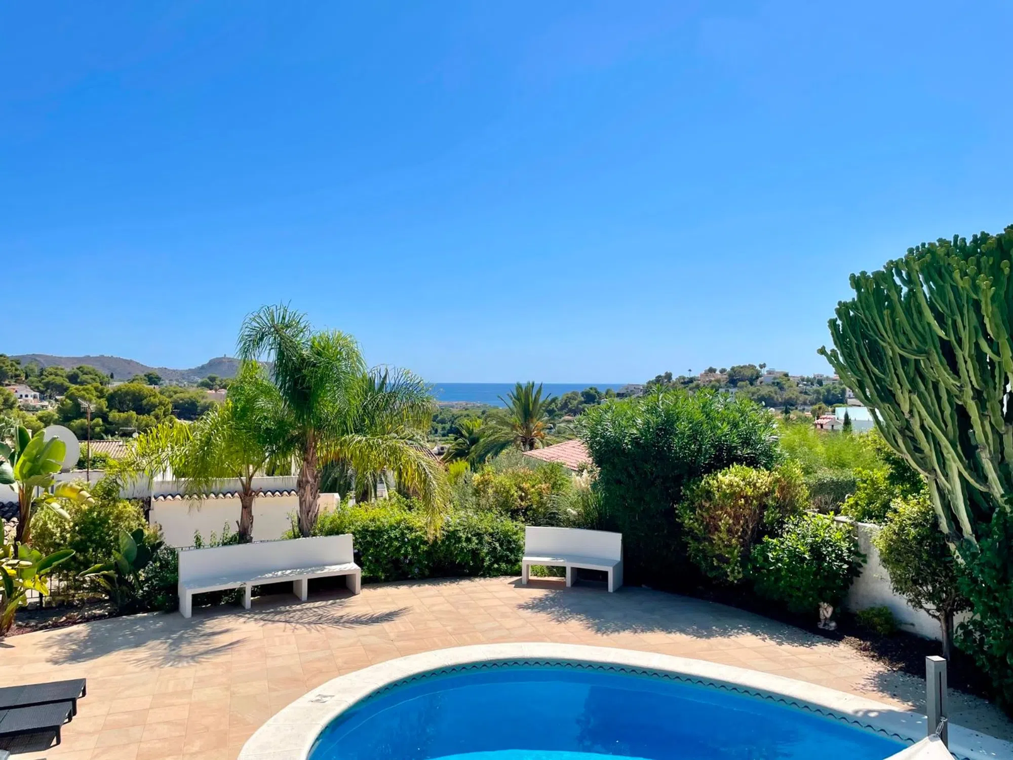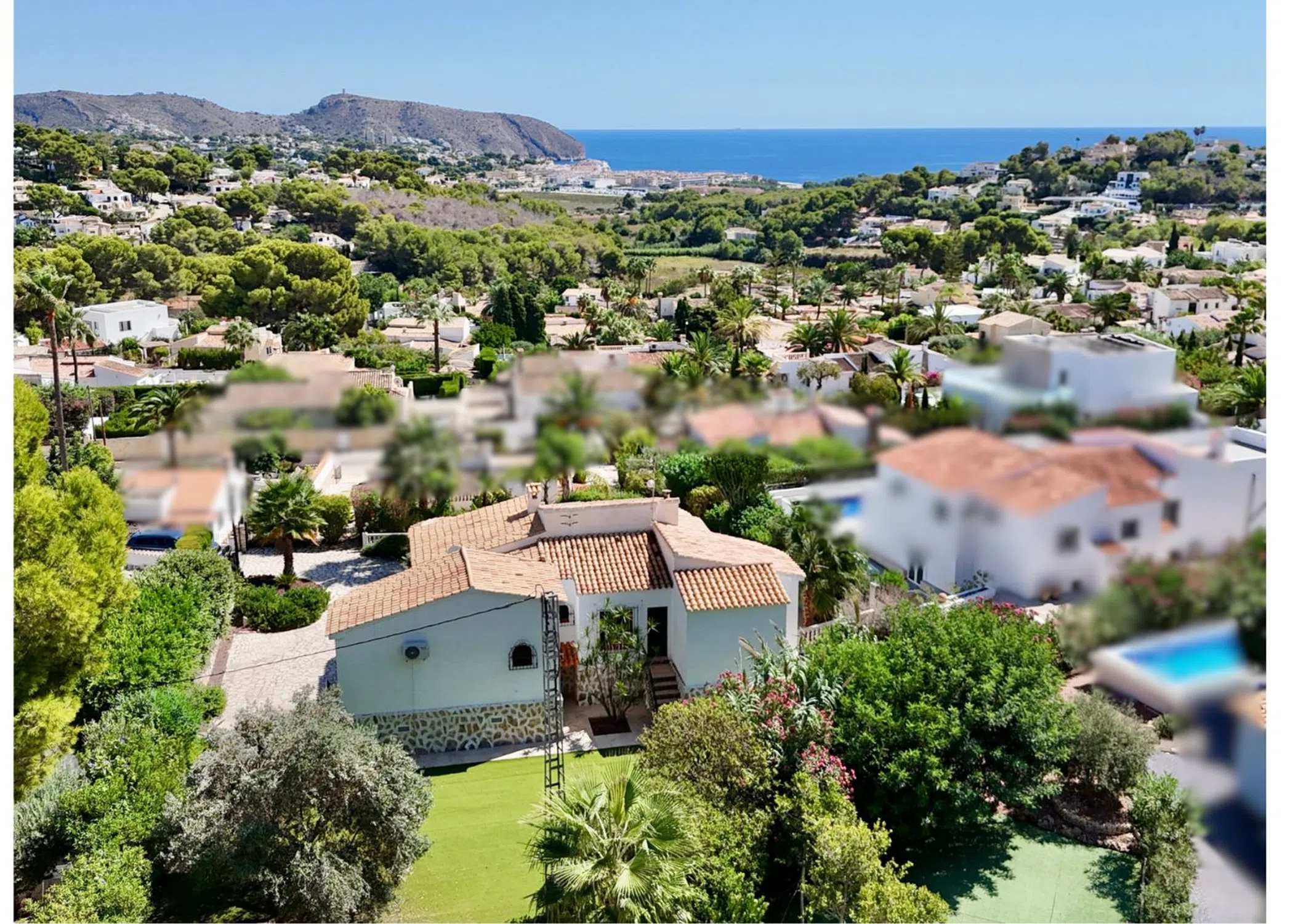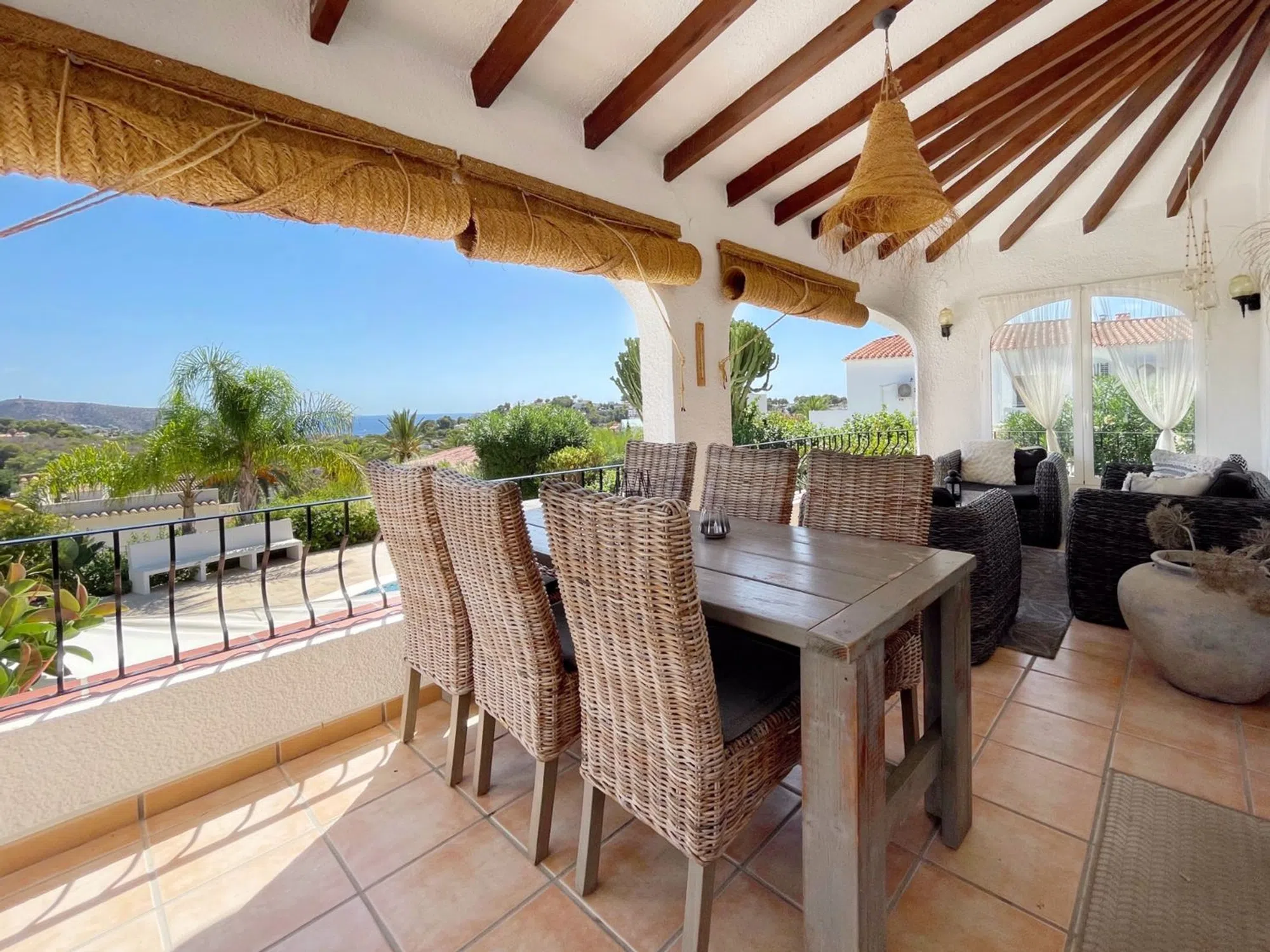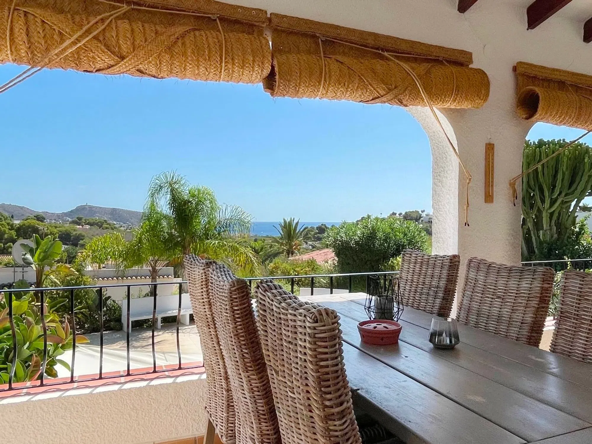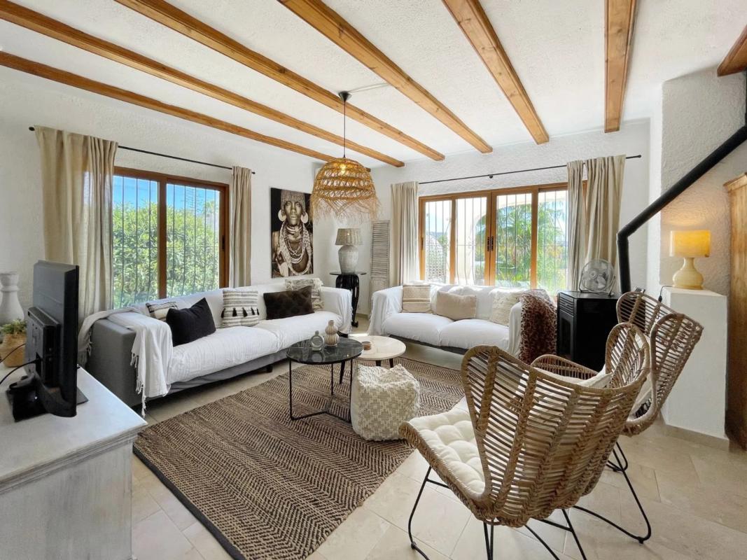 Acogedora villa situada en una amplia parcela en la parte baja del popular barrio de Benimeit, con magníficas vistas tanto al mar como al centro de Moraira. La vivienda cuenta con un salón conectado a una bonita naya (terraza cubierta) y una terraza abierta, ambas con vistas al jardín con piscina en forma de riñón. En la planta baja hay una casa de invitados totalmente independiente y un amplio garaje. En 6 minutos se encuentra en el centro de Moraira y a poca distancia hay un pequeño centro comercial con un supermercado (con muchos productos holandeses) que abre los 7 días de la semana. Descripción de la vivienda La villa está situada en una amplia parcela muy llana de 1.181 m2, es accesible a través de una puerta automática y tiene 2 plantas. Desde ambos niveles, la vivienda ofrece unas magníficas vistas (al mar). Se accede a la planta de estar a través de una escalera que conduce a la puerta principal, que da paso a un amplio vestíbulo. Desde aquí se accede a un amplio salón con cocina abierta, 2 dormitorios y 2 baños. El salón da paso a la naya y a una parte de la terraza abierta, desde ambos niveles se disfruta de unas magníficas vistas al mar, a la vegetación, a las montañas y al centro de Moraira. En la planta baja, además de un garaje, encontramos una casa de invitados independiente, totalmente renovada en 2019, que consta de una pequeña cocina, un cuarto de baño y una habitación con zona de salón y zona de dormitorio. Esta habitación está conectada directamente a la amplia terraza de la piscina a través de puertas correderas, rodeada de un oasis verde de árboles y arbustos maduros. Además, hay otra pequeña habitación en la que se ha creado un espacio adicional para dormir mediante una litera. Junto al garaje, la parcela ofrece espacio suficiente para aparcar varios coches más. Características - Magníficas vistas (al mar) - Bonita naya - Garaje - Equipada con aire acondicionado (frío/calor) - Estufa de pellets. - Jardín maduro. - Detrás de la casa hay un gran campo de césped artificial (ideal para que jueguen los niños).