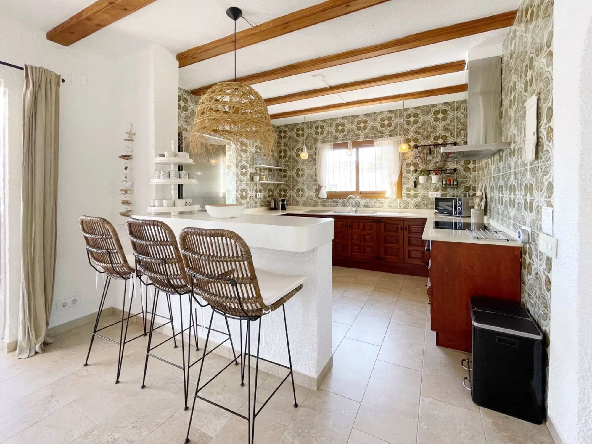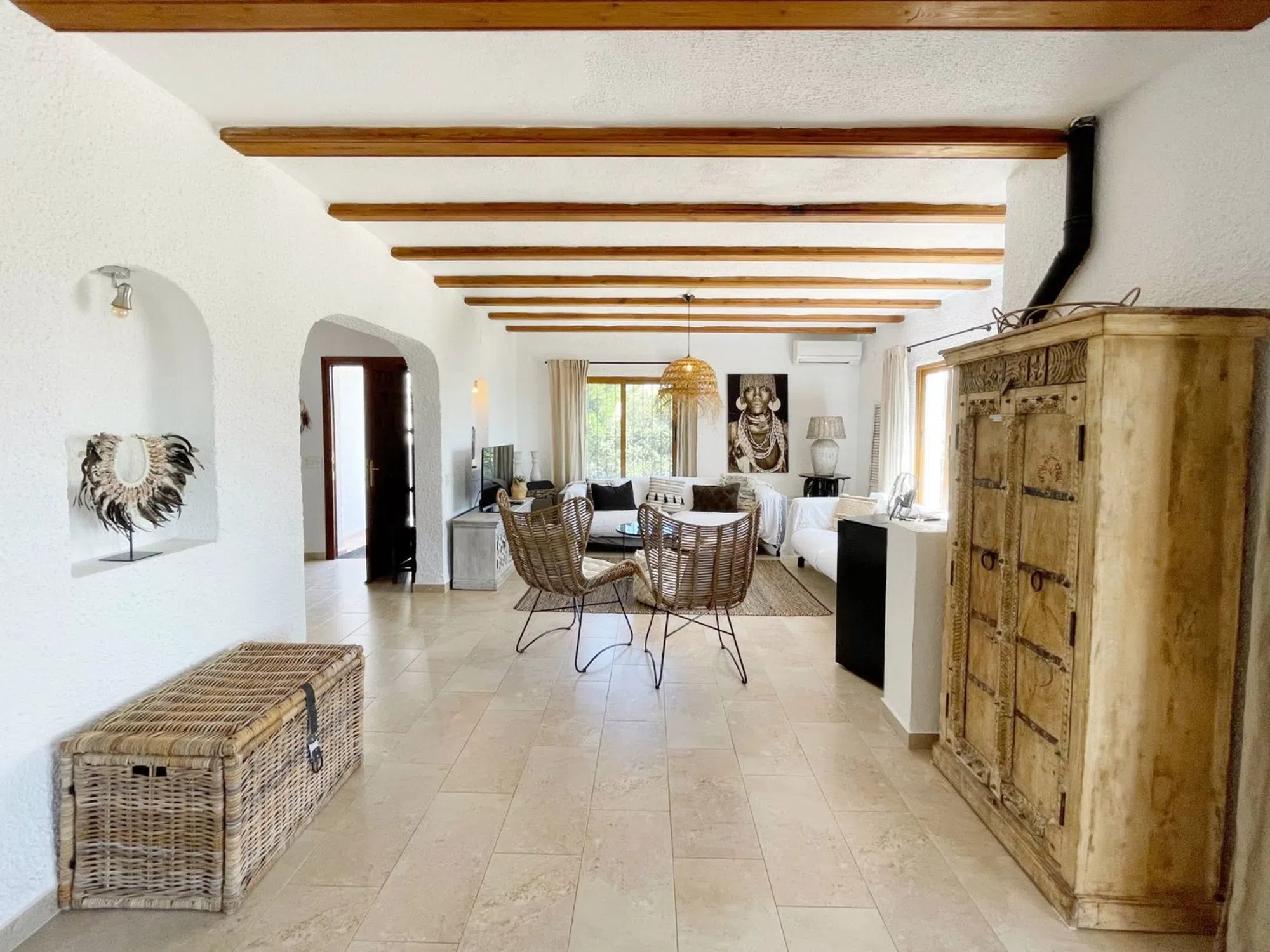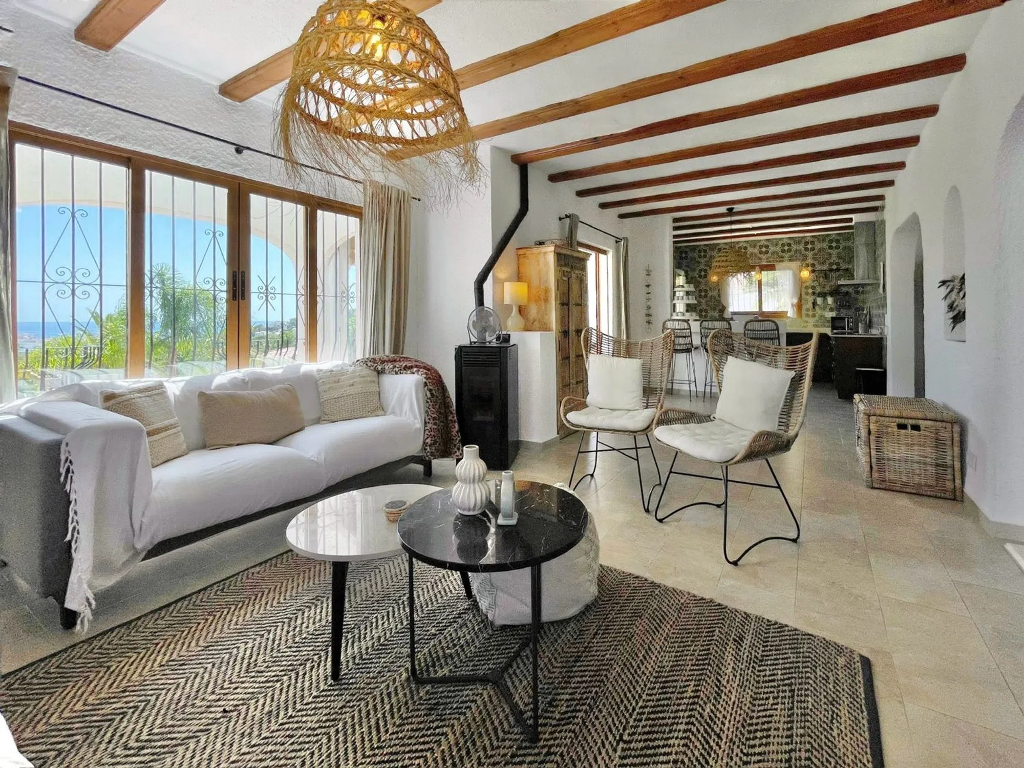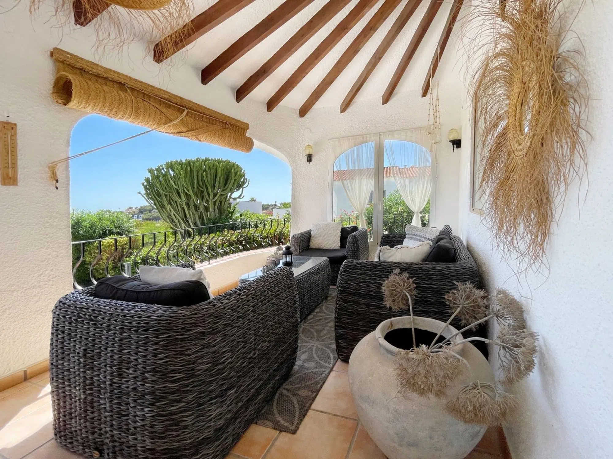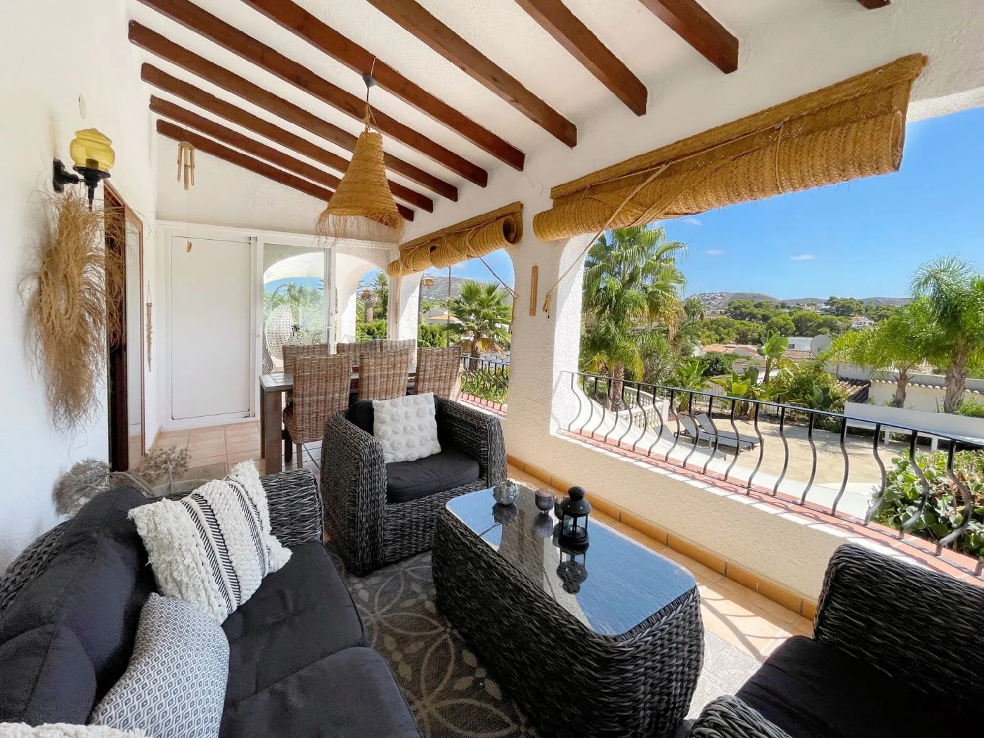 Acogedora villa situada en una amplia parcela en la parte baja del popular barrio de Benimeit, con magníficas vistas tanto al mar como al centro de Moraira. La vivienda cuenta con un salón conectado a una bonita naya (terraza cubierta) y una terraza abierta, ambas con vistas al jardín con piscina en forma de riñón. En la planta baja hay una casa de invitados totalmente independiente y un amplio garaje. En 6 minutos se encuentra en el centro de Moraira y a poca distancia hay un pequeño centro comercial con un supermercado (con muchos productos holandeses) que abre los 7 días de la semana. Descripción de la vivienda La villa está situada en una amplia parcela muy llana de 1.181 m2, es accesible a través de una puerta automática y tiene 2 plantas. Desde ambos niveles, la vivienda ofrece unas magníficas vistas (al mar). Se accede a la planta de estar a través de una escalera que conduce a la puerta principal, que da paso a un amplio vestíbulo. Desde aquí se accede a un amplio salón con cocina abierta, 2 dormitorios y 2 baños. El salón da paso a la naya y a una parte de la terraza abierta, desde ambos niveles se disfruta de unas magníficas vistas al mar, a la vegetación, a las montañas y al centro de Moraira. En la planta baja, además de un garaje, encontramos una casa de invitados independiente, totalmente renovada en 2019, que consta de una pequeña cocina, un cuarto de baño y una habitación con zona de salón y zona de dormitorio. Esta habitación está conectada directamente a la amplia terraza de la piscina a través de puertas correderas, rodeada de un oasis verde de árboles y arbustos maduros. Además, hay otra pequeña habitación en la que se ha creado un espacio adicional para dormir mediante una litera. Junto al garaje, la parcela ofrece espacio suficiente para aparcar varios coches más. Características - Magníficas vistas (al mar) - Bonita naya - Garaje - Equipada con aire acondicionado (frío/calor) - Estufa de pellets. - Jardín maduro. - Detrás de la casa hay un gran campo de césped artificial (ideal para que jueguen los niños).
