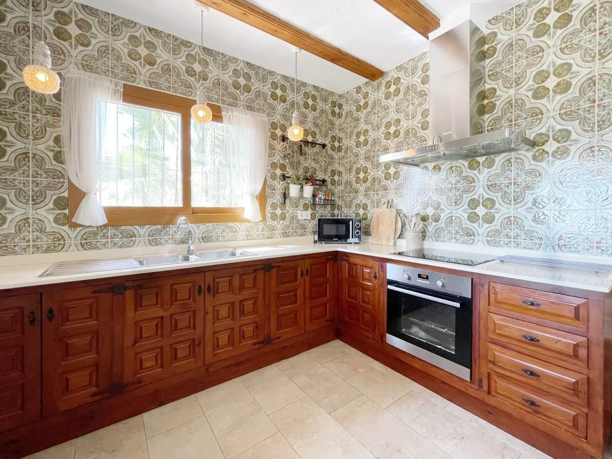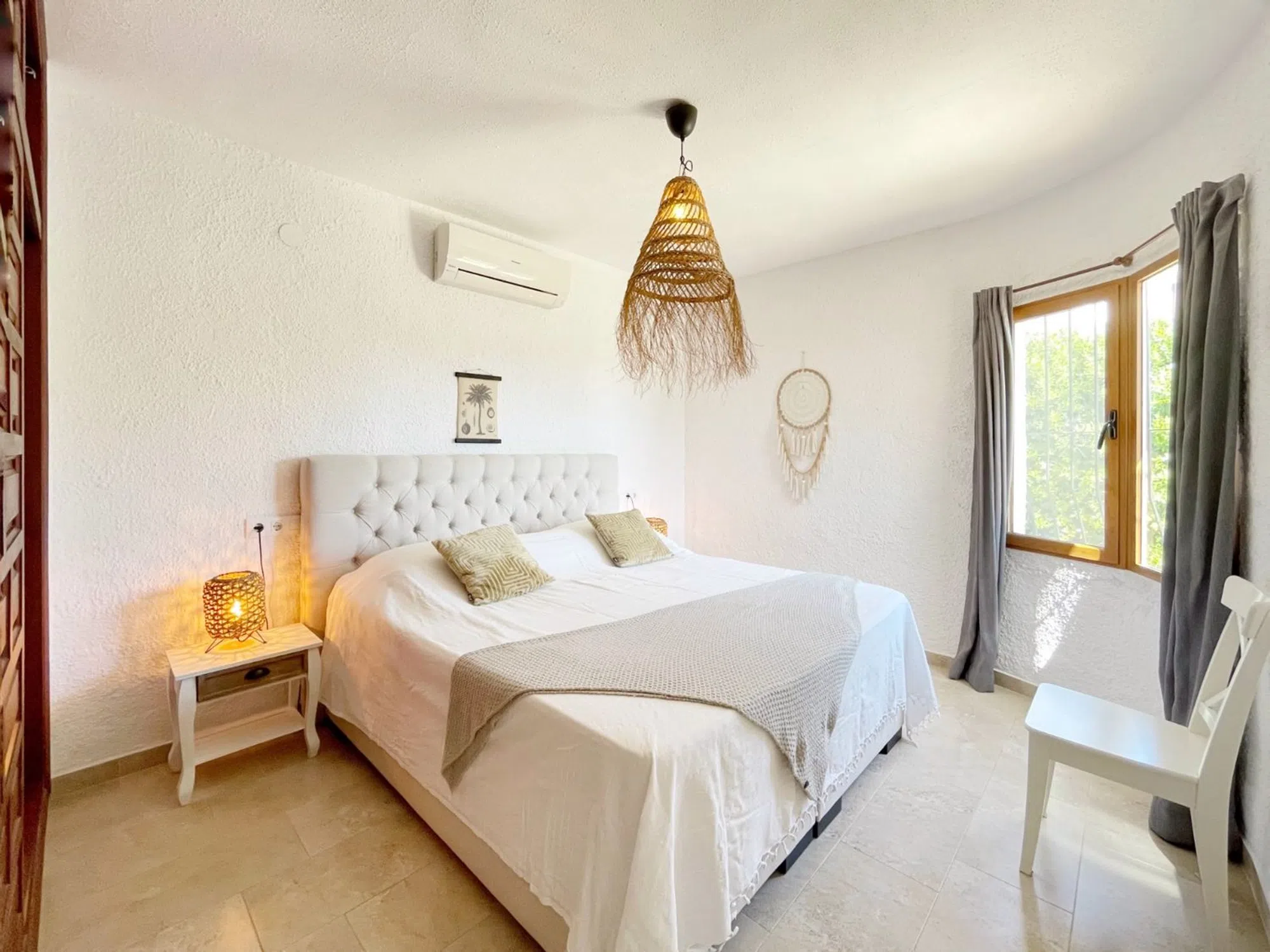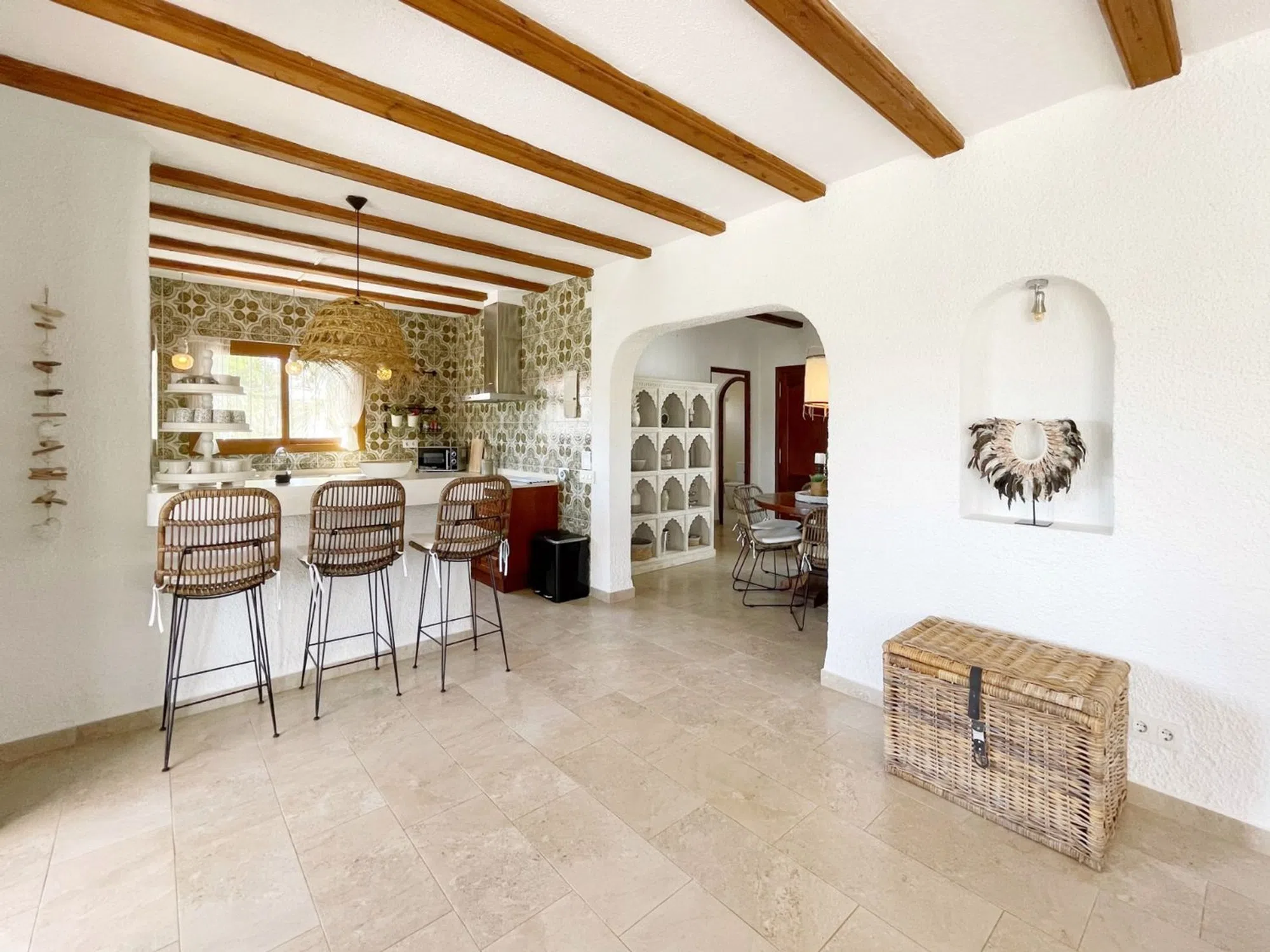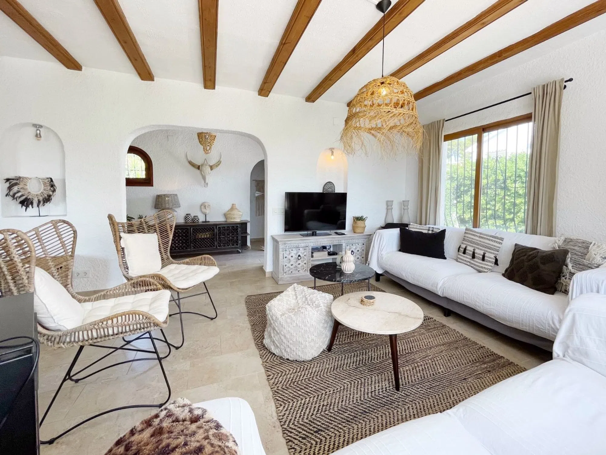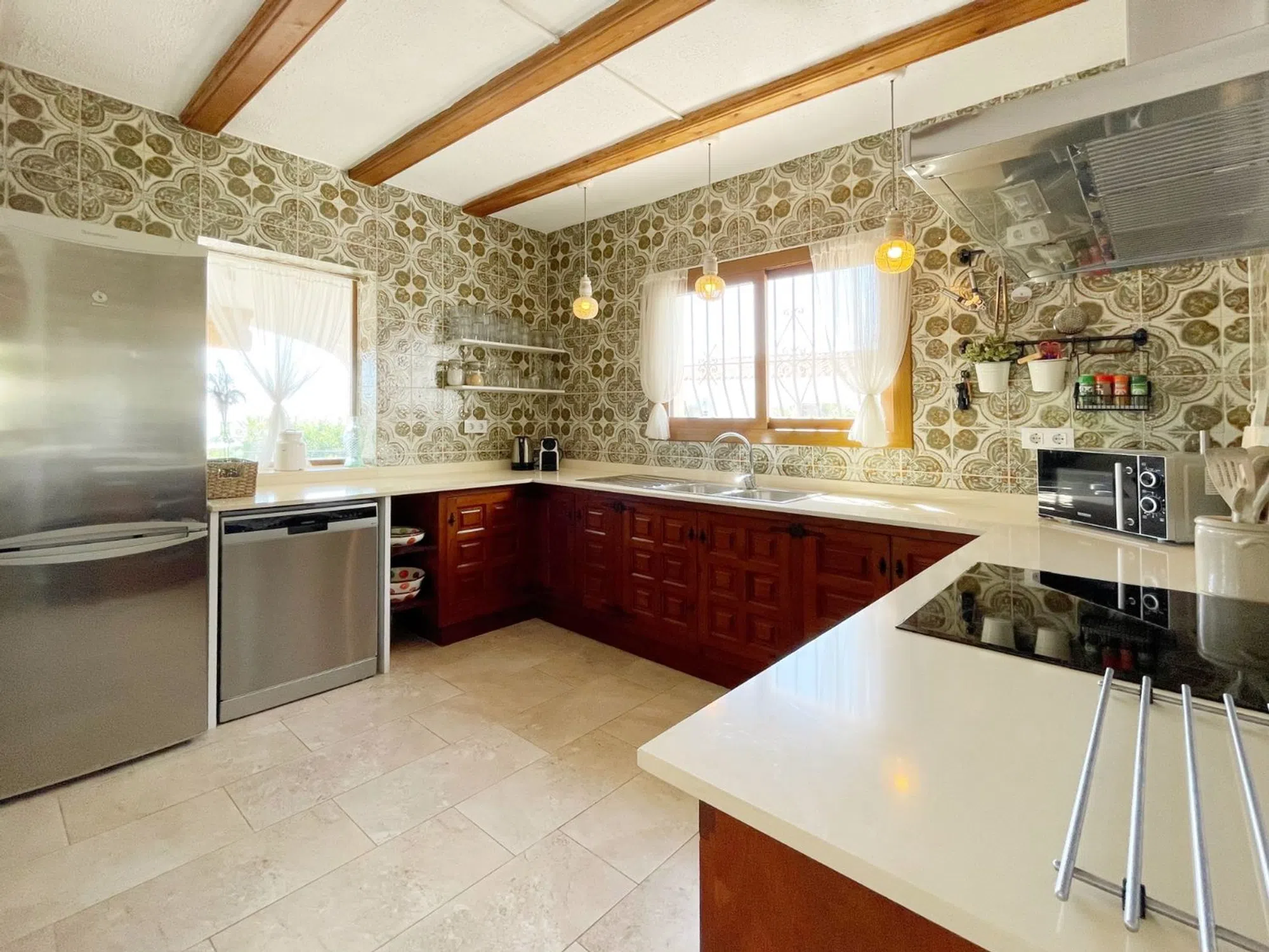Acogedora villa situada en una amplia parcela en la parte baja del popular barrio de Benimeit, con magníficas vistas tanto al mar como al centro de Moraira. La vivienda cuenta con un salón conectado a una bonita naya (terraza cubierta) y una terraza abierta, ambas con vistas al jardín con piscina en forma de riñón. En la planta baja hay una casa de invitados totalmente independiente y un amplio garaje. En 6 minutos se encuentra en el centro de Moraira y a poca distancia hay un pequeño centro comercial con un supermercado (con muchos productos holandeses) que abre los 7 días de la semana. Descripción de la vivienda La villa está situada en una amplia parcela muy llana de 1.181 m2, es accesible a través de una puerta automática y tiene 2 plantas. Desde ambos niveles, la vivienda ofrece unas magníficas vistas (al mar). Se accede a la planta de estar a través de una escalera que conduce a la puerta principal, que da paso a un amplio vestíbulo. Desde aquí se accede a un amplio salón con cocina abierta, 2 dormitorios y 2 baños. El salón da paso a la naya y a una parte de la terraza abierta, desde ambos niveles se disfruta de unas magníficas vistas al mar, a la vegetación, a las montañas y al centro de Moraira. En la planta baja, además de un garaje, encontramos una casa de invitados independiente, totalmente renovada en 2019, que consta de una pequeña cocina, un cuarto de baño y una habitación con zona de salón y zona de dormitorio. Esta habitación está conectada directamente a la amplia terraza de la piscina a través de puertas correderas, rodeada de un oasis verde de árboles y arbustos maduros. Además, hay otra pequeña habitación en la que se ha creado un espacio adicional para dormir mediante una litera. Junto al garaje, la parcela ofrece espacio suficiente para aparcar varios coches más. Características - Magníficas vistas (al mar) - Bonita naya - Garaje - Equipada con aire acondicionado (frío/calor) - Estufa de pellets. - Jardín maduro. - Detrás de la casa hay un gran campo de césped artificial (ideal para que jueguen los niños).