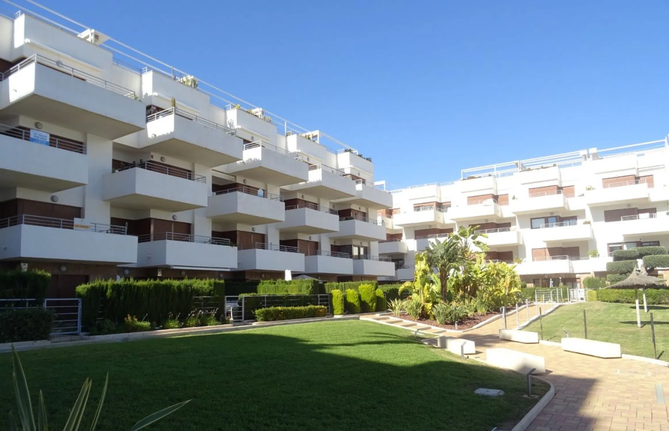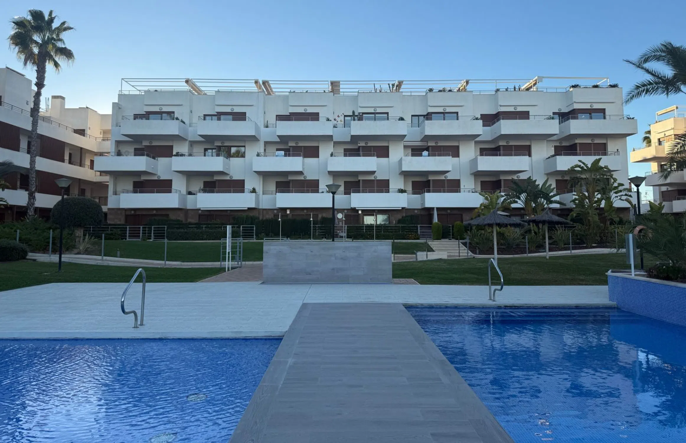 Esta espectacular propiedad, construida originalmente en 2017, cuenta con 84 m² construidos y una terraza de 18 m². El bloque de apartamentos está concebido como un refugio mediterráneo contemporáneo, priorizando una atmósfera de relajación y calma para sus residentes. La arquitectura integra líneas modernas y limpias con la calidez de los materiales tradicionales mediterráneos, creando una estética equilibrada y sofisticada. Los balcones privados, las terrazas sombreadas y los patios ajardinados diseñados con atención al detalle ofrecen a los residentes espacios tranquilos para el descanso y la reflexión. Las zonas comunes están pensadas para favorecer el bienestar, con iluminación suave, vegetación abundante y espacios cuidadosamente organizados que fomentan un ambiente tranquilo y pausado. El apartamento, orientado al sur, ofrece vistas al jardín comunitario, permitiéndole disfrutar del sol desde la comodidad de su hogar durante 325 días al año. La comunidad dispone de una variedad de servicios comunes, como una piscina, un jardín mantenido regularmente e incluso una zona de juegos para los más pequeños. En Lomas de Cabo Roig, estará cerca de todos los servicios que pueda necesitar. Supermercados, farmacias y restaurantes en pueblos cercanos están a poca distancia, y se encuentra a solo unos 10 minutos del famoso campo de golf Las Colinas. Para los amantes de la playa, está a tan solo unos minutos de una playa de arena amplia de un kilómetro de longitud. Si le interesa jugar al golf, está en el lugar adecuado, ya que en un radio de 8 km puede encontrar cuatro campos de golf de 18 hoyos, incluidos Villamartín Golf, Campoamor Real Golf Club, Las Ramblas Golf y Las Colinas Golf Course.