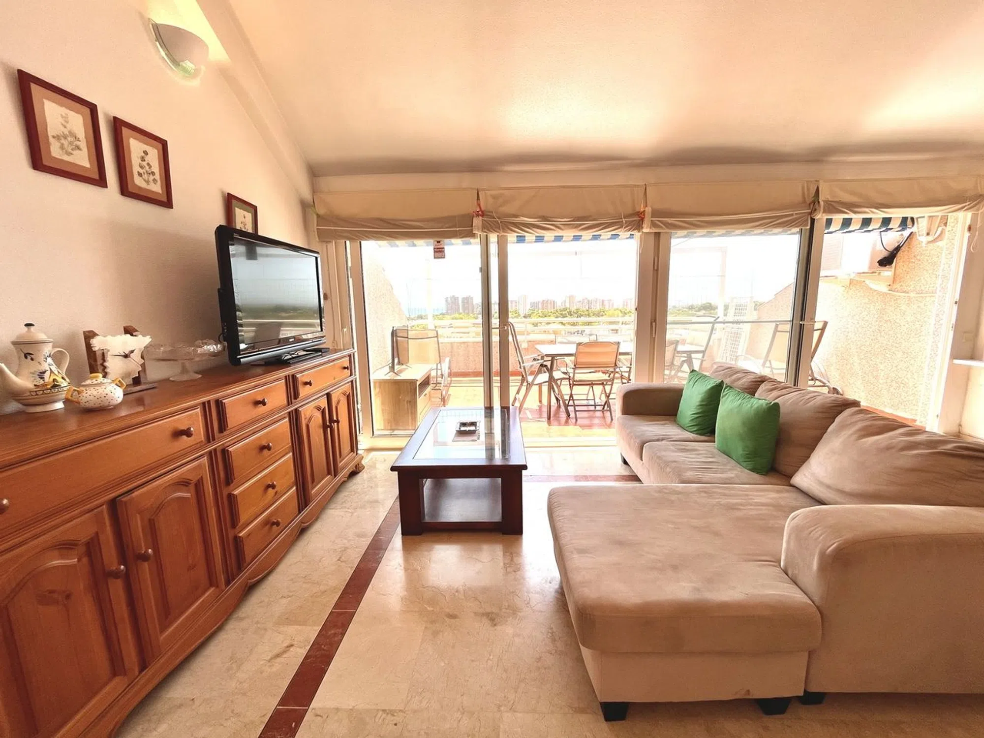 Adéntrate en este impecable ático de 3 dormitorios y 2 baños, que cuenta con inmejorables vistas panorámicas al mar sobre la impresionante Dehesa de Campoamor y el brillante Mar Mediterráneo. Se vende completamente amueblado y listo para entrar a vivir, esta elegante vivienda ofrece la combinación perfecta de confort, estilo y encanto costero. Cada dormitorio cuenta con armarios empotrados, aire acondicionado en todas las habitaciones y la espaciosa sala de estar de planta abierta fluye sin esfuerzo hacia una terraza privada, perfecta para disfrutar del sol español y disfrutar del entorno tranquilo. El ático forma parte de una comunidad bien mantenida con fantásticas comodidades compartidas que incluyen una gran piscina comunitaria y canchas de tenis. Las características adicionales incluyen una plaza de garaje privada y un trastero independiente, que brindan comodidad y seguridad. Ubicado en una zona tranquila, está a solo 900 metros de las hermosas playas de Campoamor. Los amantes de la comida apreciarán estar a solo 5 minutos a pie del famoso restaurante español Las Villas, famoso por su deliciosa paella y cocina tradicional. La vibrante franja de Cabo Roig, con su animada selección de bares, restaurantes, tiendas y entretenimiento, está a solo 5 minutos en coche, lo que le brinda fácil acceso a lo mejor del estilo de vida de la Costa Blanca. Este excepcional ático realmente ofrece lo mejor de ambos mundos: serenidad y accesibilidad. ¡No pierda la oportunidad de poseer su propio pedazo de paraíso en la costa mediterránea!