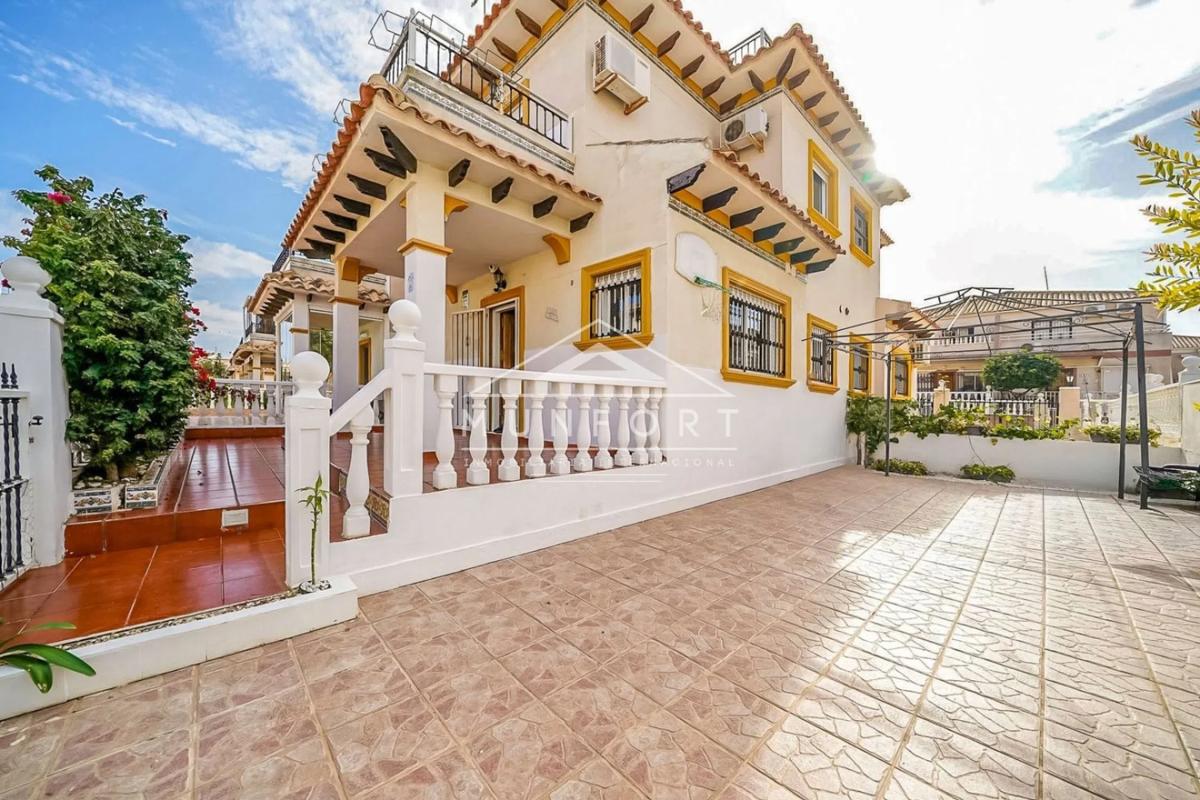 Cabo Roig, casa adosada de 2 dormitorios en venta con baño familiar, aseo independiente, paneles solares, ubicada en urbanización con dos piscinas comunitarias y a solo 10 minutos a pie de l...
