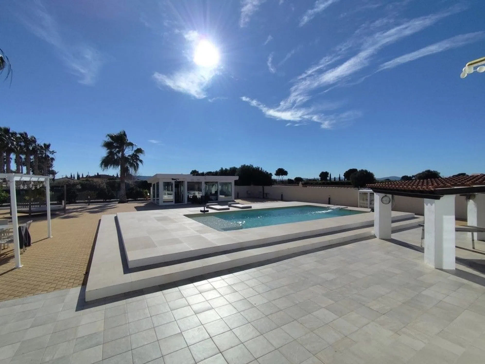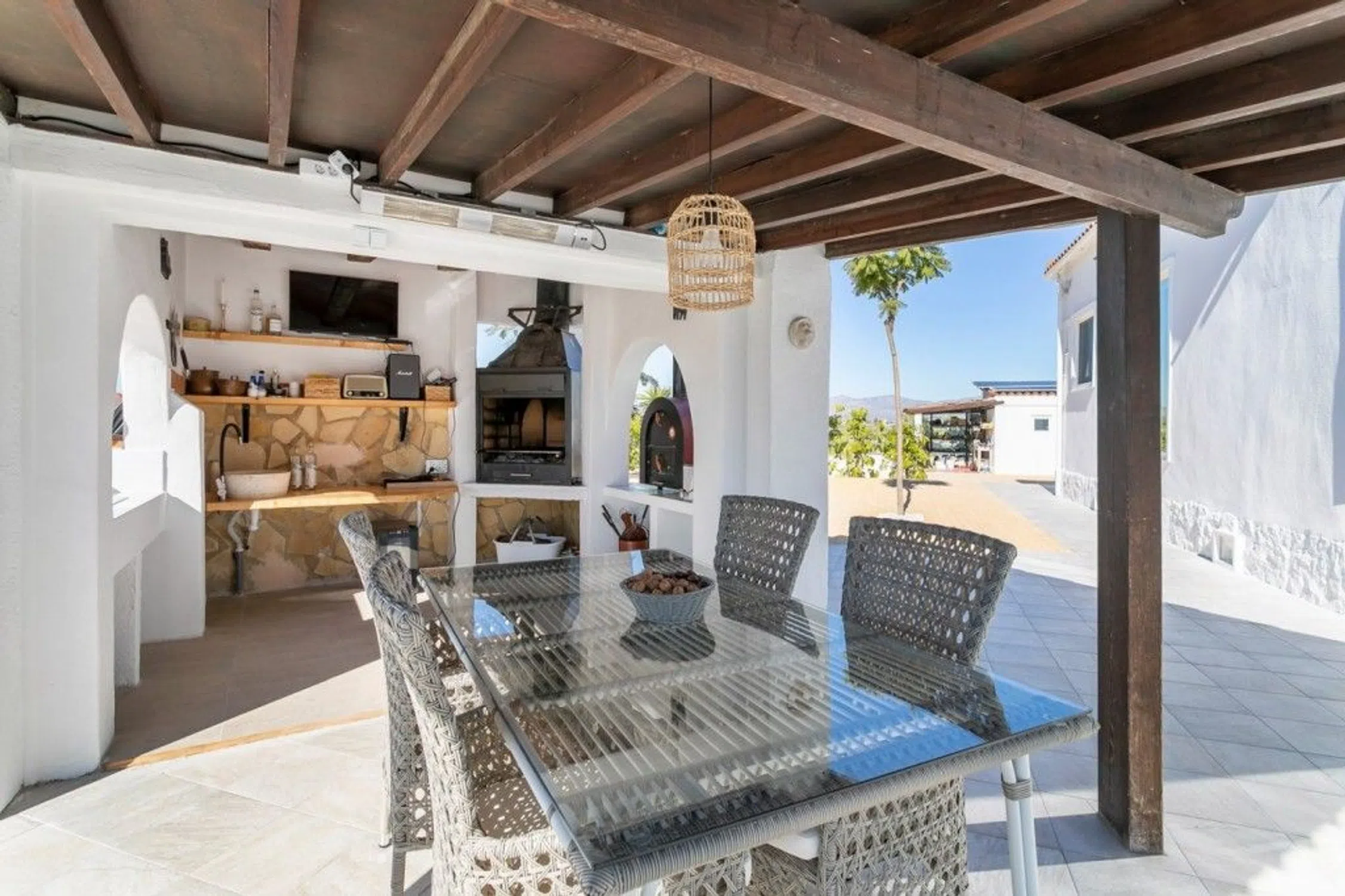 Exclusiva finca mediterránea con instalaciones de bienestar y vistas panorámicas Ubicada en un tranquilo valle de montaña, esta excepcional villa mediterránea combina una arquitectura atemporal, confort contemporáneo y elegancia minimalista. Rodeada de naturaleza y con una ubicación ideal, la última casa de una calle sin salida, la propiedad se encuentra a solo 13 km de la playa, a 40 km del aeropuerto de Alicante, a 2 km del pueblo con todos los servicios y a 7 km de La Finca Golf Resort. Finca privada de 5.600 m² La parcela de 5.600 m² totalmente cerrada, delimitada por altos muros, ofrece total privacidad y alberga la residencia principal junto con varios edificios anexos de alta calidad, todos diseñados para mejorar la comodidad, el ocio y el bienestar. Residencia principal – Vivienda de lujo con orientación sur (165 m²) La villa principal disfruta de una soleada orientación sur y cuenta con: Cocina abierta y comedor con vistas panorámicas al campo, a las montañas y a la piscina. Elegante sala de estar de forma ovalada Habitación doble con baño en suite Dormitorio principal con vestidor, baño integrado y WC separado. Los grandes ventanales garantizan abundante luz natural y una perfecta integración entre el interior y el exterior. Alojamiento para huéspedes y edificios adicionales Casa de huéspedes de madera (50 m²) con dormitorio doble, porche y terraza cubierta que incluye cocina y comedor. Cobertizo de almacenamiento de madera con inodoro Vida al aire libre estilo resort Las zonas exteriores están pensadas para el relax y el entretenimiento: Piscina (50 m² de superficie de agua, 1,5 m de profundidad) Ducha solar y amplia zona chill-out Zona de barbacoa al aire libre con parrilla de acero Comedor exterior totalmente equipado (15 m²) Incluye placa de inducción, horno tradicional, horno de pizza, fregadero, barra y espacio para comer: perfecto para recibir a familiares y amigos. Instalaciones de bienestar Edificio de bienestar acristalado (40 m²) con sauna tradicional, sauna de infrarrojos y zona de relajación con vidrio insonorizado. Edificio Técnico y de Servicios (40 m²) Estacionamiento cubierto para dos autos. Trastero con cámara frigorífica Sala de limpieza Porche y espacio multifuncional acristalado Equipado con 14 paneles solares para eficiencia energética. Seguridad y tecnología La propiedad ofrece características de seguridad avanzadas, que incluyen: Puertas de acceso eléctricas con videoportero. Cámaras de vigilancia Detectores de movimiento interiores y exteriores con control centralizado Doble acristalamiento antirrobo con filtros solares y mosquiteras. Características adicionales Parcialmente amueblado, incluidos electrodomésticos. Agua corriente y electricidad Calefacción eléctrica con radiadores Aire acondicionado (frío y calor) y conexiones de TV/Internet en todos los edificios. Pozo de agua privado Árboles frutales, olivos y palmeras Espectaculares vistas abiertas al campo y a las montañas circundantes. Esta extraordinaria propiedad ofrece privacidad, lujo y bienestar en un entorno natural único, lo que la hace ideal como residencia permanente, refugio de vacaciones o inversión exclusiva. Comuníquese con Sunrisa hoy para obtener más información o para concertar una visita privada a esta extraordinaria propiedad.
