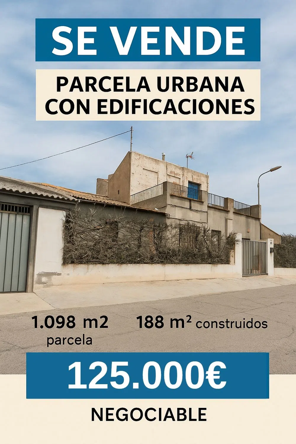 Se vende parcela urbana con edificaciones – Orihuela (Alicante) ➖ Precio: 125.000 € (negociable) Parcela urbana de 1.098 m² en venta en la pedanía de Media Legua (Orihuela), en plena huerta alicantina, con acceso directo desde la carretera CV-91. Zona tranquila, ideal para residencia, inversión o reforma con jardín. ➖ Características de la propiedad: Superficie gráfica (parcela): 1.098 m² Superficie construida: 188 m² Vivienda en planta baja: 55 m² Edificación industrial: 89 m² Vivienda en planta alta: 44 m² con terraza Espacio libre de más de 900 m², ideal para jardín, huerto, piscina o ampliaciones Dispone de luz y agua Clase de suelo: Urbano Uso catastral: Residencial Industrial Estado: Para reformar ➖ Ubicación privilegiada: 5 minutos de Orihuela centro 8 minutos del Hospital Vega Baja Acceso directo por carretera CV-91 Zona tranquila, ideal para desconectar sin alejarse de la ciudad ➖ Ideal para: Inversores que busquen terreno urbano con potencial Familias con visión de reforma Uso mixto: residencial almacén/taller ➖➖➖➖➖➖➖➖➖➖➖➖➖➖➖ Contáctanos para más información o visita. ¡Oportunidad con gran potencial en plena huerta de Orihuela!