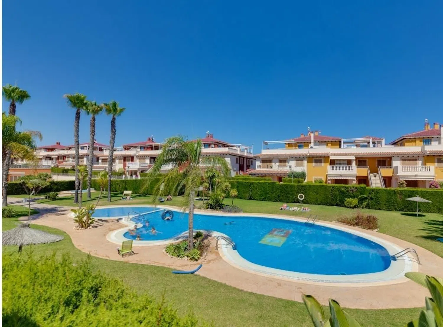 Adosado de 3 dormitorios 3 baños, piscina comunitaria en Orihuela costa urbanizacion Zenia Mar, Espectacular Adosado de 212 m² que cuenta con un elegante salón-comedor, una moderna cocina, tres amplias habitaciones, tres baños completos, un práctico trastero y una galería. La casa tiene acceso privado al garaje subterráneo. Además, cuenta con un solárium de 35 m², una zona ajardinada de 92 m² con zona de barbacoa y una orientación suroeste que permite disfrutar del sol todo el año. Auropuerto de Alicante esta a 45 minutos en el coche. Mejores playas de Orihuela costa estan a 10 minutos en el cohe. La propiedad fue construida en 2007 pero apenas ha sido utilizada, tan solo un par de semanas al año. Todo está en perfecto estado, con aire acondicionado y sistema de calefacción central. La zona común incluye una piscina tipo resort, un gimnasio y una sauna.