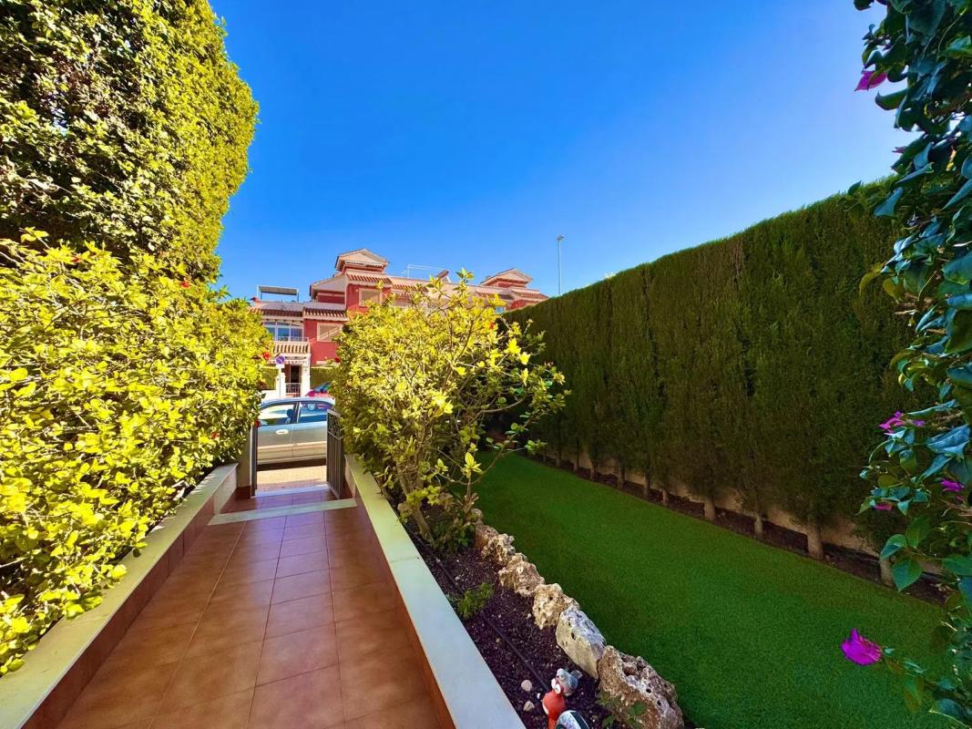 ¡Descubre tu nuevo hogar en el exclusivo Complejo Inmobiliario Zeniamar 9! Este impresionante chalet adosado tríplex en esquina te ofrece 135,45 m² de pura comodidad y estilo. Disfruta de un amplio salón y una cocina completamente equipada que hará las delicias de cualquier amante de la gastronomía. Relájate en el porche de 15 m² o en la terraza de 23 m² en la primera planta, y si buscas vistas espectaculares, el solárium de 33 m² con barbacoa y vistas al mar te dejará sin aliento. La orientación al este garantiza luminosidad durante todo el día, mientras que el jardín en esquina de 116 m² te brinda un espacio verde privado para disfrutar del clima excepcional de la zona. Además, el complejo ofrece seguridad con video vigilancia, zonas verdes, piscina, club social, gimnasio y sauna. La ubicación es inmejorable, cerca del Centro Comercial La Zenia Boulevard y playas como La Zenia, Playa Flamenca y Campoamor. Con 3 dormitorios, 2 baños, armarios empotrados y un balcón, este chalet es ideal para familias que buscan calidad de vida. Se vende sin amueblar, pero con la cocina equipada, lo que te permite personalizar cada rincón a tu gusto. No pierdas la oportunidad de vivir en un entorno privilegiado con todas las comodidades a tu alcance. ¡Ven a visitarlo y enamórate de tu futuro hogar!