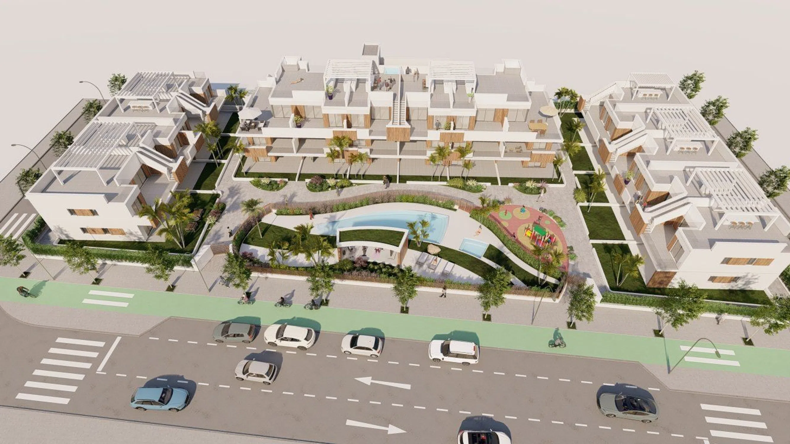 LAMAR Resort Luxury VII es un lujoso complejo de 34 apartamentos de 2/3 habitaciones y 2 baños distribuidos en 3 bloques con piscina comunitaria, jacuzzi, gimnasio, zona infantil y garaje con trastero. Las plantas bajas cuentan con amplios jardines, las primeras plantas con terrazas y los áticos con solárium y jacuzzi. Estructura, cerramientos, fachada y acabados: Cimentación y estructura de hormigón armado, según proyecto de ejecución. Cerramientos de con doble tabique cerámico, con cámara de aire, aislamiento térmico acústico con paneles de poliestireno expandido. Fachada revestida de porcelánico de alta gama combinada con monocapa blanco tratado antisuciedad. Pavimento interior de vivienda porcelánico de gran calidad. Carpintería interior, exterior y vidrios: Puerta de seguridad en la entrada de la vivienda. Puertas de paso en el interior lacadas en blanco. Armarios empotrados en dormitorios con acabados de primera calidad con altillo, barra y cajoneras. Carpintería exterior de aluminio de alta gama. Vidrios de seguridad térmico-acústico Climasun y persianas. Muebles de cocina con armarios altos y bajos de diseño con encimera en Silestone o similar, en color brillo blanco y color madera. Electrodomésticos incluidos: frigorífico, placa de inducción, extractor, horno y microondas en columna, lavavajillas y lavadora. Instalación de fontanería: Sanitarios suspendidos de cerámica de alta gama. Muebles de lavabos suspendidos y espejo. Grifería monomando y termostática en duchas. Ducha efecto Rain. Plato de ducha a medida, a nivel del suelo, con mampara de cristal. Producción de agua caliente sanitaria mediante calentador con sistema de aerotermia. Punto de agua en jardín o solárium. Instalación eléctrica y climatización: Instalación de suelo radiante eléctrico en los dos baños de la vivienda. Mecanismos marca Niessen, Simon o similar. Tomas de TV, internet y teléfono en todas las estancias. Iluminación LED en el salón cocina, baños y pasillo de la vivienda. Indirecta en zonas exteriores. Preinstalación de aire acondicionado por conductos. Solárium, jardines y terrazas: Solárium con aislamiento térmico-acústico según normativa vigente. Pavimentos de exterior: jardín, terraza y solárium en gres antideslizante de gran calidad. Cocina de verano en solárium con encimera de granito, provista de fregadero con grifería mono mando, instalaciones eléctricas y de fontanería. Pérgola de obra en solárium. Instalación jacuzzi y césped artificial en solárium. Barandillas con cristal de seguridad en solárium y terrazas. Urbanización y aparcamiento: Piscina y jacuzzi comunitarios con zonas de gres antideslizante y césped artificial. Gimnasio cubierto frente a piscina y zona de parque infantil.