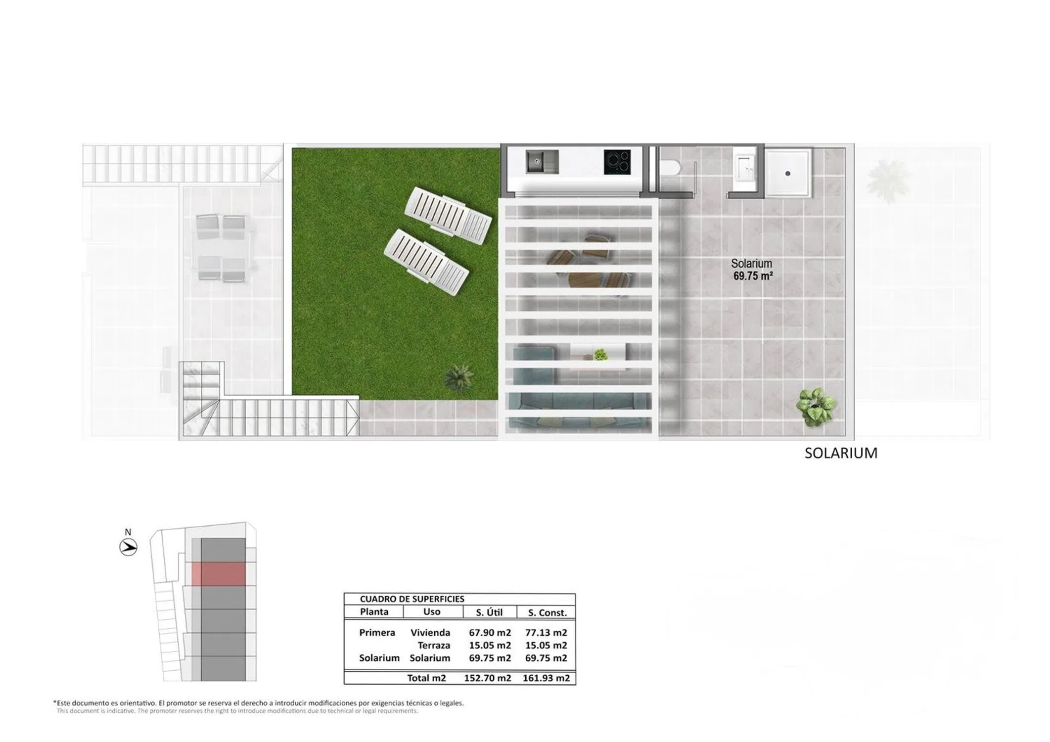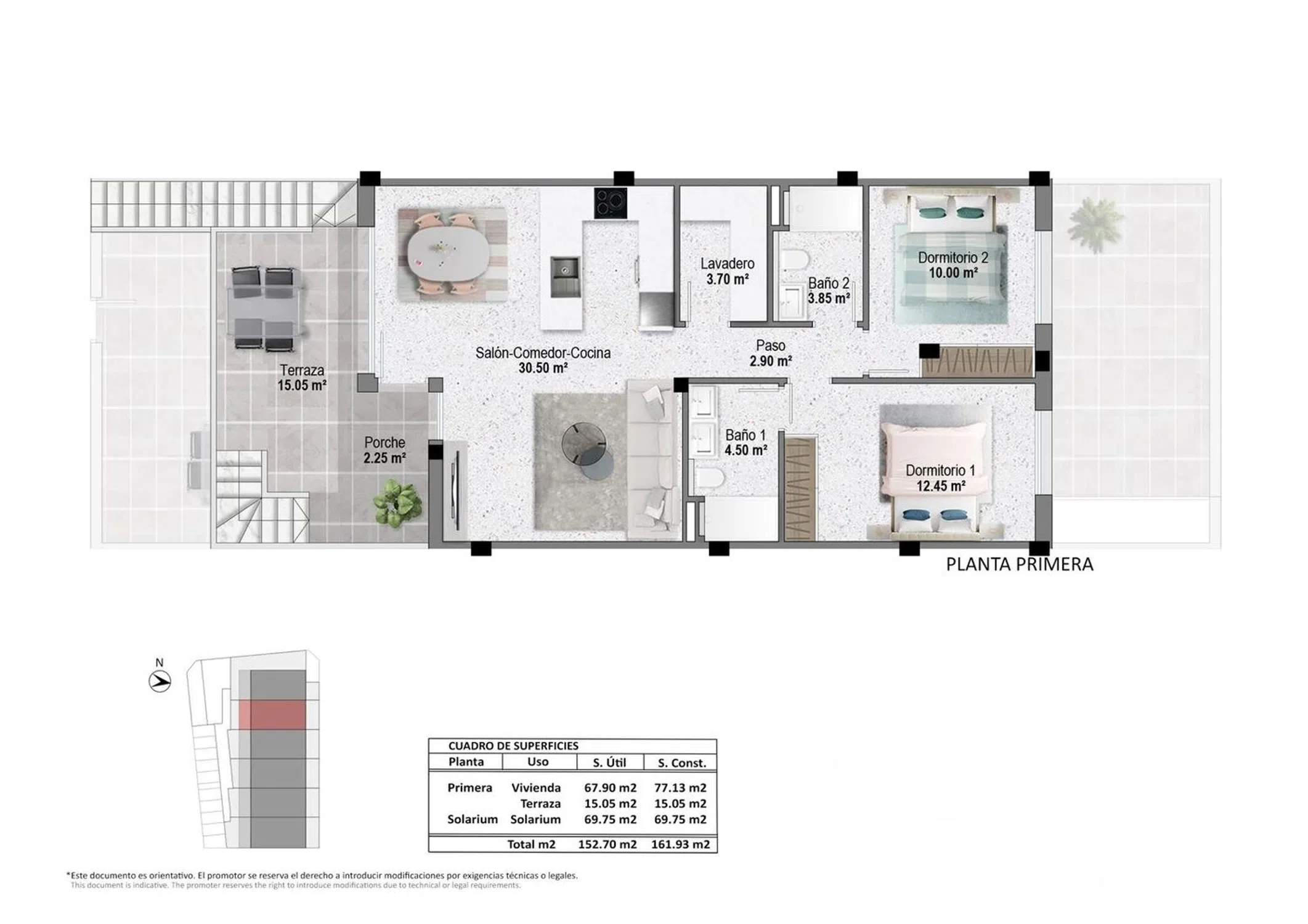 Te presentamos este exclusivo ático de obra nueva en Pilar de la Horadada, una vivienda con una superficie total construida de 161,93 m² pensada para disfrutar al máximo del estilo de vida mediterráneo, combinando diseño contemporáneo, amplitud y espacios exteriores privilegiados. La vivienda se distribuye en una cómoda planta principal de 67,90 m² útiles, donde destaca un amplio salón-comedor con cocina integrada de 30,50 m², un espacio luminoso y abierto que conecta directamente con una terraza de 15,05 m², ideal para desayunos al aire libre, comidas con amigos o simplemente relajarte bajo el sol. La cocina, de líneas modernas, se integra perfectamente en el conjunto, ofreciendo funcionalidad y elegancia. El ático cuenta con dos dormitorios dobles, ambos con armarios empotrados. El dormitorio principal, de 12,45 m², ofrece un ambiente acogedor y tranquilo, mientras que el segundo dormitorio, de 10 m², es perfecto como habitación de invitados, despacho o dormitorio juvenil. La vivienda dispone de dos baños completos, diseñados con materiales actuales y pensados para el confort diario. Además, incluye un práctico lavadero independiente, que aporta orden y comodidad al hogar. Sin duda, uno de los grandes atractivos de esta propiedad es su espectacular solárium privado de 69,75 m², al que se accede desde la vivienda. Este espacio se convierte en un auténtico oasis: zona para tomar el sol, área chill-out, posibilidad de cocina exterior, ducha e incluso un rincón verde. Un lugar perfecto para disfrutar del clima excepcional de la Costa Blanca durante todo el año, con total privacidad. El ático forma parte de un residencial moderno, con una cuidada distribución y orientación que favorece la luz natural y la ventilación. Su ubicación en Pilar de la Horadada es inmejorable: cerca de todos los servicios, supermercados, restaurantes, zonas deportivas y a pocos minutos de las playas de Torre de la Horadada y Mil Palmeras.