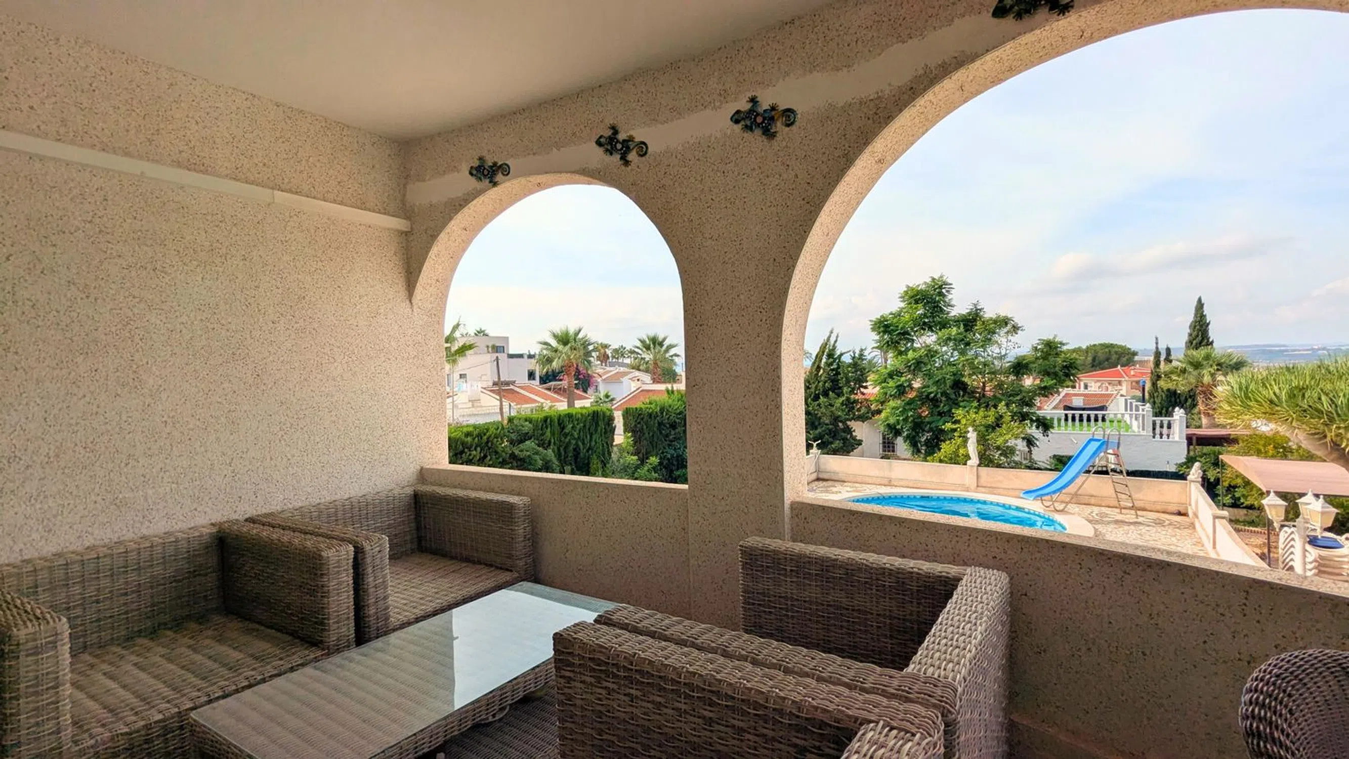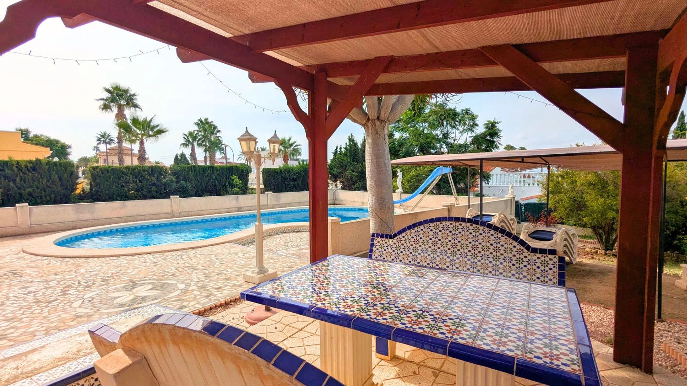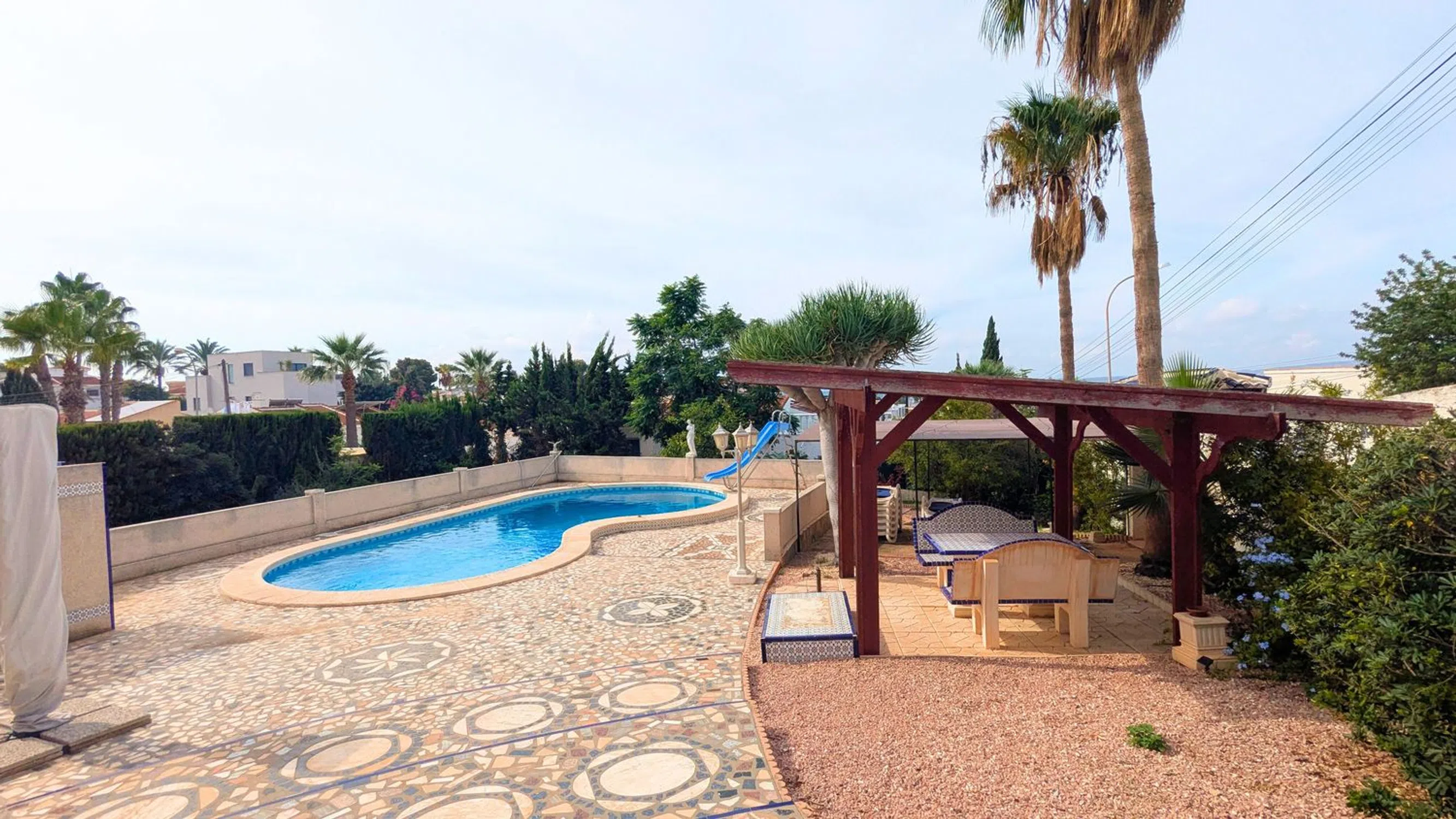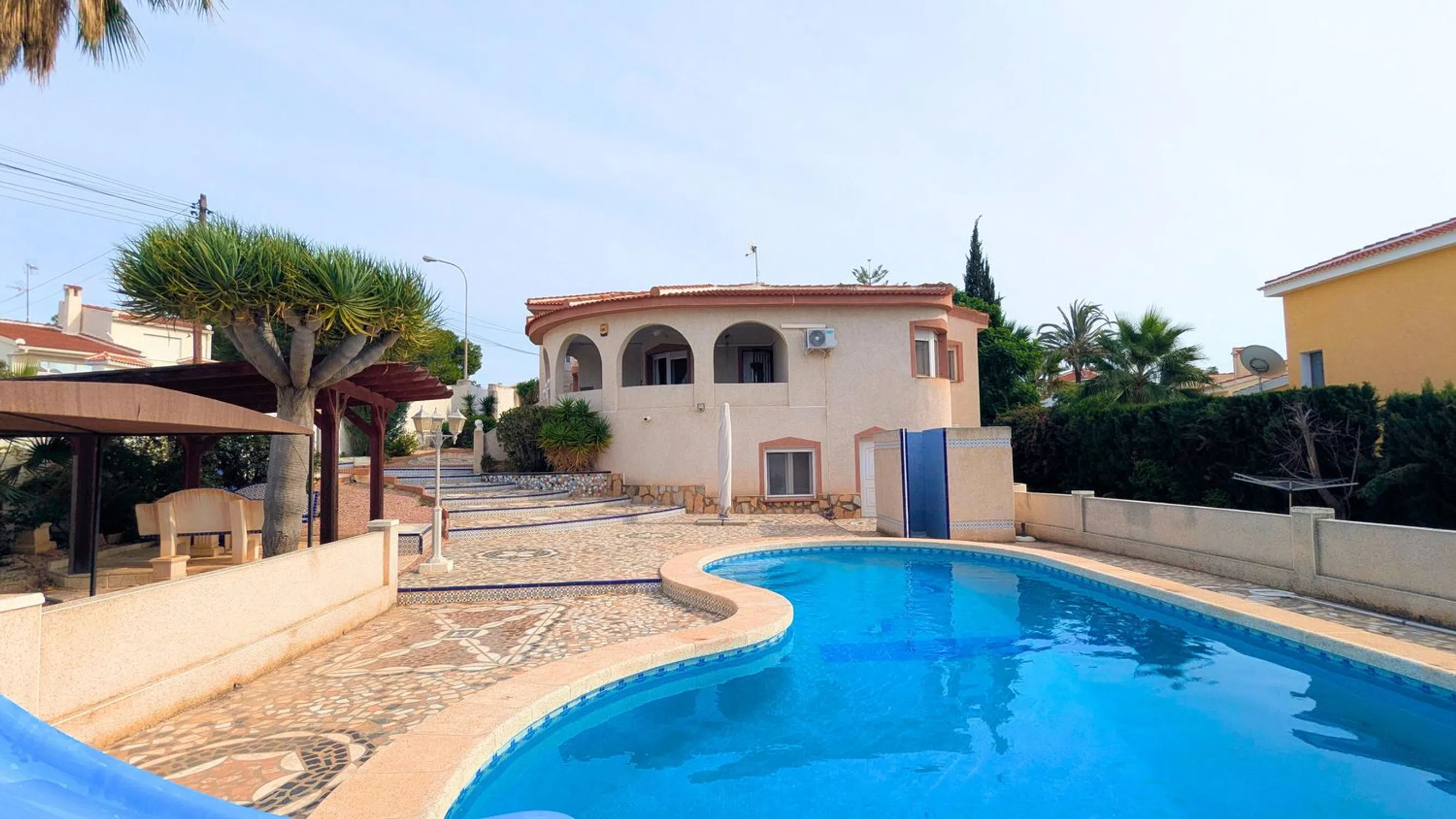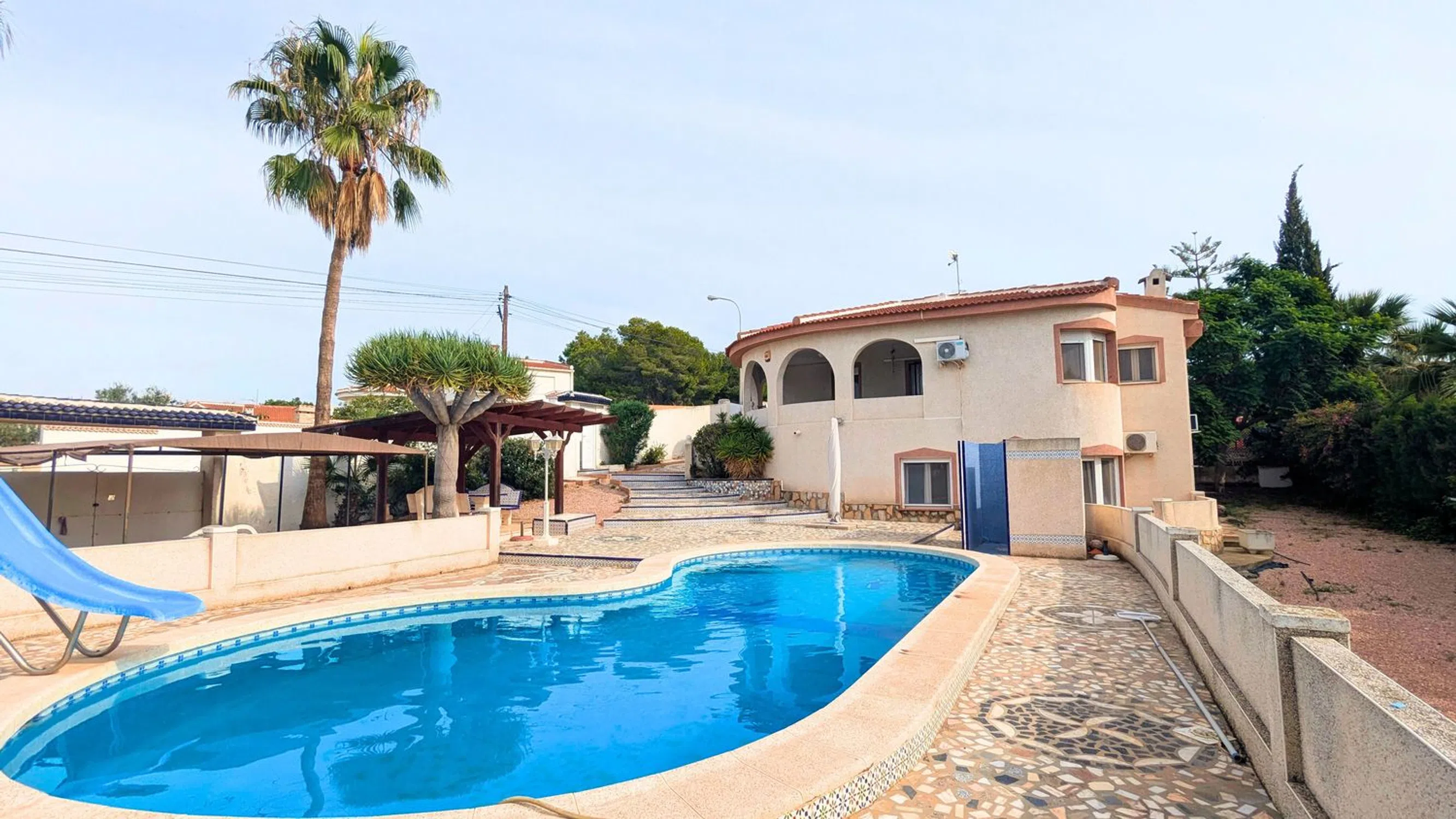 Presentamos esta espaciosa villa independiente en la popular zona de Ciudad Quesada: una casa encantadora y bien establecida que ofrece espacio excepcional, comodidad y vida mediterránea. Construida en 1989, esta impresionante propiedad se asienta sobre una amplia parcela de 1.075 m² y cuenta con una superficie construida de 245 m², lo que proporciona un amplio espacio interior y exterior. La villa cuenta con 5 dormitorios y 3 baños, lo que la convierte en una opción ideal para familias numerosas, para recibir invitados o para crear un cómodo refugio vacacional. La propiedad incluye aire acondicionado en toda la vivienda, lo que garantiza comodidad durante todo el año, y ofrece múltiples terrazas y zonas abiertas para disfrutar del soleado clima de la Costa Blanca. En el exterior, encontrará una piscina privada rodeada de jardines maduros y zonas de descanso, perfectas para relajarse o entretenerse. Una cochera ofrece un cómodo aparcamiento cubierto en la parcela. Ubicada cerca del campo de golf La Marquesa, esta villa goza de una ubicación tranquila y a la vez está cerca de todos los servicios, como restaurantes, tiendas, supermercados y centros médicos. Las hermosas playas de Guardamar y Torrevieja están a poca distancia en coche. Con un precio de 425.000 €, esta propiedad representa una maravillosa oportunidad de poseer una villa grande y bien ubicada con un potencial infinito en una de las zonas más deseables de la Costa Blanca.