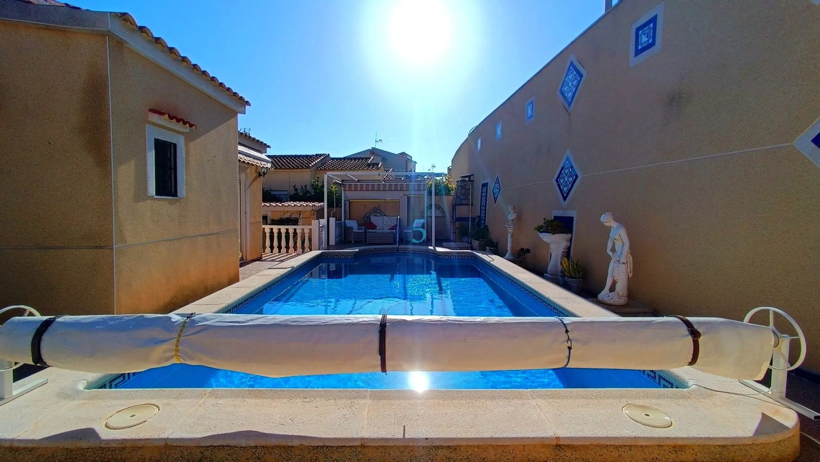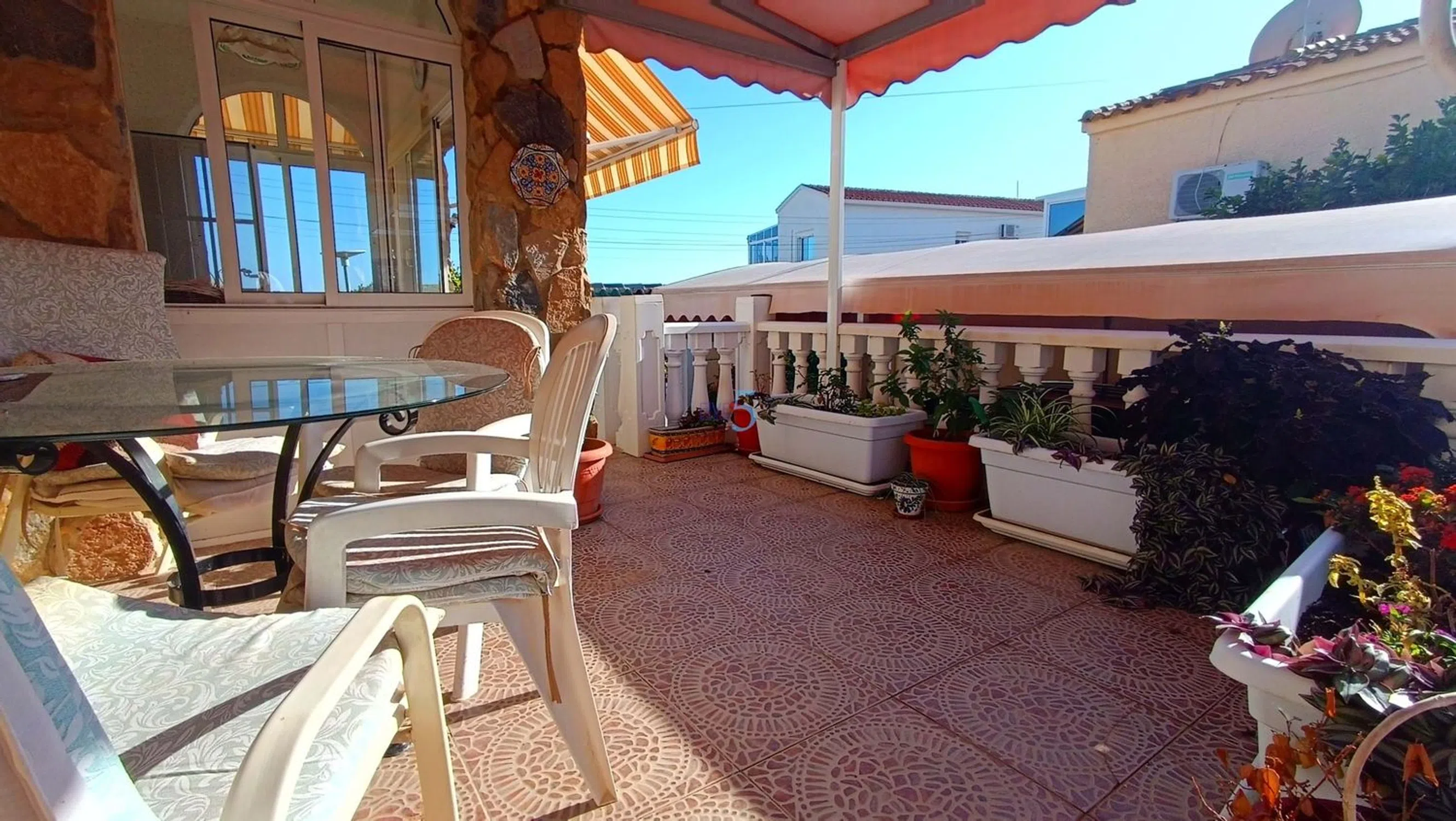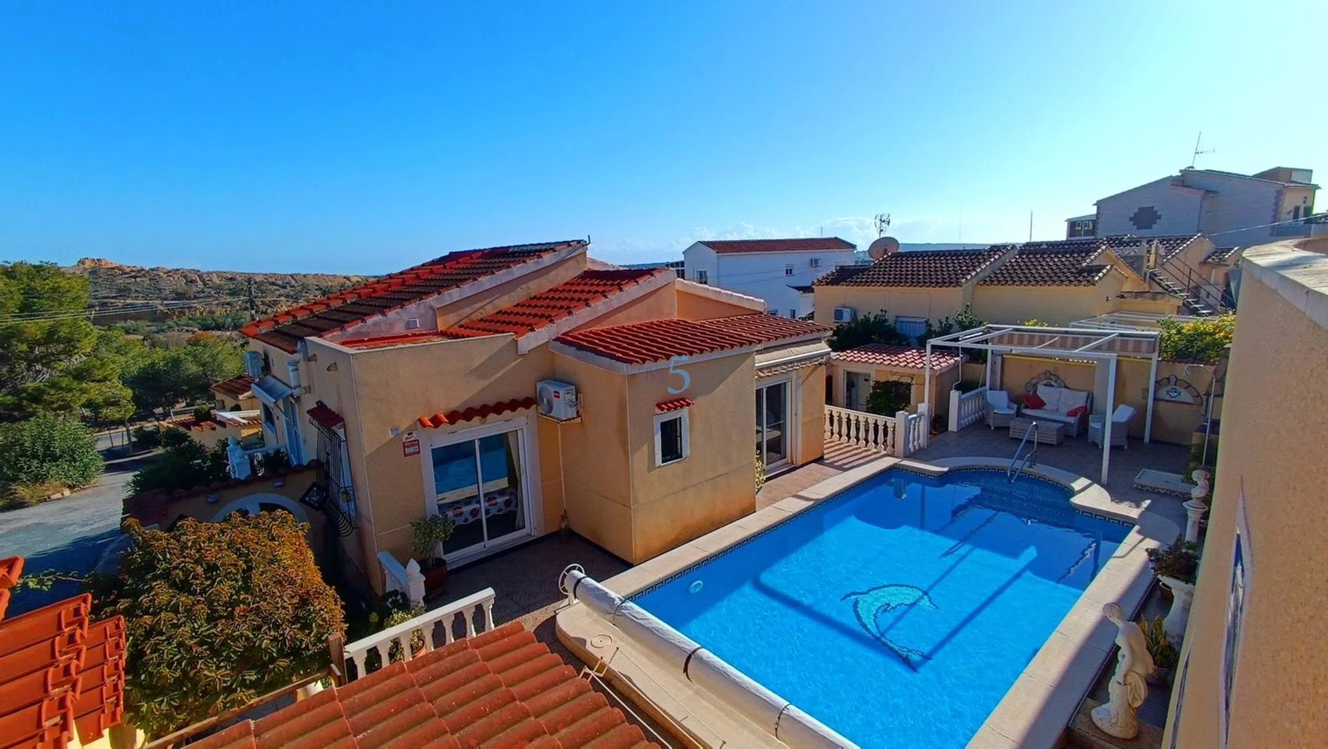Nos complace presentar esta espaciosa villa independiente de 3 dormitorios en una parcela privada en la esquina con piscina, vistas al mar y al campo, ¡urbanización de La Marina! Situada en una generosa parcela en la esquina dentro de la popular urbanización de La Marina, esta villa independiente de 3 dormitorios y 2 baños, bien presentada, ofrece total privacidad, un excelente espacio exterior y vistas impresionantes del campo circundante e incluso del mar. La propiedad cuenta con dos entradas separadas. Una ofrece acceso directo a la cocina, ideal para descargar la compra, mientras que la entrada principal es a través de portones para vehículos que conducen a un garaje de coches. Jardines maduros rodean la villa, guiándote hasta un primer almacén, que podría convertirse fácilmente en una barbacoa o zona de entretenimiento si se desea. El jardín continúa hasta la impresionante zona privada de la piscina, que cuenta con una gran piscina, amplios asientos y espacio para tomar el sol, y un segundo almacén, perfecto para equipamiento de piscina o almacenamiento adicional. En la parte delantera de la propiedad hay una terraza elevada, parcialmente abierta y parcialmente cerrada con cristal, que ofrece un uso flexible durante todo el año según el clima. La puerta principal da a un amplio salón, con una gran ventana que ofrece las hermosas vistas y un toldo eléctrico. Desde el salón se accede a uno de los dormitorios, así como a una cocina moderna con un cómodo cuarto de servicio. Un pasillo que sale del salón conduce a otros dos dormitorios excepcionalmente grandes, ambos con armarios empotrados y acceso directo a la zona de la piscina. El dormitorio principal cuenta con un baño en suite, mientras que una ducha familiar sirve a los dormitorios restantes. Se puede encontrar almacenamiento adicional bajo la terraza delantera. Presentada en excelente estado y situada en una zona muy codiciada, esta villa se está vendiendo parcialmente amueblada y ofrece una excelente oportunidad como residencia permanente o refugio vacacional. 5 Real Estate es la agencia inmobiliaria internacional de servicio completo y tarifa fija de más rápido crecimiento en España, con numerosas oficinas en el norte y sur de Costa Blanca, así como en la región de Murcia. Estamos comprometidos a ofrecer un servicio transparente y de primera clase a todos nuestros clientes, ya sean compradores o vendedores. Desde el momento en que nos contactes por primera vez te darás cuenta de la diferencia que ofrecemos y promovemos como estándar. Puedes estar seguro de que tratas con profesionales eficientes y fiables con muchos años de experiencia en bienes raíces españoles. En 5 Real Estate solo vendemos propiedades que están directamente listadas a nuestro nombre, lo que significa que conocemos personalmente a cada uno de los vendedores, sus casas y las zonas donde se encuentran. Dado nuestro extenso portafolio de propiedades cotizadas directamente, nos sentimos seguros de que podemos encontrar la propiedad adecuada para tus necesidades. Así que, haz una consulta hoy mismo y descubre por qué somos tan diferentes y por qué nos estamos convirtiendo en el agente preferido tanto para compradores como para proveedores.
