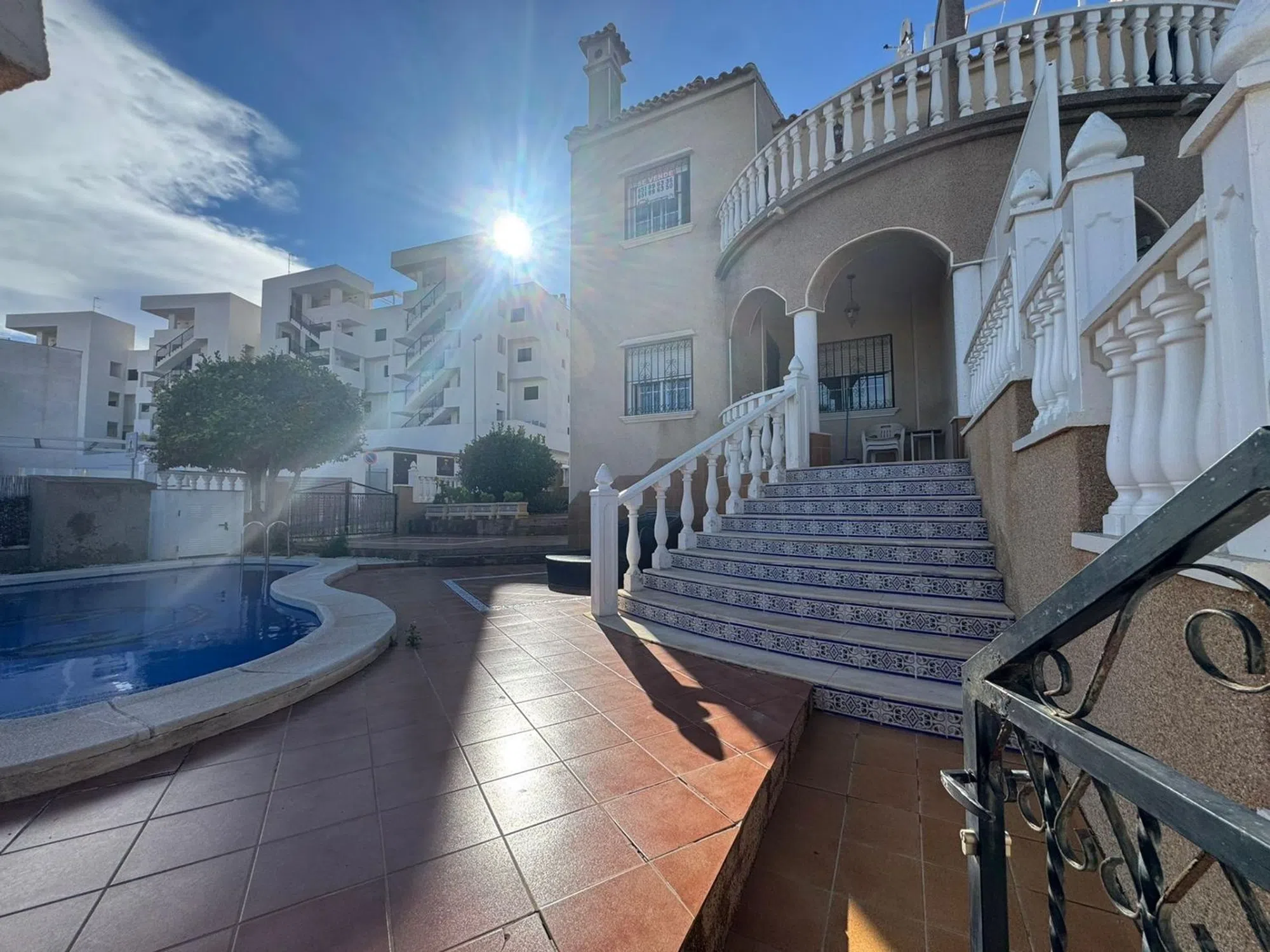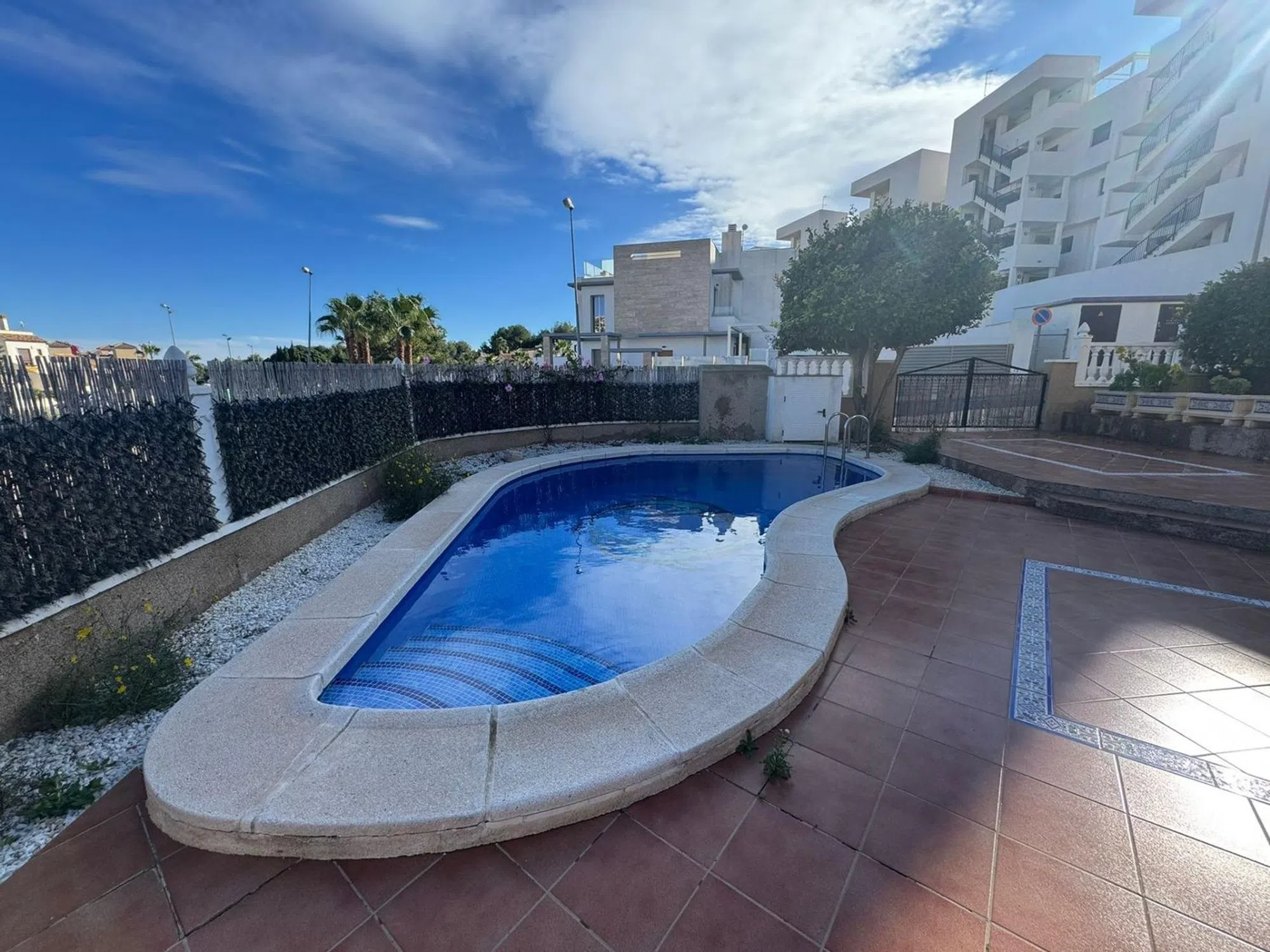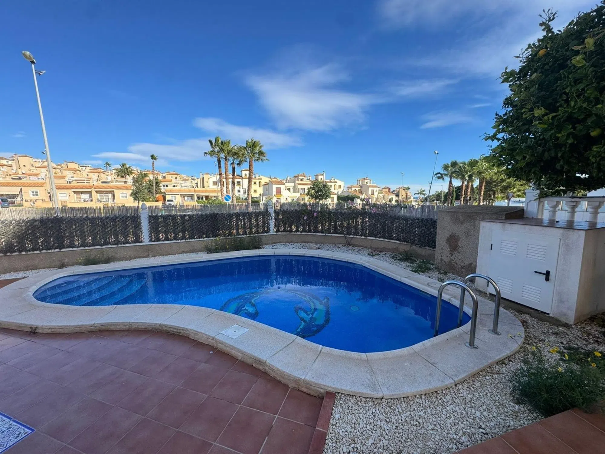Descubre esta magnífica propiedad ubicada en la tranquila urbanización de Blue Lagoon, Orihuela Costa. Con un atractivo precio de venta de 240,000 euros, este quad cuenta con una superficie construida de 105 m2 y útil de 98 m2. La vivienda se encuentra en buen estado y ofrece tres amplias habitaciones todas con armarios empotrados y dos baños completos. Su orientación noreste garantiza luminosidad durante el día. Situada a tan solo 3000 metros del mar Mediterráneo, disfrutarás no solo del agradable clima sino también proximidad a servicios esenciales como supermercados, bares y restaurantes locales. Además, estarás cerca del renombrado campo de golf Campoamor-Villamartín; así como a menos diez minutos las espectaculares playas de Orihuela Costa y el famoso centro comercial Zenia Boulevard. La casa destaca por su amplio jardín al ser esquina e incluye una piscina privada ideal para relajarse bajo el sol casi todo el año. Por si fuera poco: ¡su gran solárium te permitirá contemplar vistas impresionantes hacia los alrededores! Perfecta para familias o quienes buscan calidad vida.