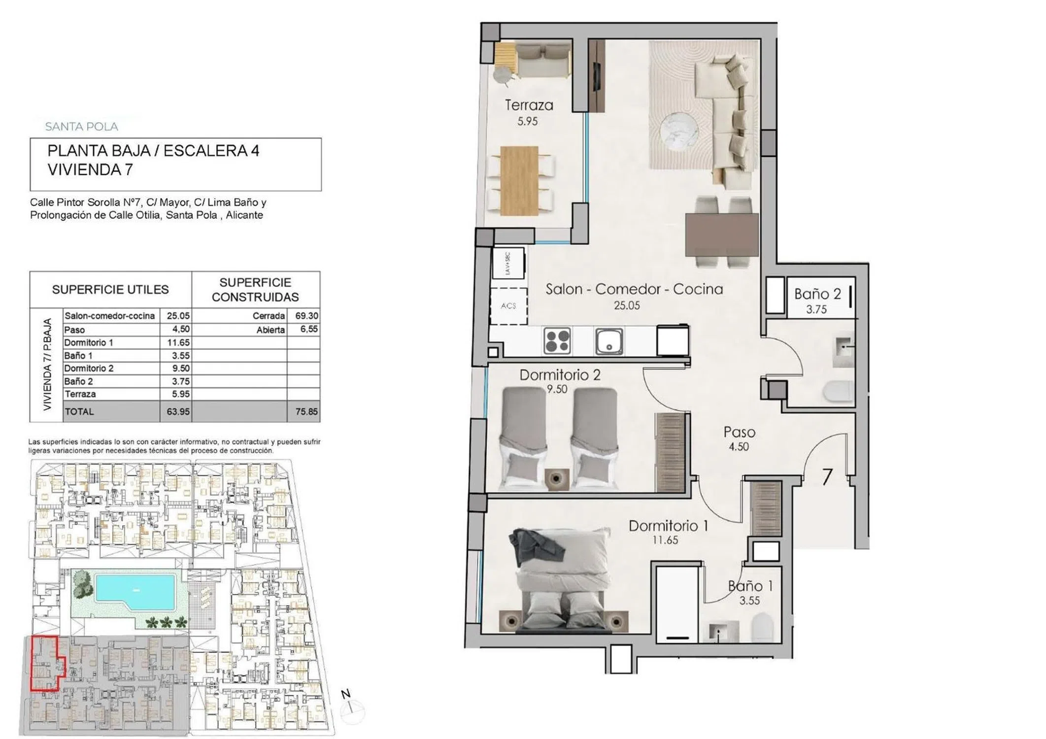 Descubre esta magnífica planta baja ubicada en la codiciada zona de Eroski, en Santa Pola. Con un precio competitivo de 230,000 euros, esta propiedad cuenta con una amplia superficie construida de 75.85 m² y una superficie útil de 63.95 m² que ofrece comodidad y funcionalidad para toda la familia. La distribución incluye dos habitaciones dobles luminosas y dos baños completos bien equipados, uno de ellos en suite. Disfruta del clima mediterráneo desde su terraza privada de 5 m² orientada al oeste, ideal para relajarse tras un largo día. La vivienda se encuentra en perfecto estado e incorpora acabados modernos que garantizan calidad y confort diario; además está dotada con piscina comunitaria perfecta para los días soleados. Existe la posibilidad de adquirir una plaza de garaje y un trastero, lo que aporta mayor comodidad en el día a día. Situación privilegiada a tan solo 1500 metros del mar Mediterráneo permite disfrutar tanto del paisaje como de numerosos servicios cercanos tales como autobuses disponibles que facilitan el desplazamiento por la ciudad así como centros comerciales esenciales y colegios próximos asegurando conveniencia educativa. Cuenta también con vistas agradables hacia zonas verdes infantiles valladas brindando seguridad adicional. Esta es sin duda una oportunidad única no sólo por sus caracterÃsticas sino también por las ventajas que implica vivir cerca del mar. ¡Ven a conocerla!
