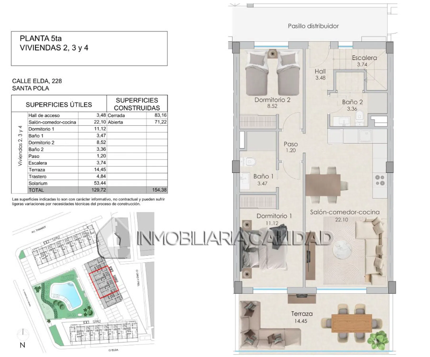 ATICO CON SOLARIUM PRIVADO Y JACUZZI EN SANTA POLA – UNA VIDA DE ALTO NIVEL A SOLO 250 METROS DEL MAR Desde 440.000 € Imagina vivir a tan solo unos pasos del mar, en un ático de obra nueva con solárium privado, jacuzzi, cocina exterior y una urbanización que es un auténtico oasis mediterráneo. Este exclusivo residencial en Santa Pola lo tiene todo para que empieces una nueva etapa con estilo, comodidad y calidad de vida. Este impresionante ático se encuentra en la quinta planta y cuenta con acceso directo a una terraza privada en cubierta, ideal para disfrutar del sol todo el año. El solárium está diseñado para el disfrute: pavimento porcelánico antideslizante, césped artificial, pérgola, cocina exterior, ducha, y un espectacular jacuzzi con estructura reforzada. Todo preparado para vivir momentos únicos sin salir de casa. La vivienda, de 2 o 3 dormitorios, ofrece amplios espacios, acabados de primera calidad y una distribución pensada para el confort. Cocina completamente amueblada, suelos porcelánicos, carpintería lacada en blanco, climatización por conductos y aislamiento térmico y acústico de alta eficiencia. Cada detalle ha sido cuidado para ofrecerte máximo bienestar con el mínimo consumo, incluyendo placas fotovoltaicas individuales para ahorro energético. ZONAS COMUNES QUE INSPIRANEl residencial cuenta con tres bloques y un total de 95 viviendas. Está completame.