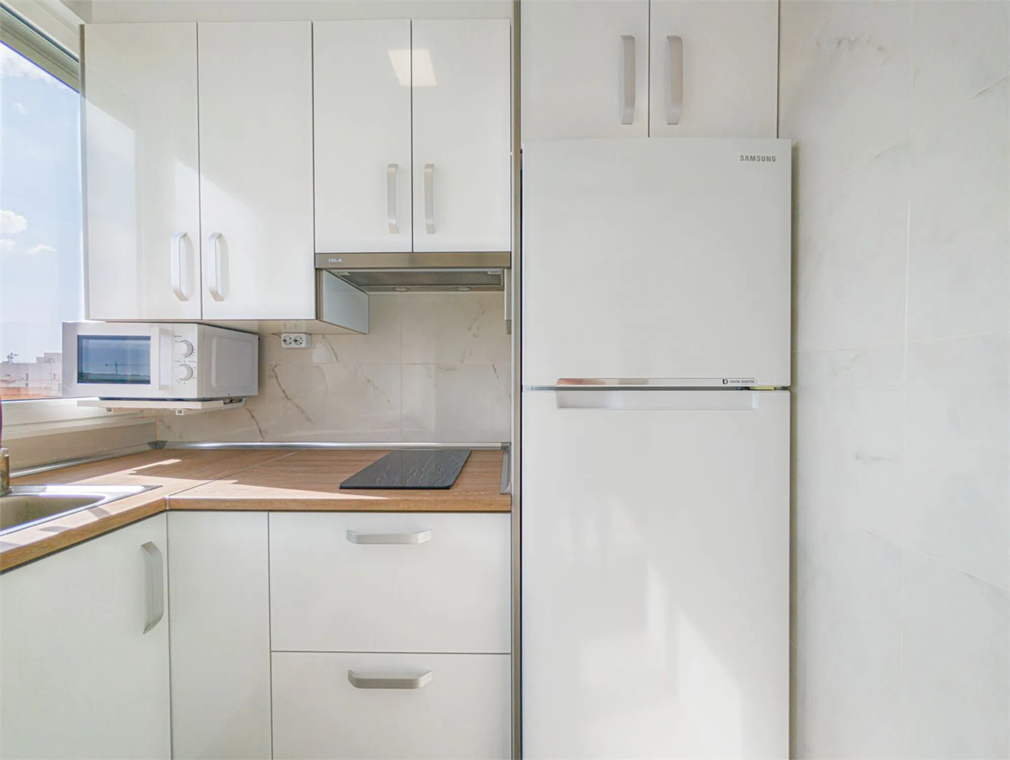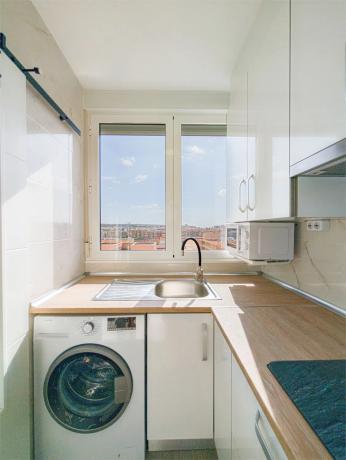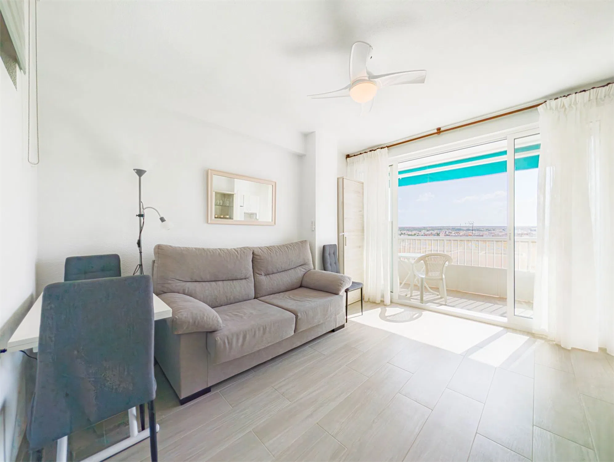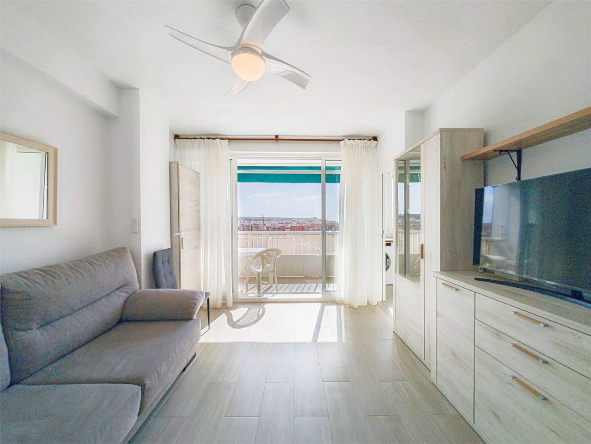Piso reformado con vistas Bienvenido a este piso renovado con mucho gusto, situado en la octava planta de un edificio con ascensor, en pleno corazón de Santa Pola. Vivirás a poca distancia a pie de la playa, tiendas, restaurantes, mercado de abastos, transporte público y todo lo que el animado centro tiene para ofrecer. La vivienda cuenta con una distribución luminosa y funcional, con dos dormitorios, un baño moderno y un salón amplio en concepto abierto con la cocina. Todo el piso es muy luminoso y dispone de ventiladores de techo que proporcionan una brisa agradable en los días más calurosos. El bonito balcón ofrece unas vistas fantásticas sobre los alrededores y los tejados de Santa Pola, ideal para disfrutar del café por la mañana o una cena relajada al atardecer. Es una vivienda perfecta tanto para residencia habitual como para vacaciones, gracias a su excelente ubicación, cercanía al mar y vistas despejadas. LA VIVIENDA Salón Salón luminoso y acogedor con espacio para sofá y zona de comedor. Desde aquí se accede al balcón. Abierto a la cocina y equipado con ventilador de techo. Cocina Situada junto al salón, con mucho espacio de almacenaje. Equipada con frigorífico/congelador, horno, vitrocerámica, microondas, campana extractora y lavadora. Baño Baño moderno y totalmente alicatado, con ducha, lavabo y WC. Dormitorio 1 Dormitorio amplio y luminoso con espacio para una cama doble y armario. Con ventilador de techo. Dormitorio 2 Ideal como habitación de invitados, despacho o dormitorio infantil. Espacio para cama individual o doble pequeña. Con ventilador de techo. Balcón Balcón soleado con vistas agradables – un lugar perfecto para relajarse durante todo el año.