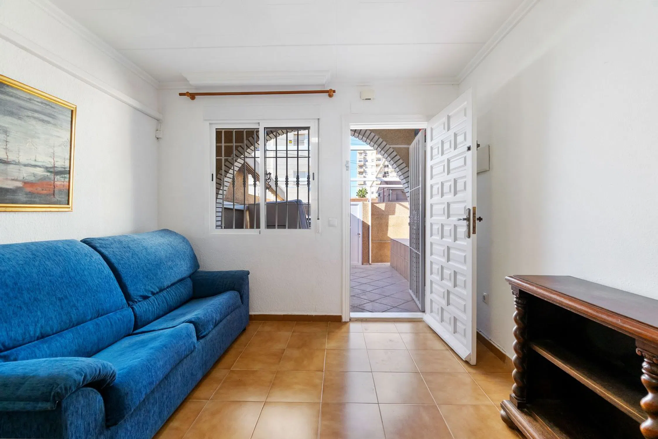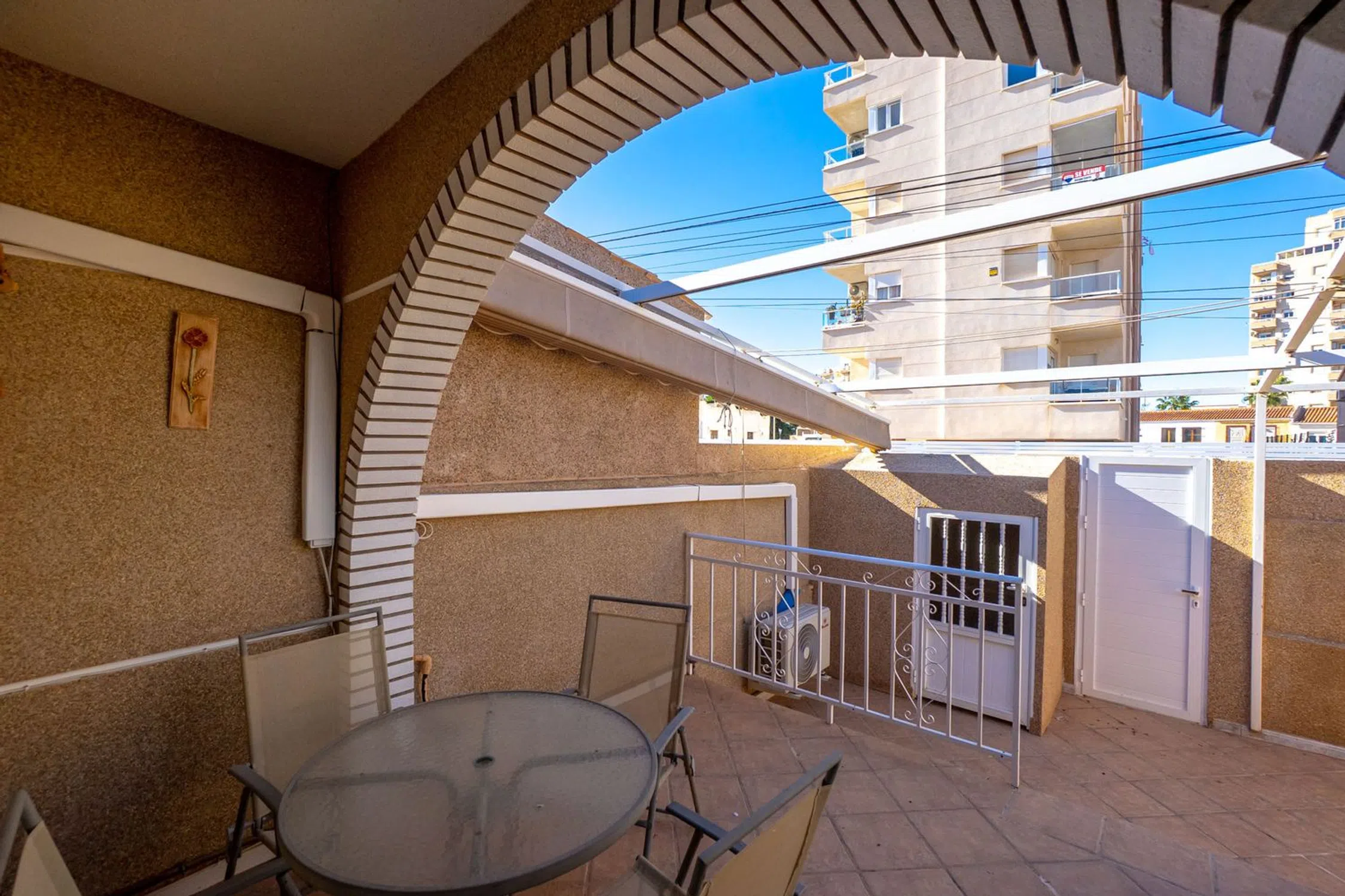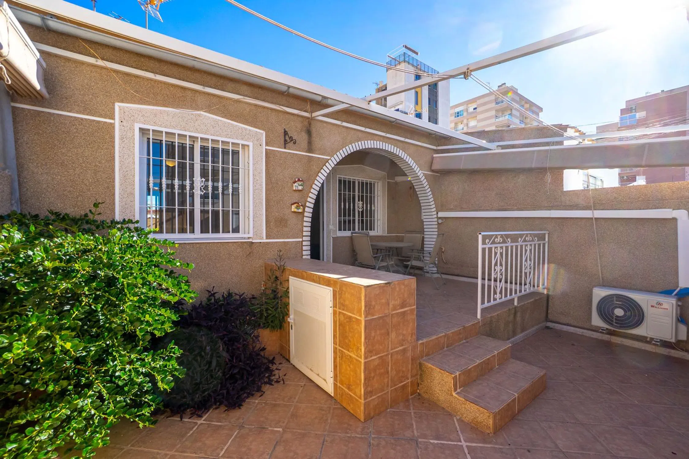 Ahora tienes la oportunidad de adquirir una fantástica casa adosada en la popular zona de Aguas Nuevas, perfecta para residencia permanente o como un oasis vacacional. La vivienda cuenta con dos dormitorios bien distribuidos y un baño elegante y renovado. La cocina, moderna, abierta y renovada, fluye naturalmente hacia el salón y conduce directamente al patio privado en la parte trasera. En la parte delantera, puede disfrutar del sol en el jardín de 26 m² orientado al oeste y soleado. Este es el lugar perfecto para barbacoas por la tarde y relajación. Una práctica pérgola proporciona sombra cuando necesita un descanso del sol español. Además, la vivienda es económica ya que se han instalado paneles solares en el techo para maximizar el aprovechamiento de las horas de sol. La casa adosada tiene una excelente ubicación, a un corto paseo encontrará todos los servicios imaginables, incluyendo tiendas y restaurantes. Tiene una distancia conveniente tanto al centro de Torrevieja como a las playas del Mediterráneo. En las cercanías también hay pistas de pádel y bares acogedores. ¿Está interesado en esta joya? ¡Contáctenos para una visita y más información! Impuesto sobre bienes inmuebles: 107 € / año.