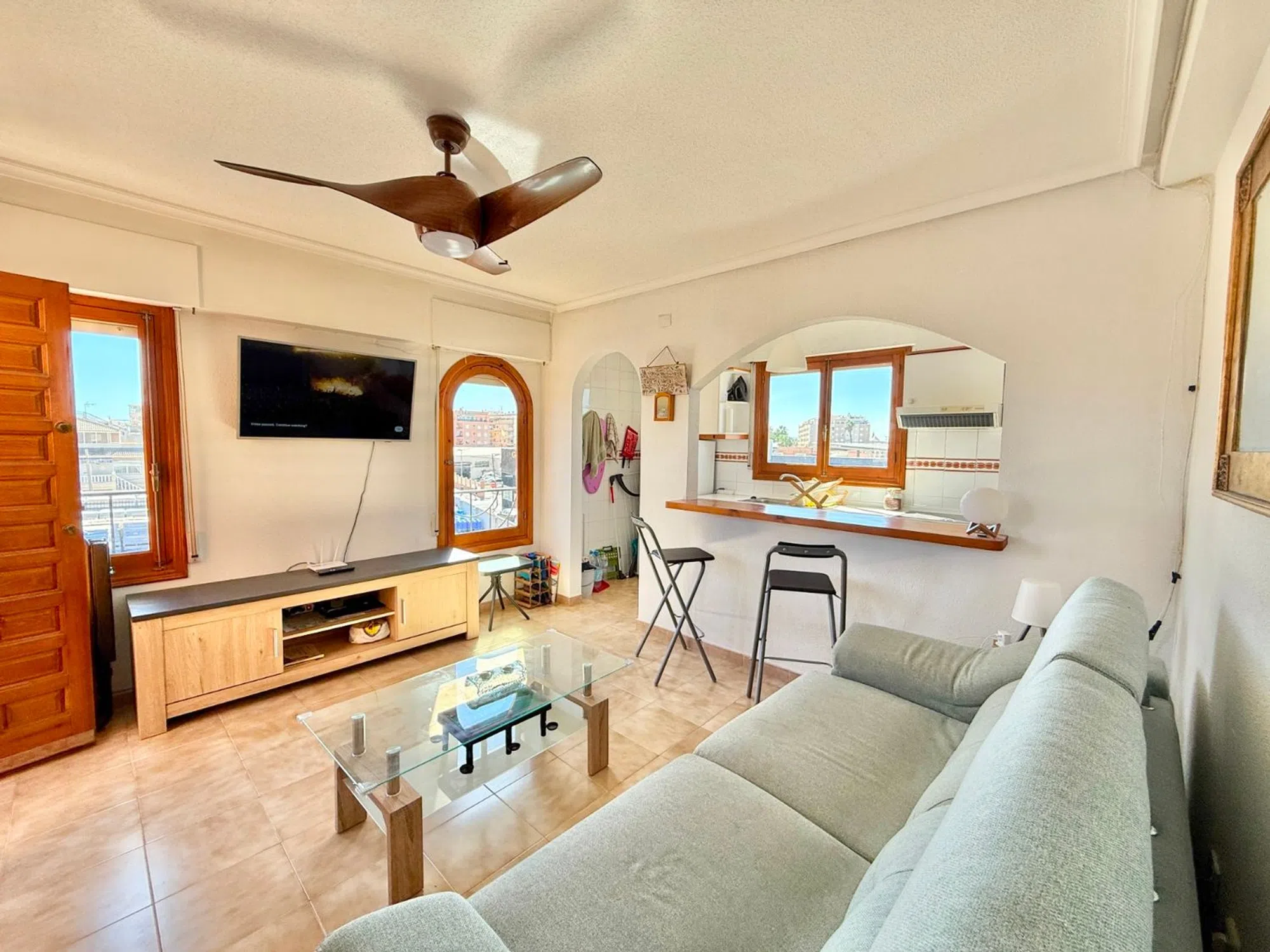 Luminoso apartamento de 1 dormitorio y 1 baño con vistas despejadas. Aire acondicionado en el salón. Cocina con lavadora, frigorífico, vitrocerámica y horno. Balcón con sol de mañana y de tarde. Ático - 2. ª planta. Piscina comunitaria. Gastos de comunidad: 550 euros al año. IBI: 100 euros al año. Playa del Cura: a 1 km a pie. Supermercado Aldi y tiendas/restaurantes a menos de 250 m. Nueva Torrevieja es una zona residencial consolidada situada al norte del centro de Torrevieja, en la Costa Blanca. Ofrece un entorno tranquilo, pero cerca de las playas, centros comerciales y todos los servicios necesarios. La zona cuenta con una mezcla de apartamentos, adosados y villas, atrayendo tanto a residentes locales como internacionales. Es popular por sus buenas conexiones de transporte, parques cercanos y centros médicos. Ideal para vivir todo el año o como base vacacional, con supermercados y restaurantes a poca distancia. Combina comodidad y tranquilidad, siendo una de las zonas más prácticas y demandadas de Torrevieja.