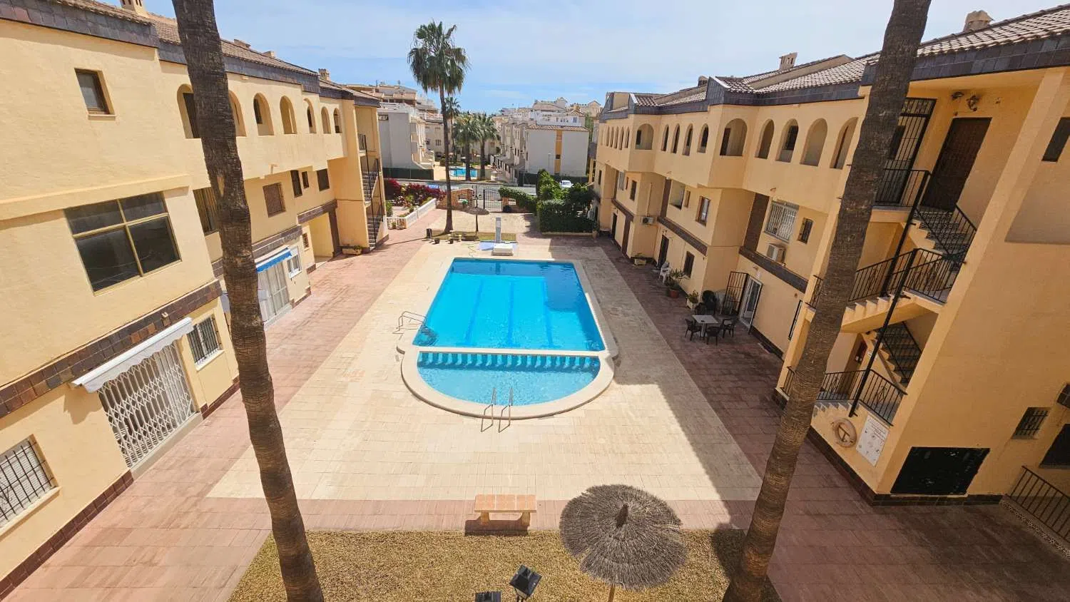 El bungalow cuenta con un balcón de 10m2, ideal para relajarse y disfrutar de las vistas a la piscina. Ofrece 2 acogedores dormitorios y 2 baños, lo que lo convierte en un espacio perfecto para familias o grupos de amigos.