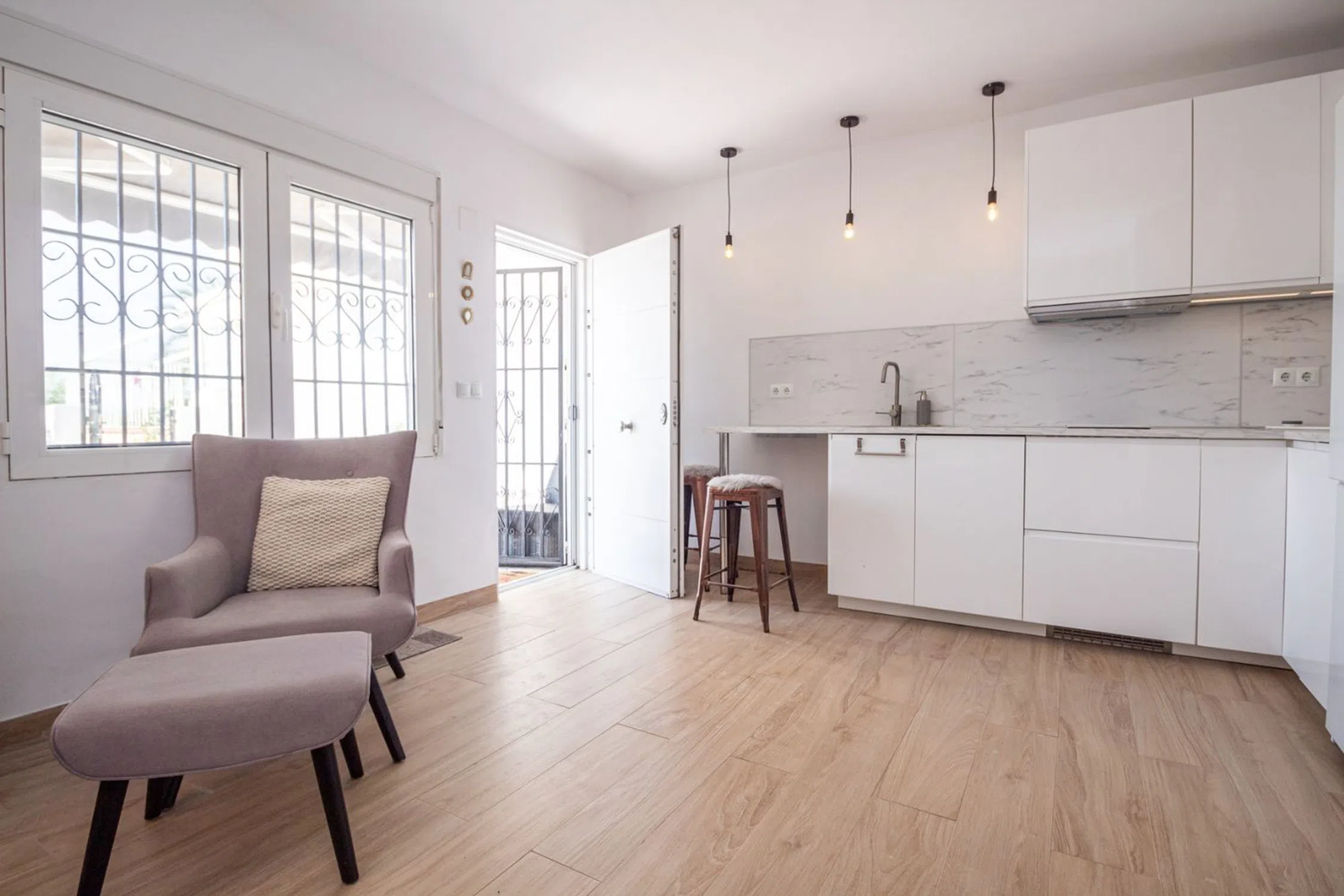 Moderno y totalmente reformado, este bungalow tradicional se sitúa en una zona tranquila a las afueras de Torrevieja. La vivienda, toda en una sola planta, ofrece 2 dormitorios dobles con armarios empotrados, un baño moderno con ducha, una impecable cocina abierta con amplio almacenamiento y espacio de encimera, y un luminoso salón-comedor de concepto abierto con suelo nuevo en toda la vivienda. La propiedad cuenta con un soleado jardín orientado al sur que presume de vistas despejadas a las salinas y a la vegetación local. Se vende completamente amueblada y lista para entrar a vivir, con reformas de calidad y excelentes acabados. A poca distancia a pie de todos los servicios, de las impresionantes salinas y a solo 5 minutos en coche del puerto y las playas de Torrevieja.