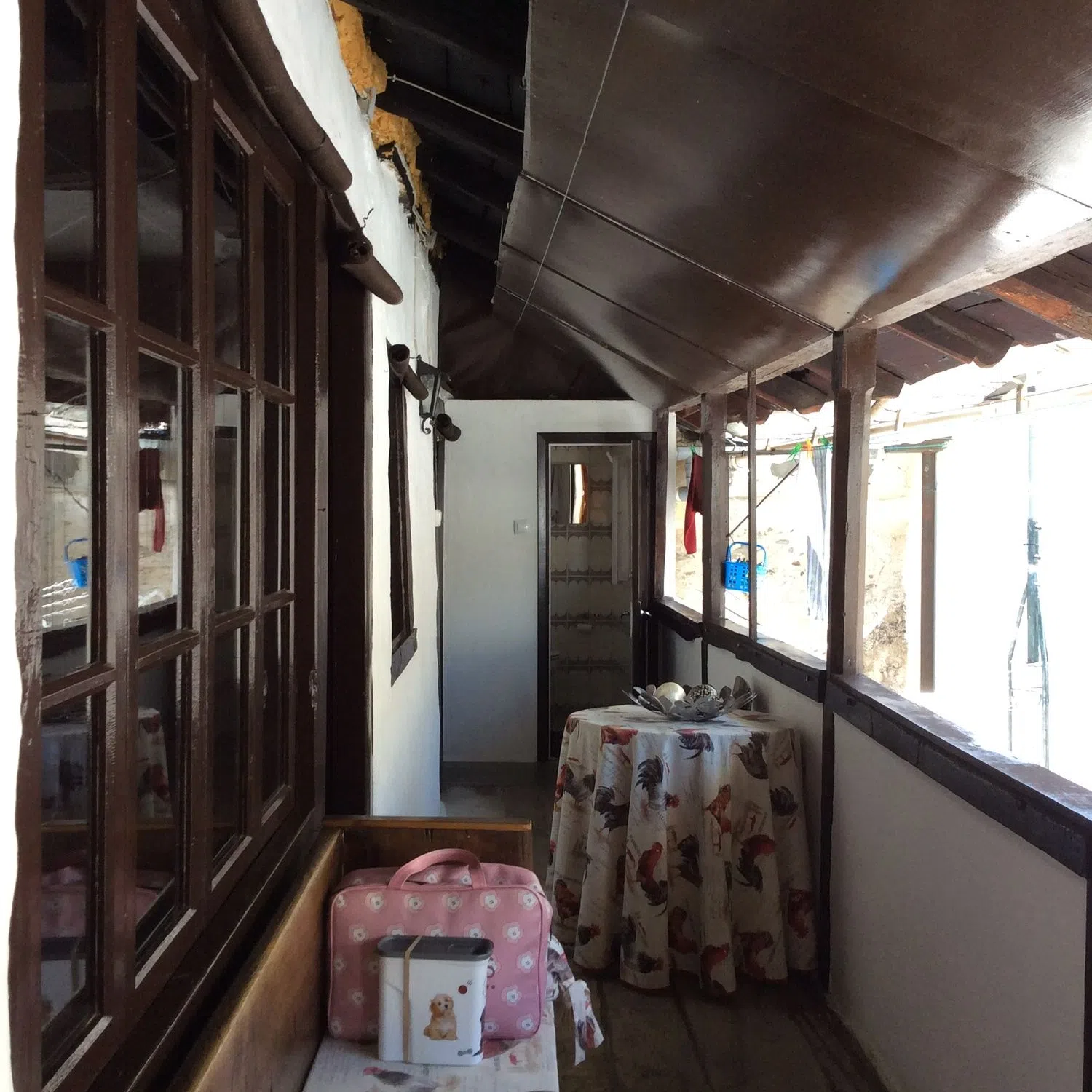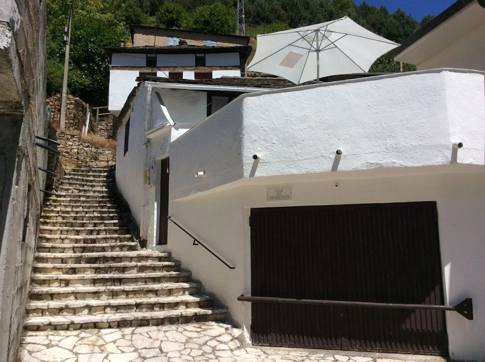 Casa rústica de dos plantas. La planta inferior tiene un garaje (para dos coches de buen tamaño), dos cuadras y una bodega. La planta superior, destinada propiamente a vivienda, se distribuye del siguiente modo: dos cocinas, un salón-comedor, una gran terraza, un pasillo/corredor que da a la terraza, tres habitaciones, un baño completo y un aseo.